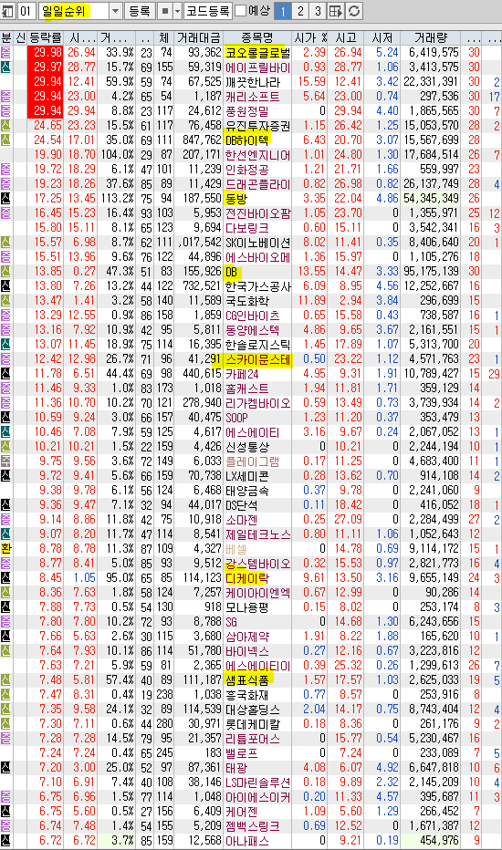 16. DB (13.85%) : DB그룹주, 시총3000억대, 지주사업, 자회사 DB하이텍의 테슬라향 반도체 파운드리 업체로 선정 소식에 따른 동반 부각