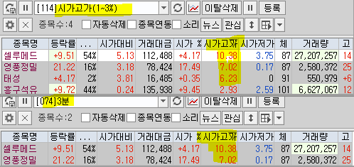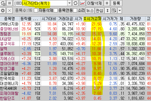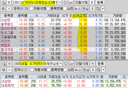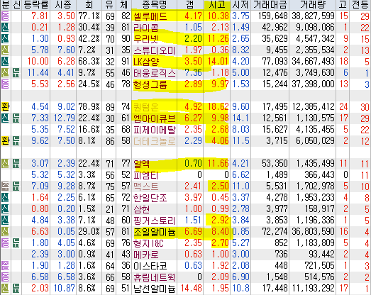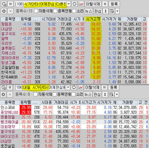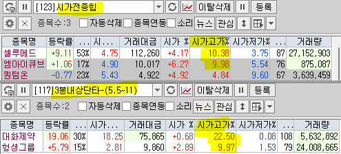| 시가단타(1~3%) : 셀루메드, 라이콤, 우리넷, 스튜디오미르, LK삼양, 태웅로직스, 헝셩그룹 ++ 퀀텀온, 엠아이큐브솔루션, 피제이메탈, 더테크놀로지 + 알맥, 피엠티, 맥스트, 한일단조, 삼현, 핑거스토리, 조일알미늄, 형지I&C, 메카로, 이스타코, 휴림네트웍스, 남선알미늄 | |