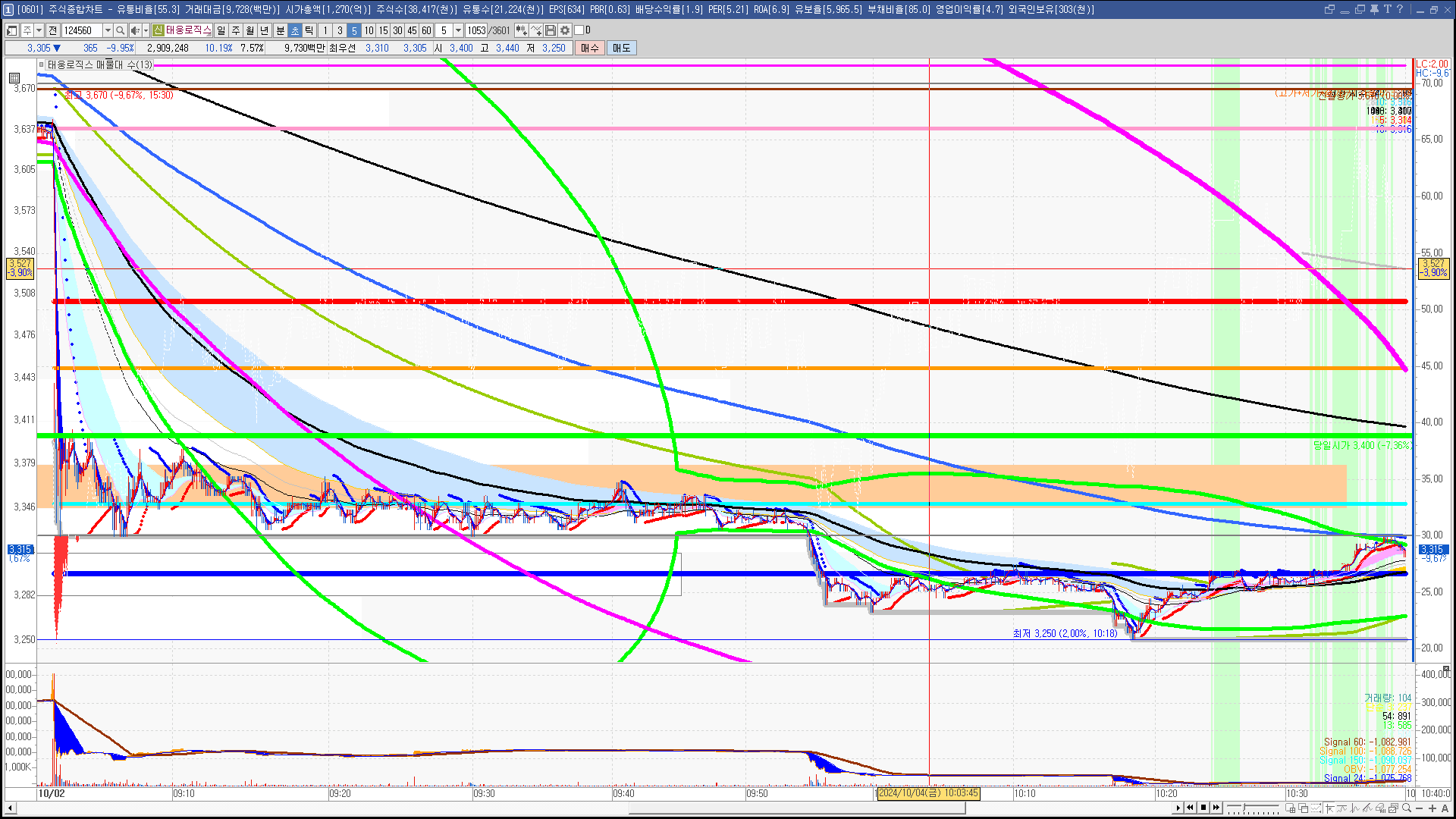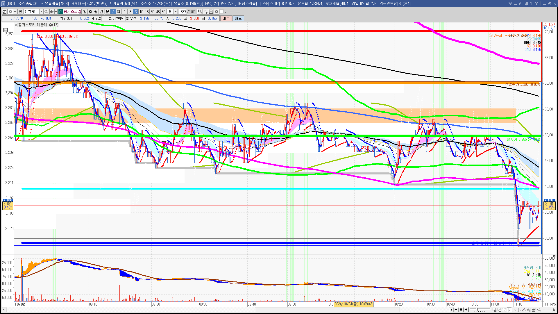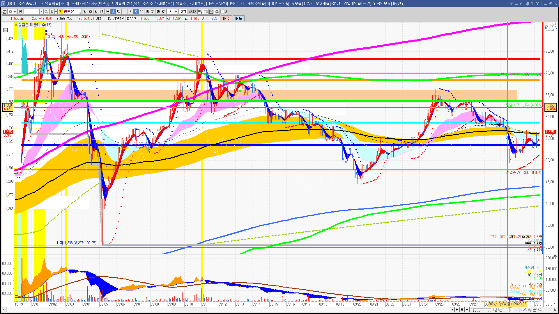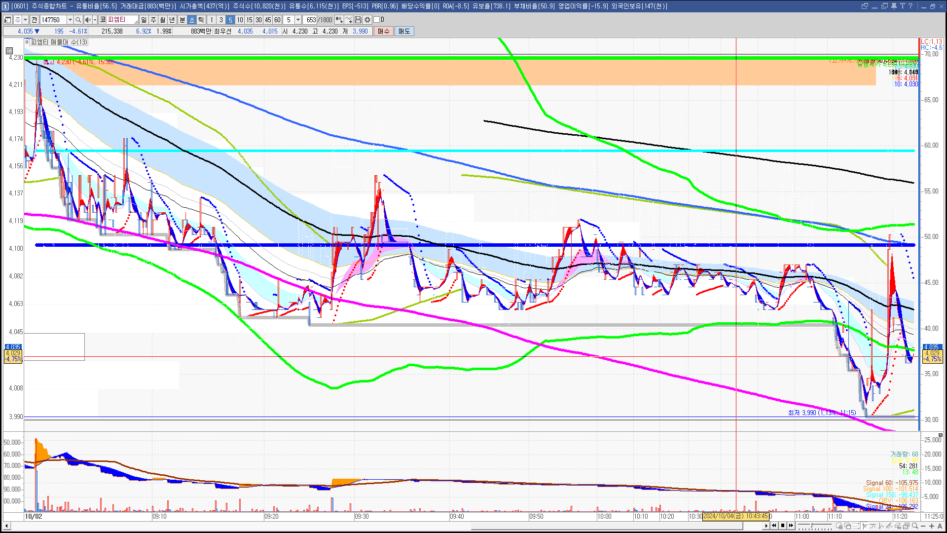 | 빨강 3% | 주황 1.5% | 녹색 시가 | 옥색 -1.5% | 파랑 -3% | 회색 저가 | 갈색 전일종가 | 장미7% | 분홍8% | 보라 10% |