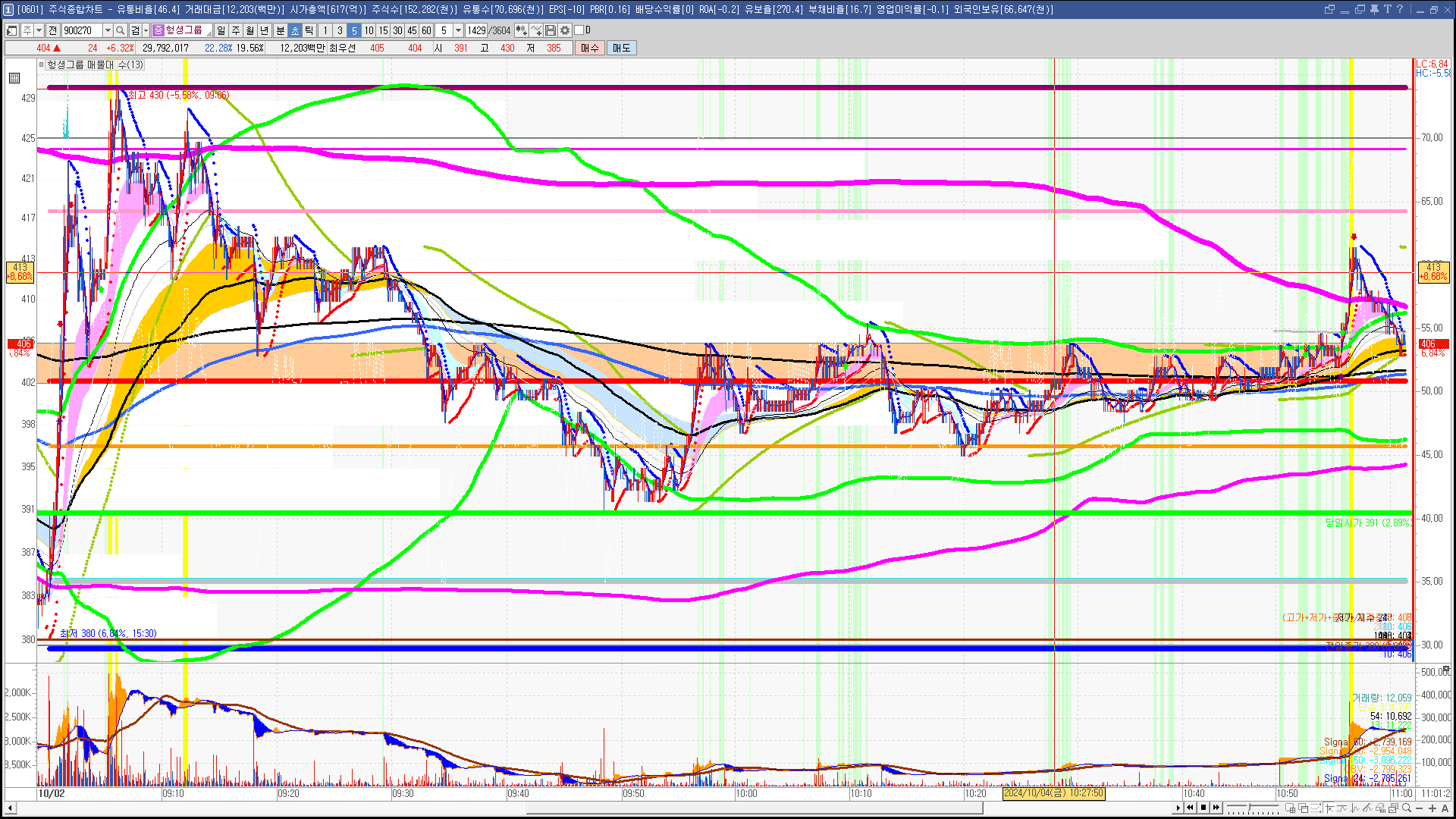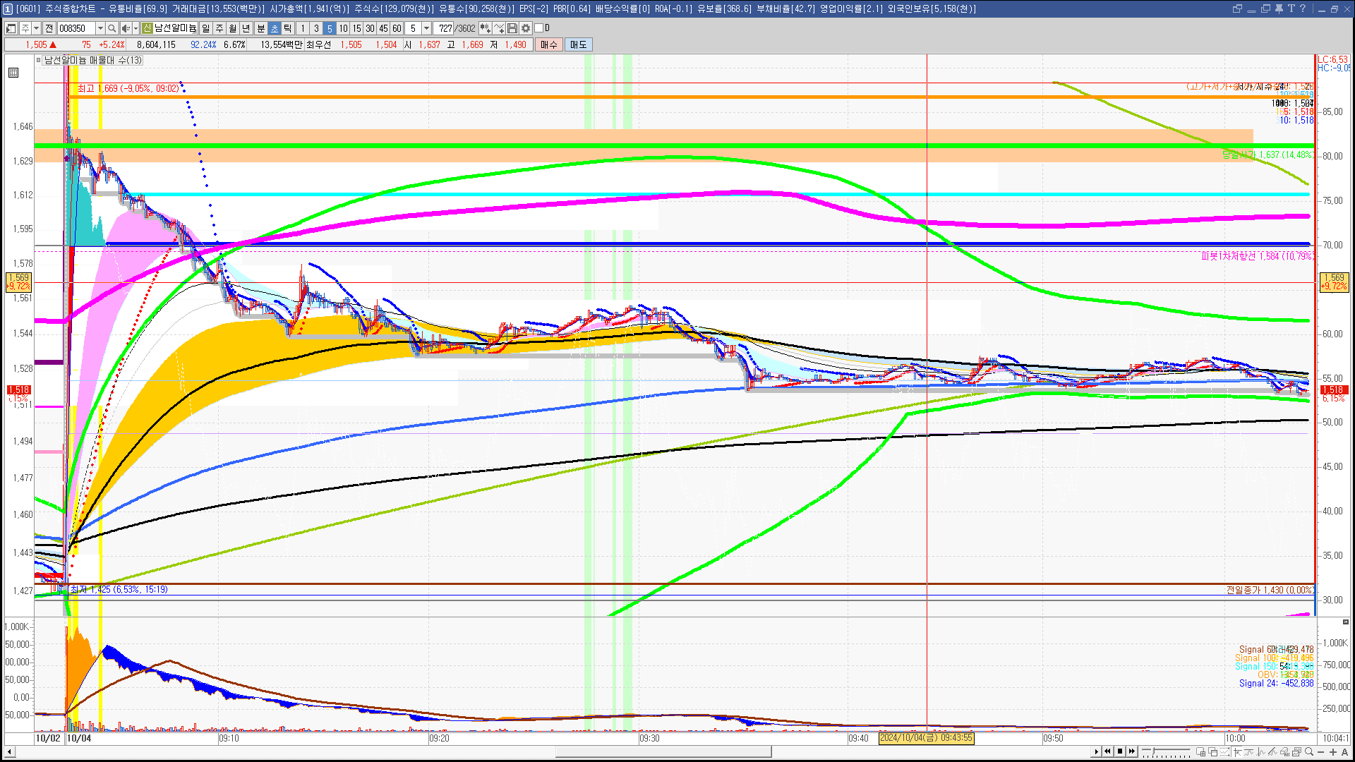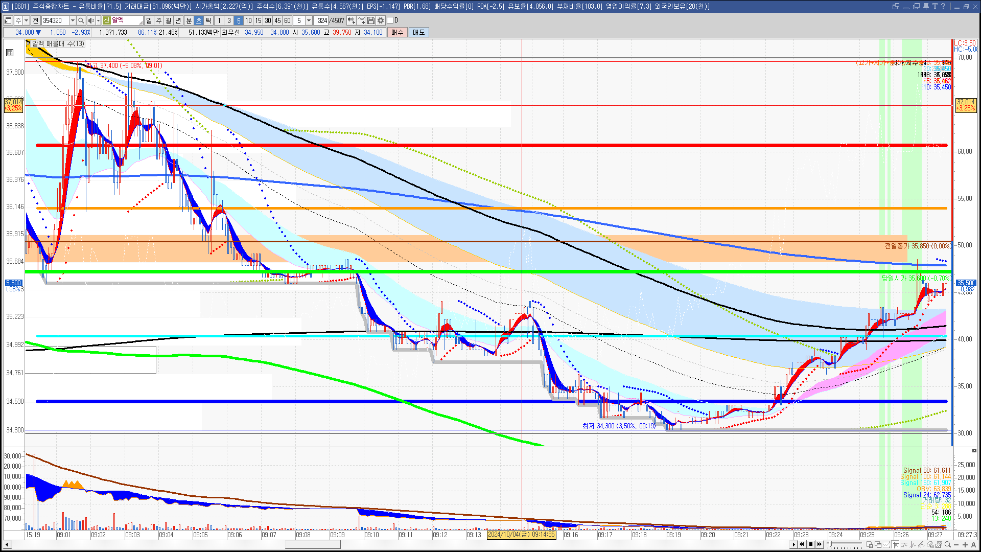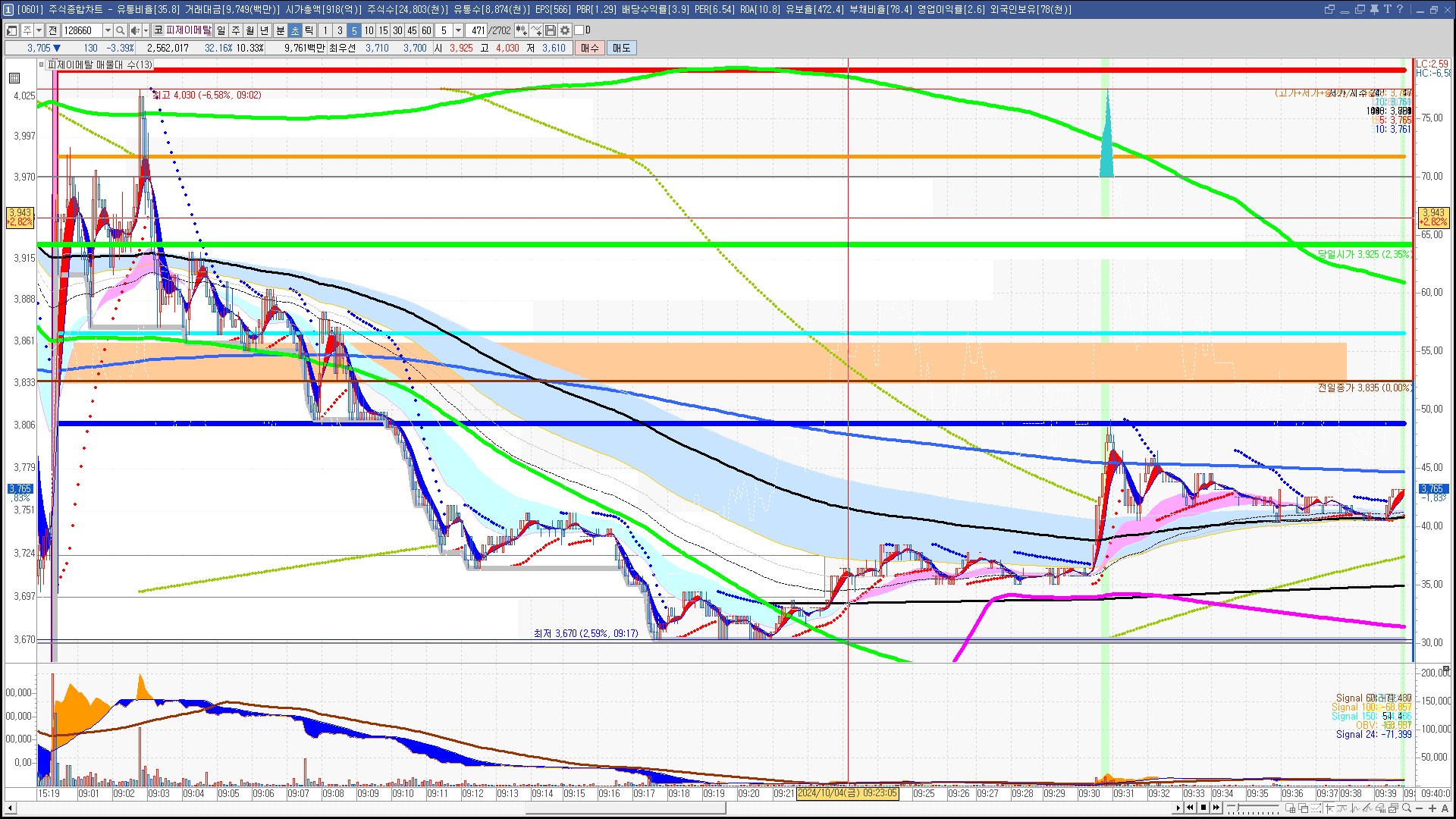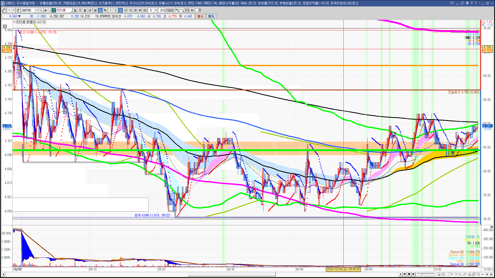 | 빨강 3% | 주황 1.5% | 녹색 시가 | 옥색 -1.5% | 파랑 -3% | 회색 저가 | 갈색 전일종가 | 장미7% | 분홍8% | 보라 10% |