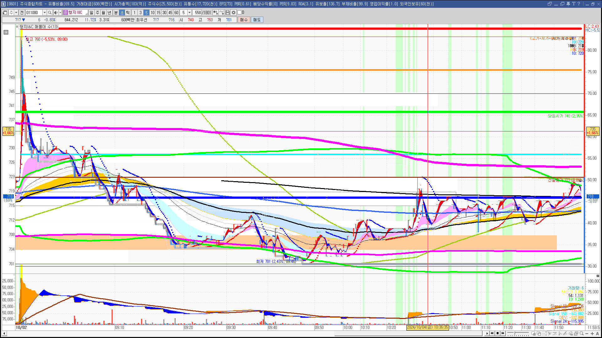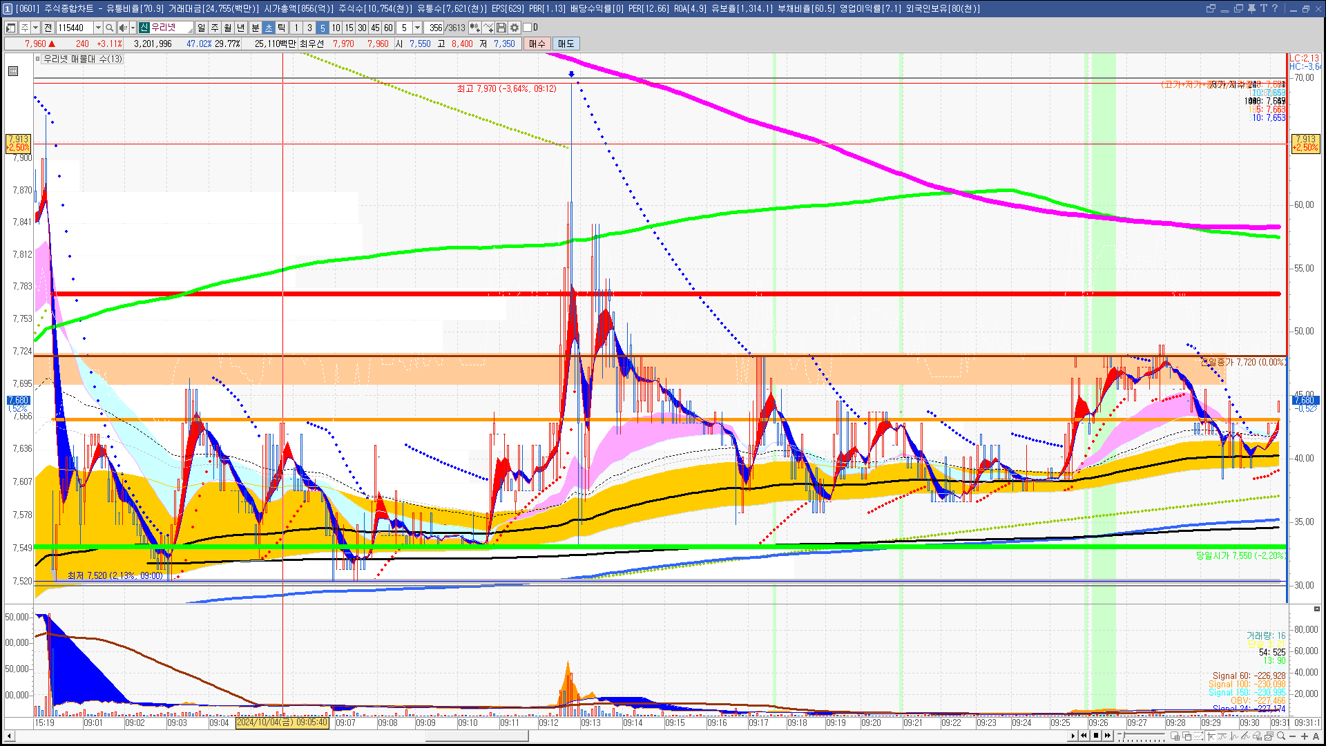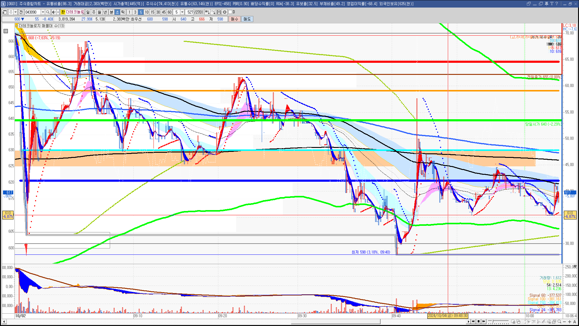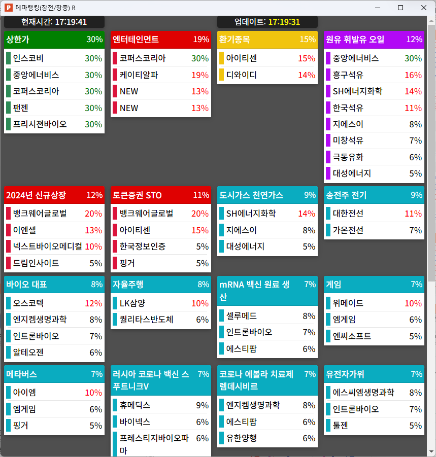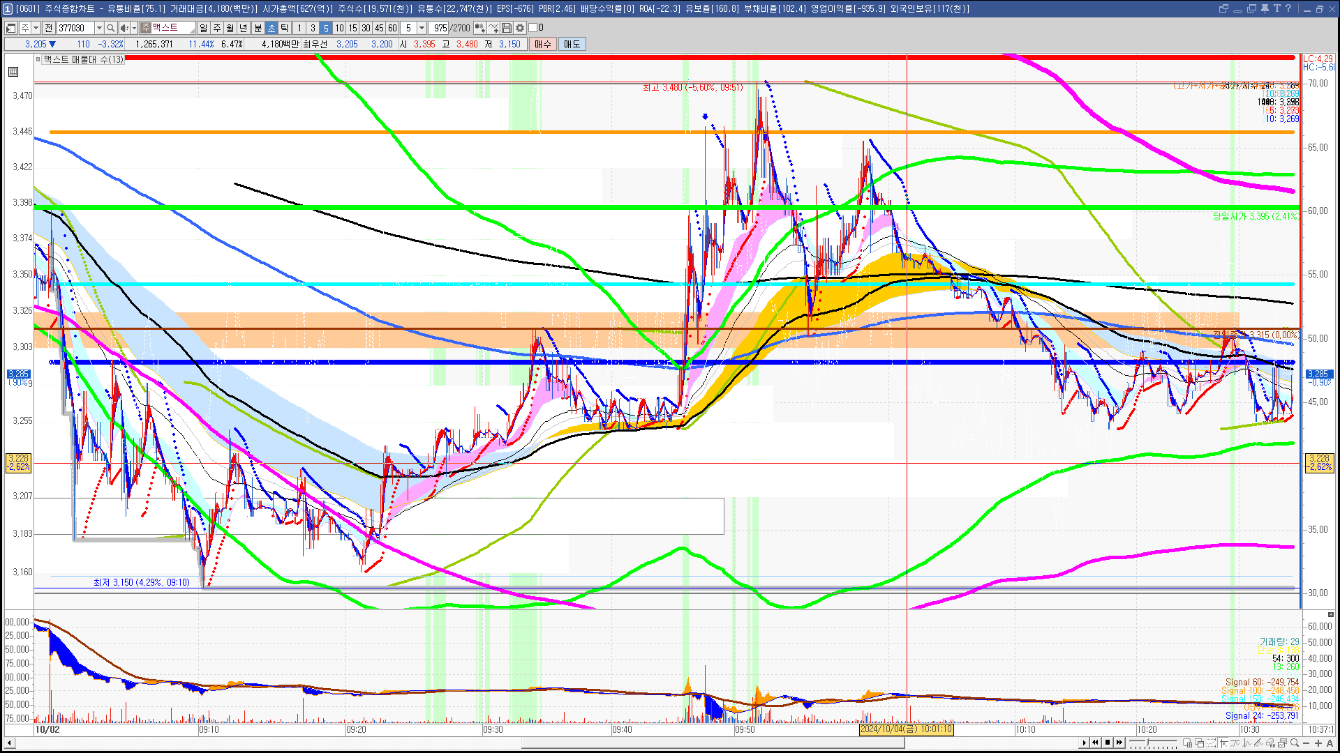 | 빨강 3% | 주황 1.5% | 녹색 시가 | 옥색 -1.5% | 파랑 -3% | 회색 저가 | 갈색 전일종가 | 장미7% | 분홍8% | 보라 10% |