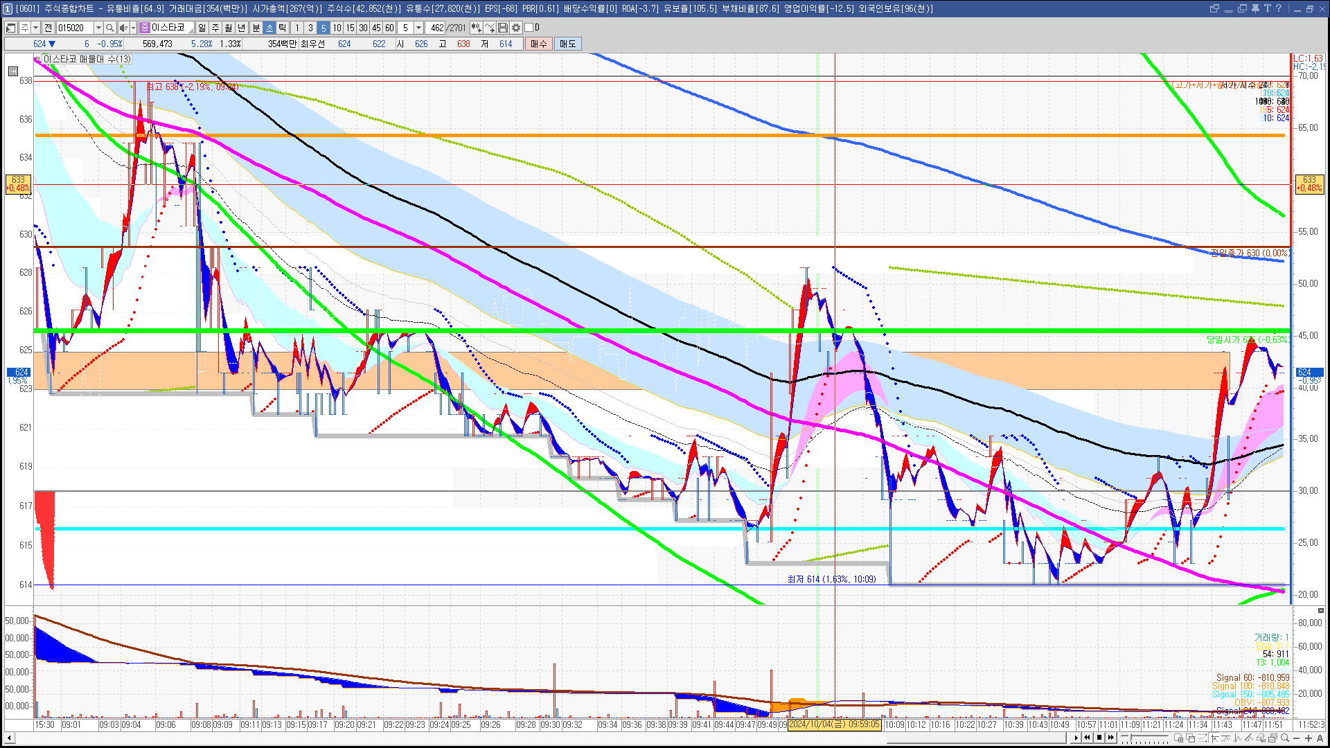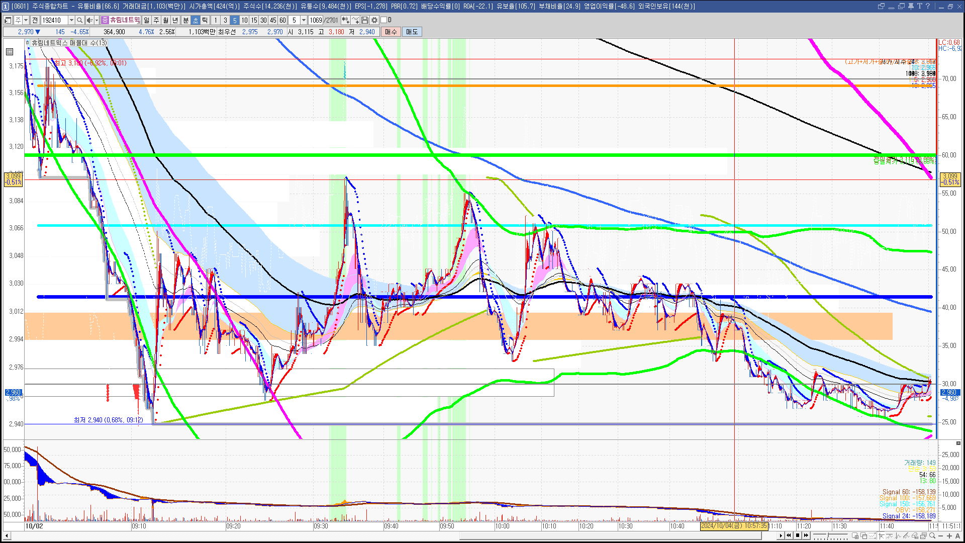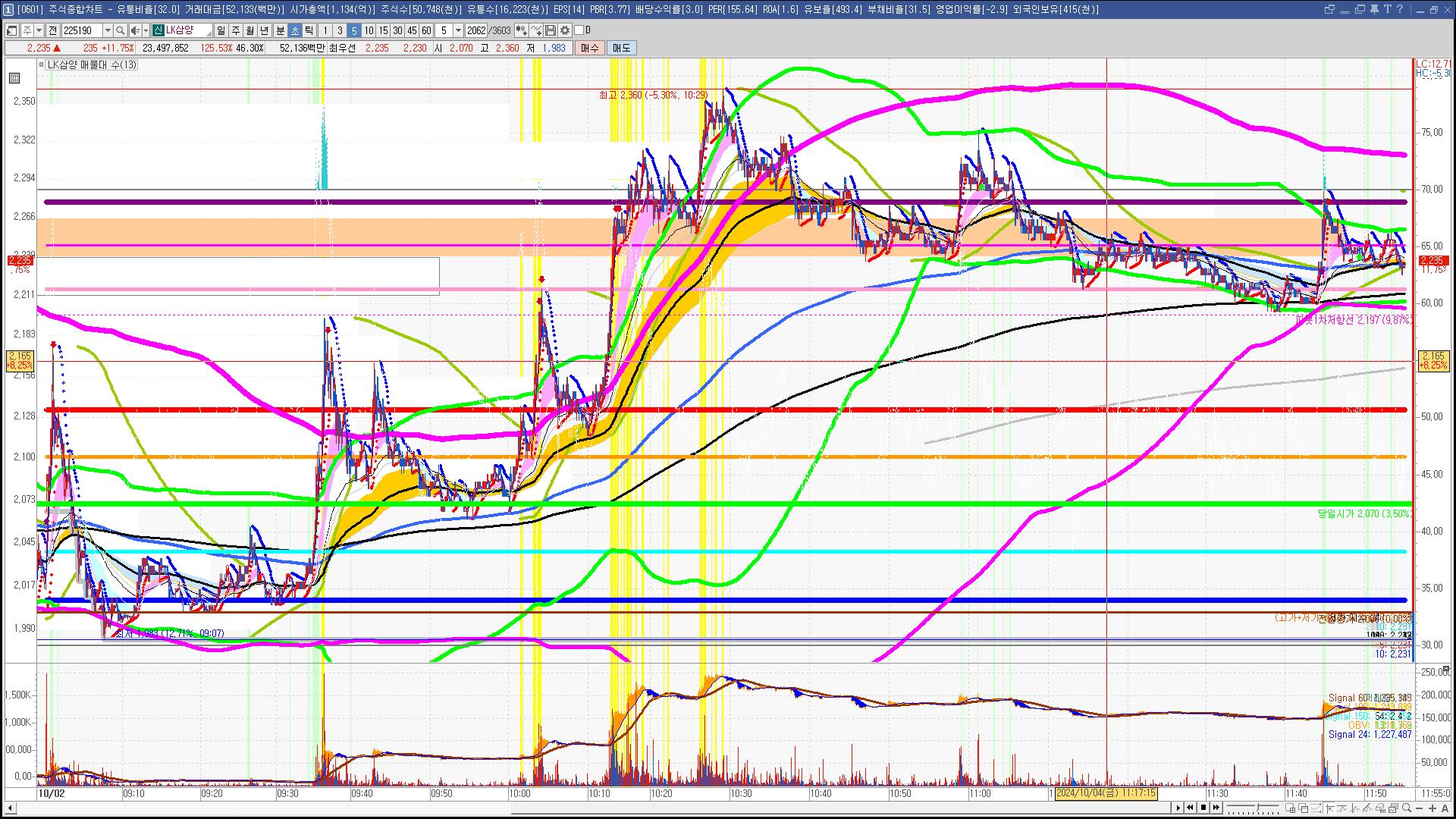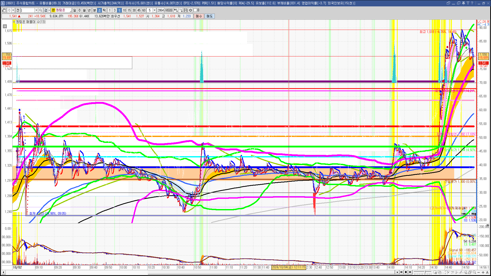| 빨강 3% | 주황 1.5% | 녹색 시가 | 옥색 -1.5% | 파랑 -3% | 회색 저가 | 갈색 전일종가 | 장미7% | 분홍8% | 보라 10% |
