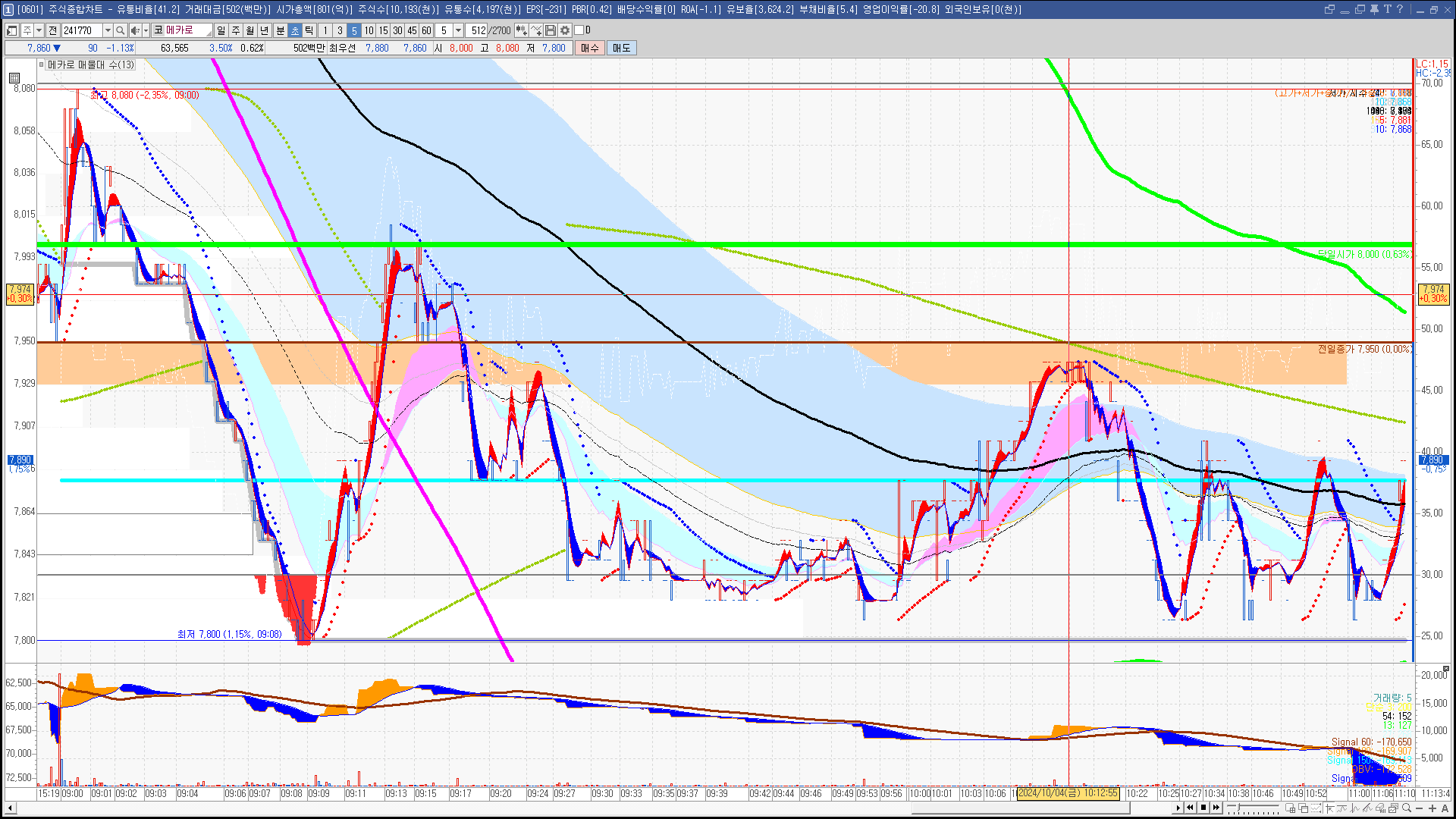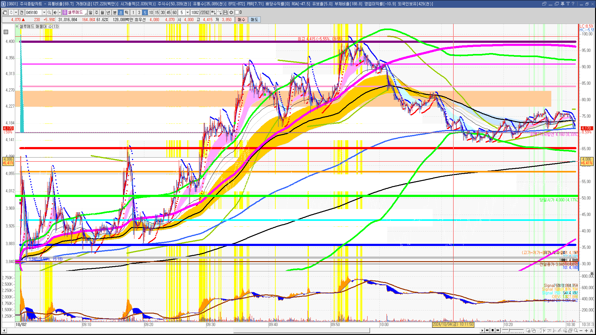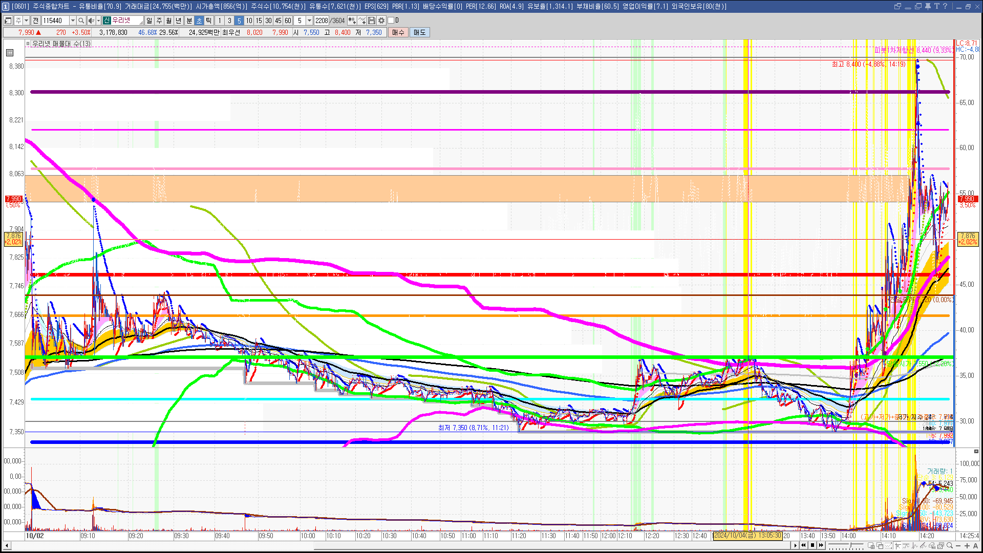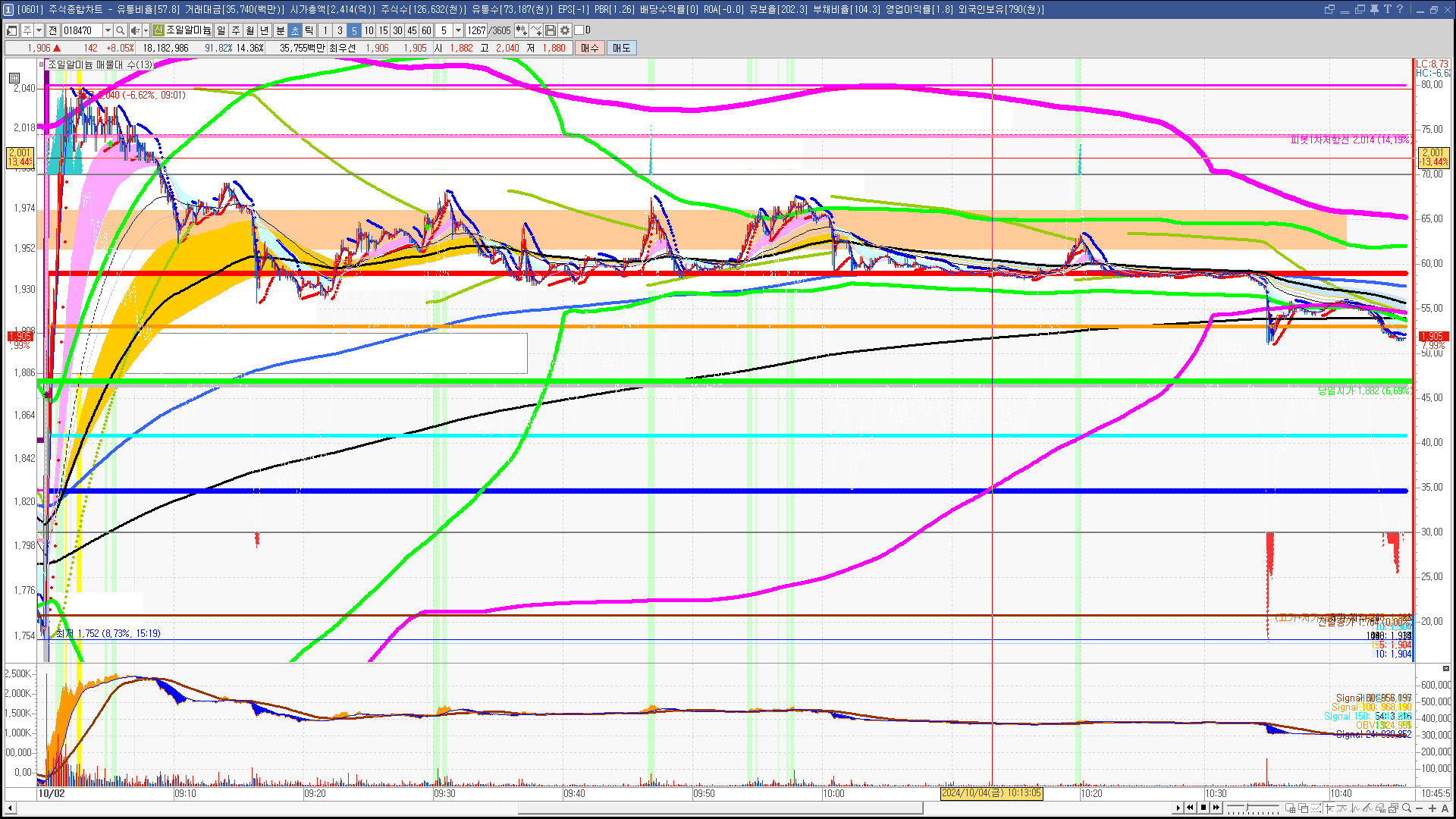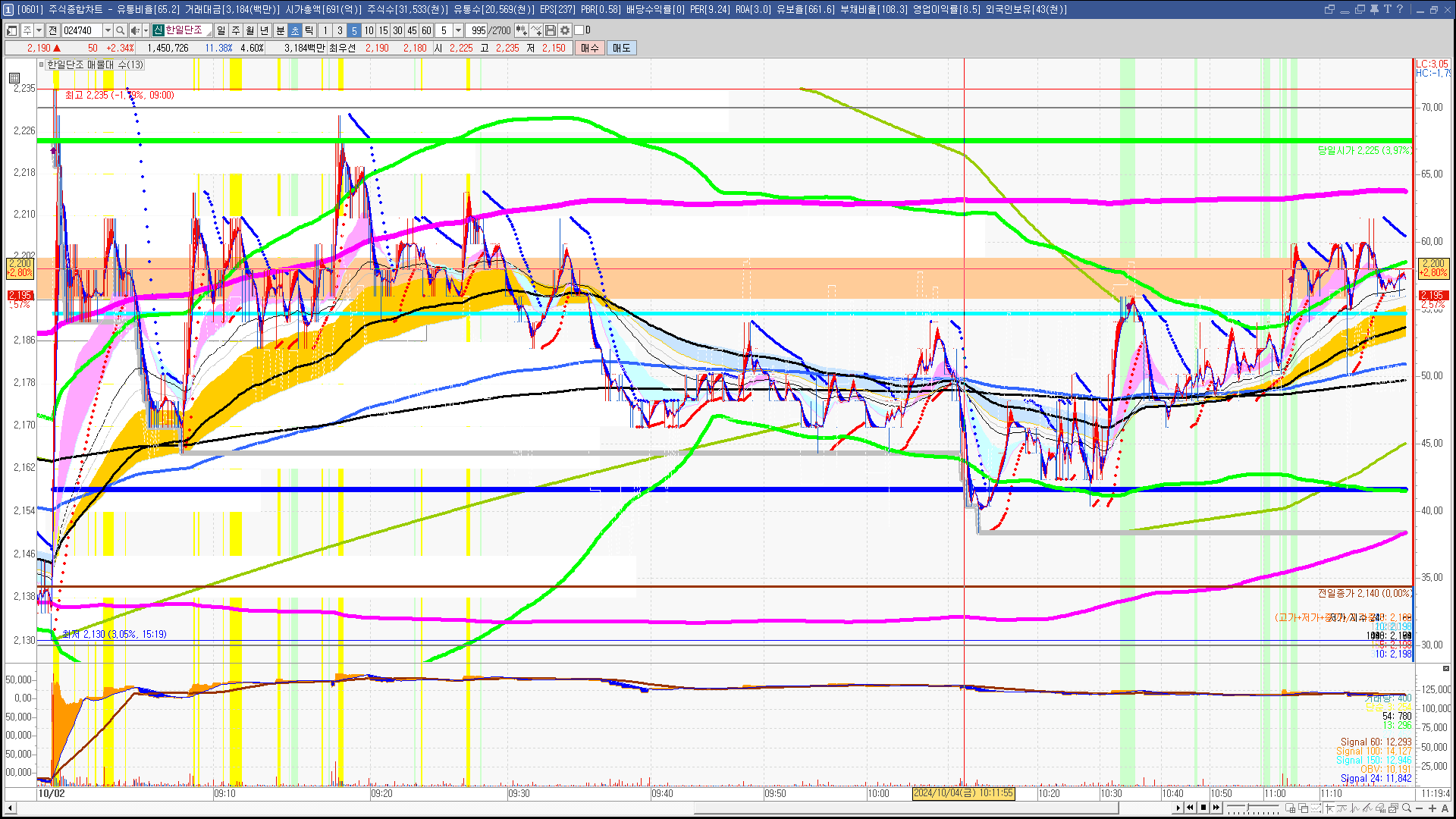 | 빨강 3% | 주황 1.5% | 녹색 시가 | 옥색 -1.5% | 파랑 -3% | 회색 저가 | 갈색 전일종가 | 장미7% | 분홍8% | 보라 10% |
