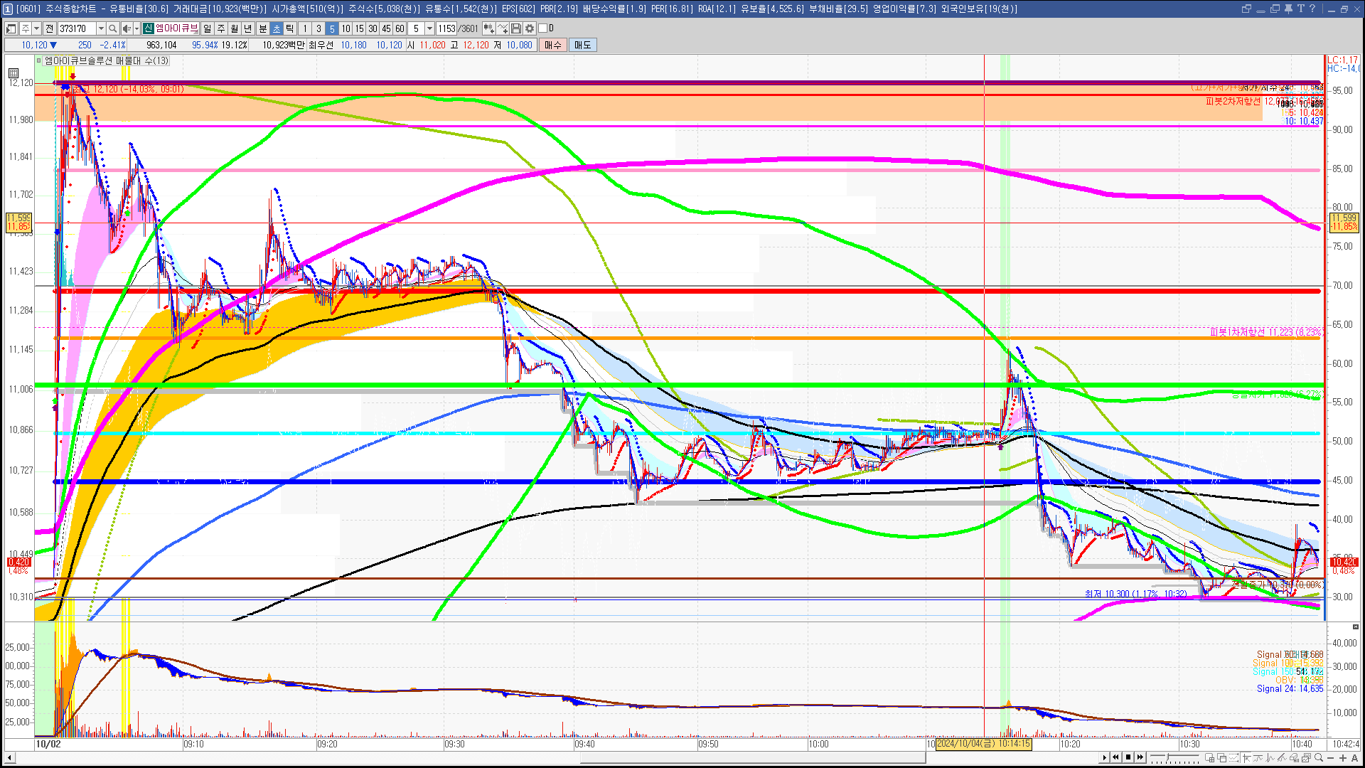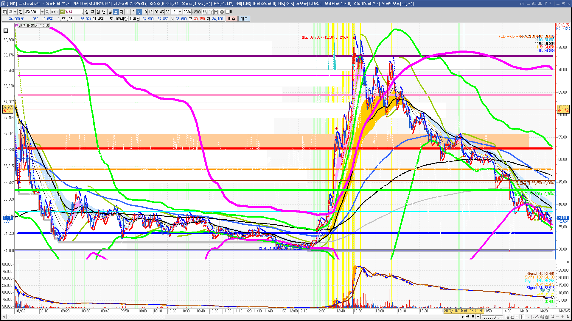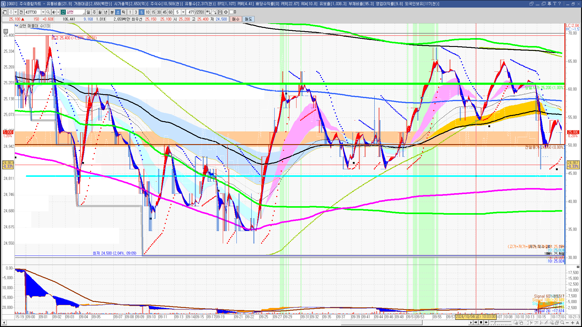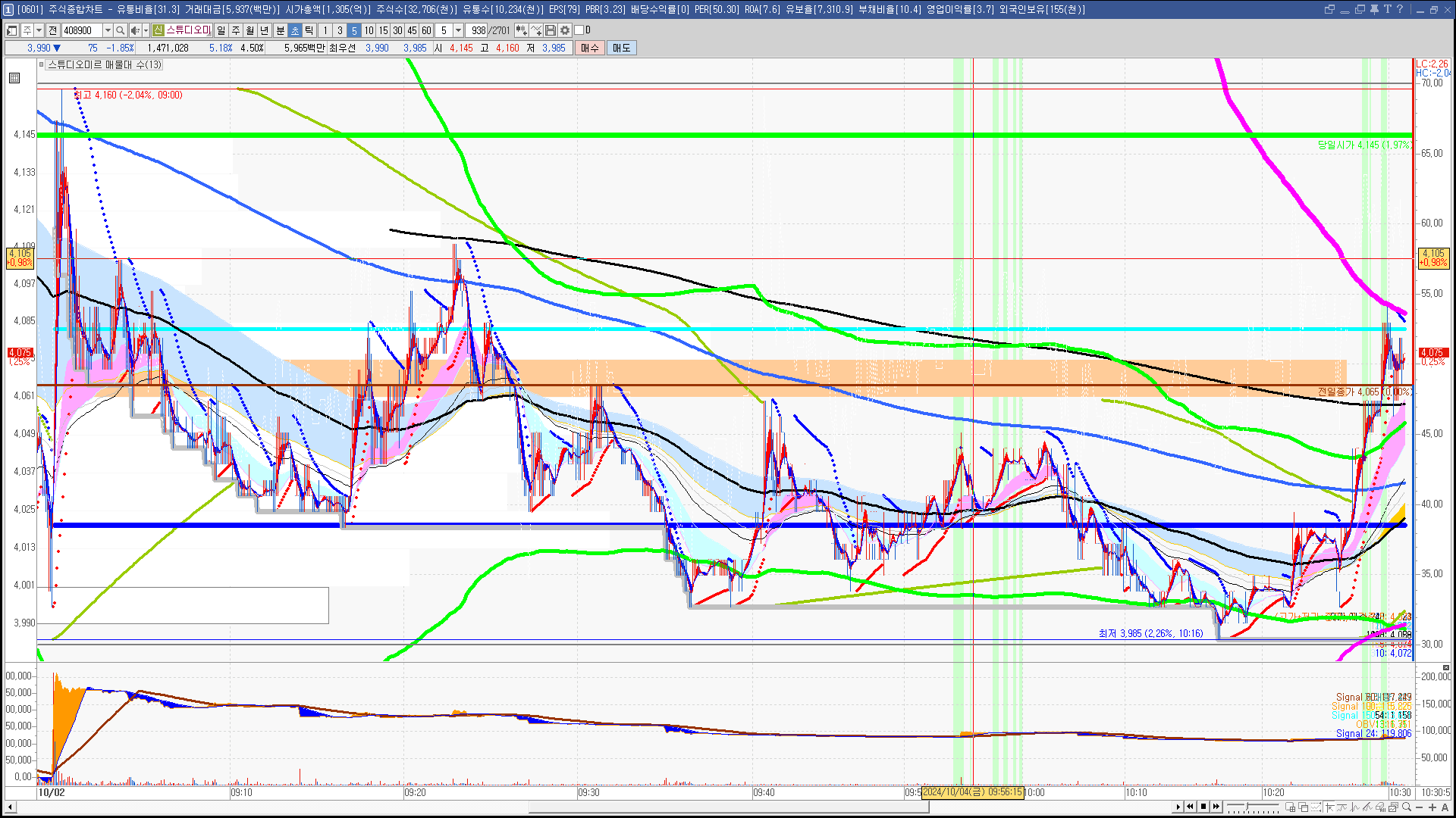 | 빨강 3% | 주황 1.5% | 녹색 시가 | 옥색 -1.5% | 파랑 -3% | 회색 저가 | 갈색 전일종가 | 장미7% | 분홍8% | 보라 10% |