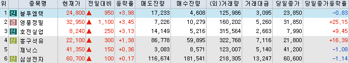21. 한국석유(11.23%) : 이스라엘, 이란 석유시설 폭격 검토 소식에 국제유가 폭등 영향 속 에너지관련주로 부각되며 급등