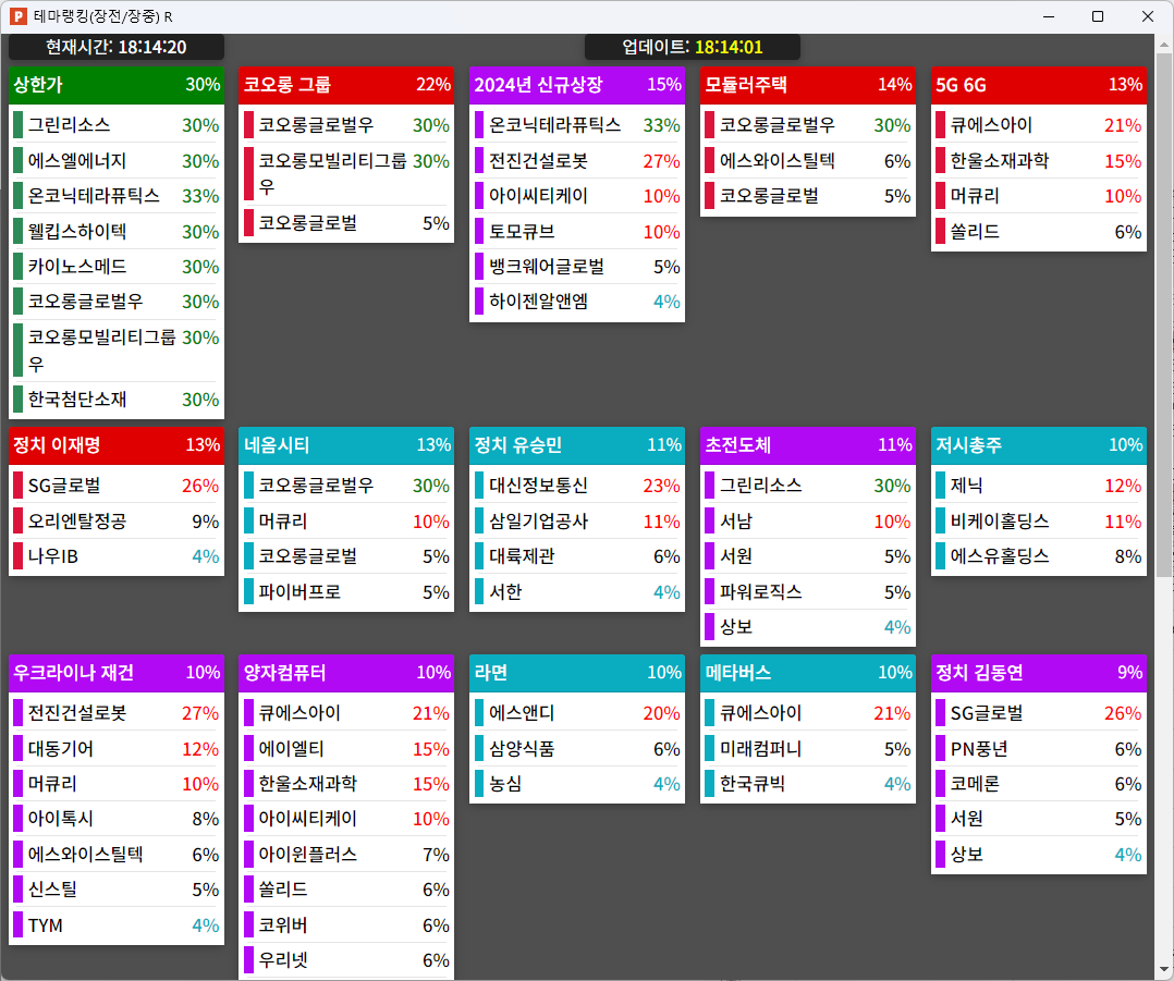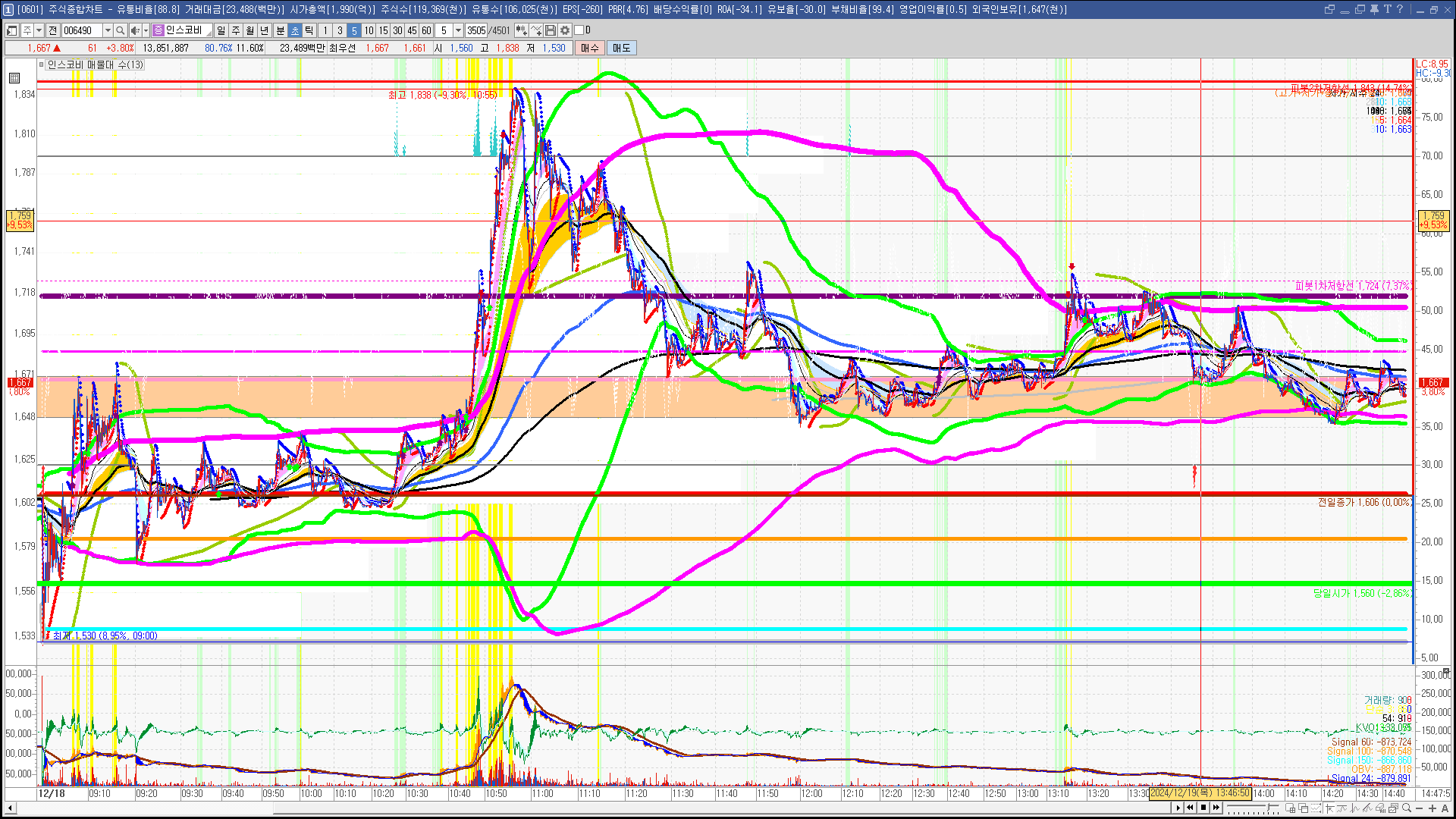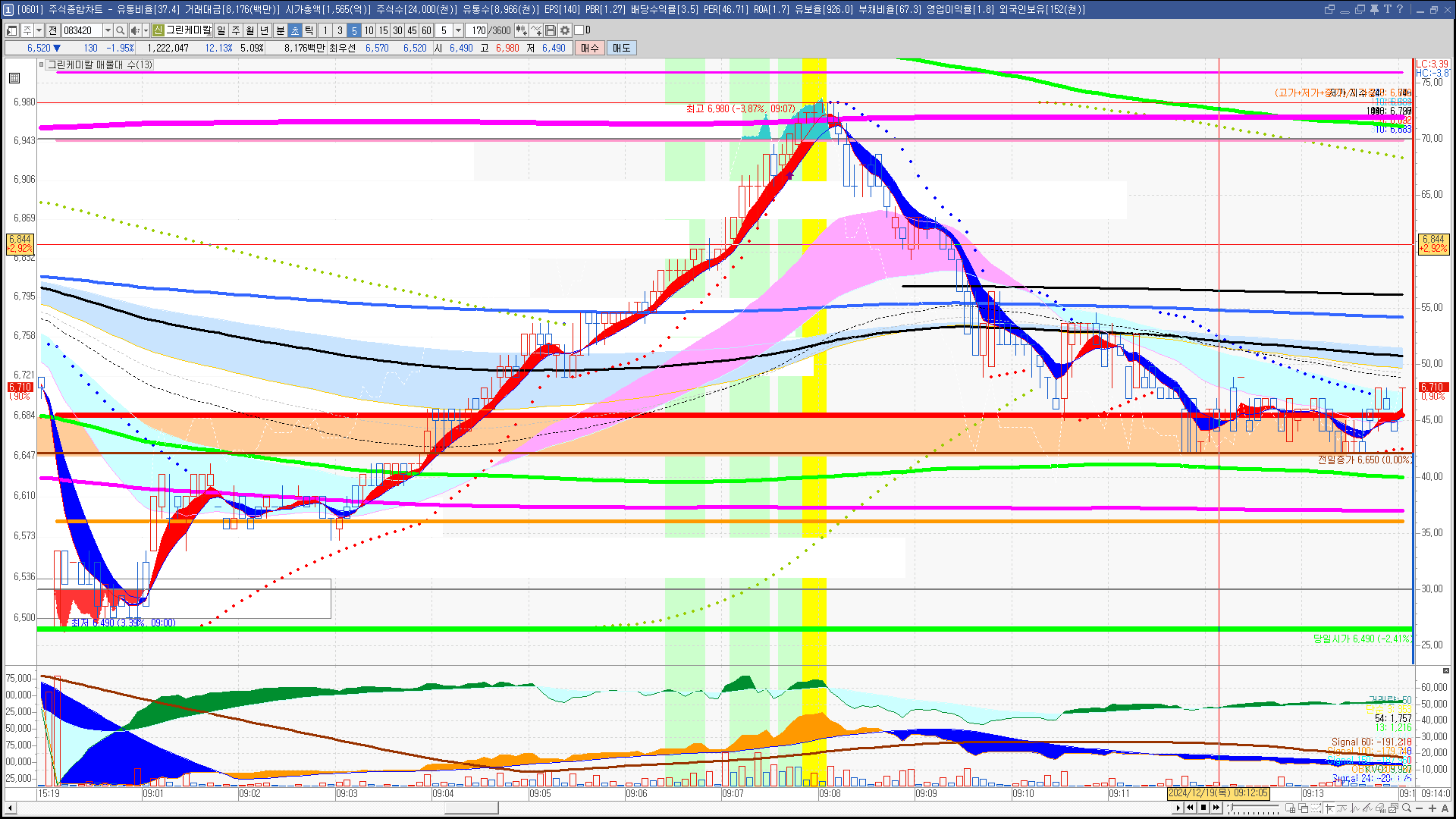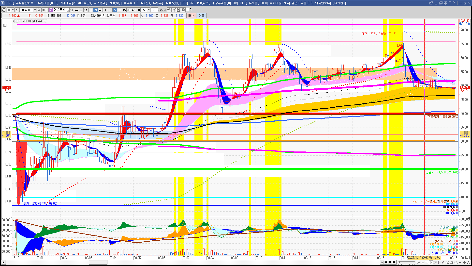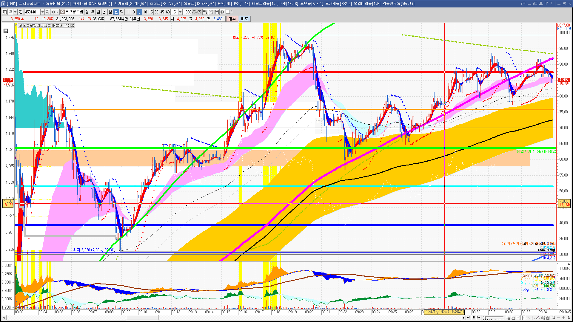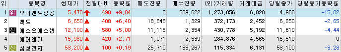 | 빨강 3% | 주황 1.5% | 녹색 시가 | 옥색 -1.5% | 파랑 -3% | 회색 저가 | 갈색 전일종가 | 장미7% | 분홍8% | 보라 10% |