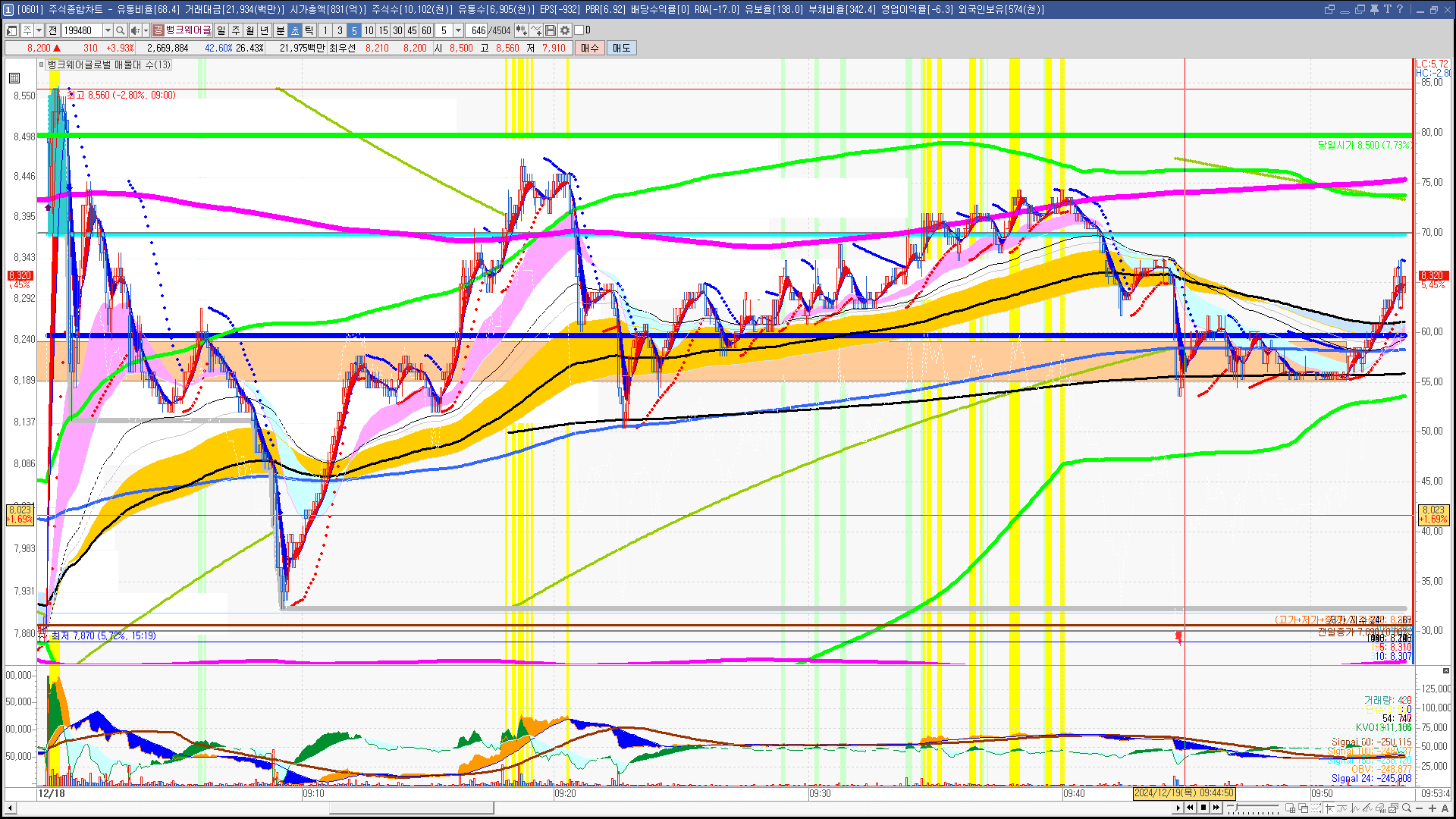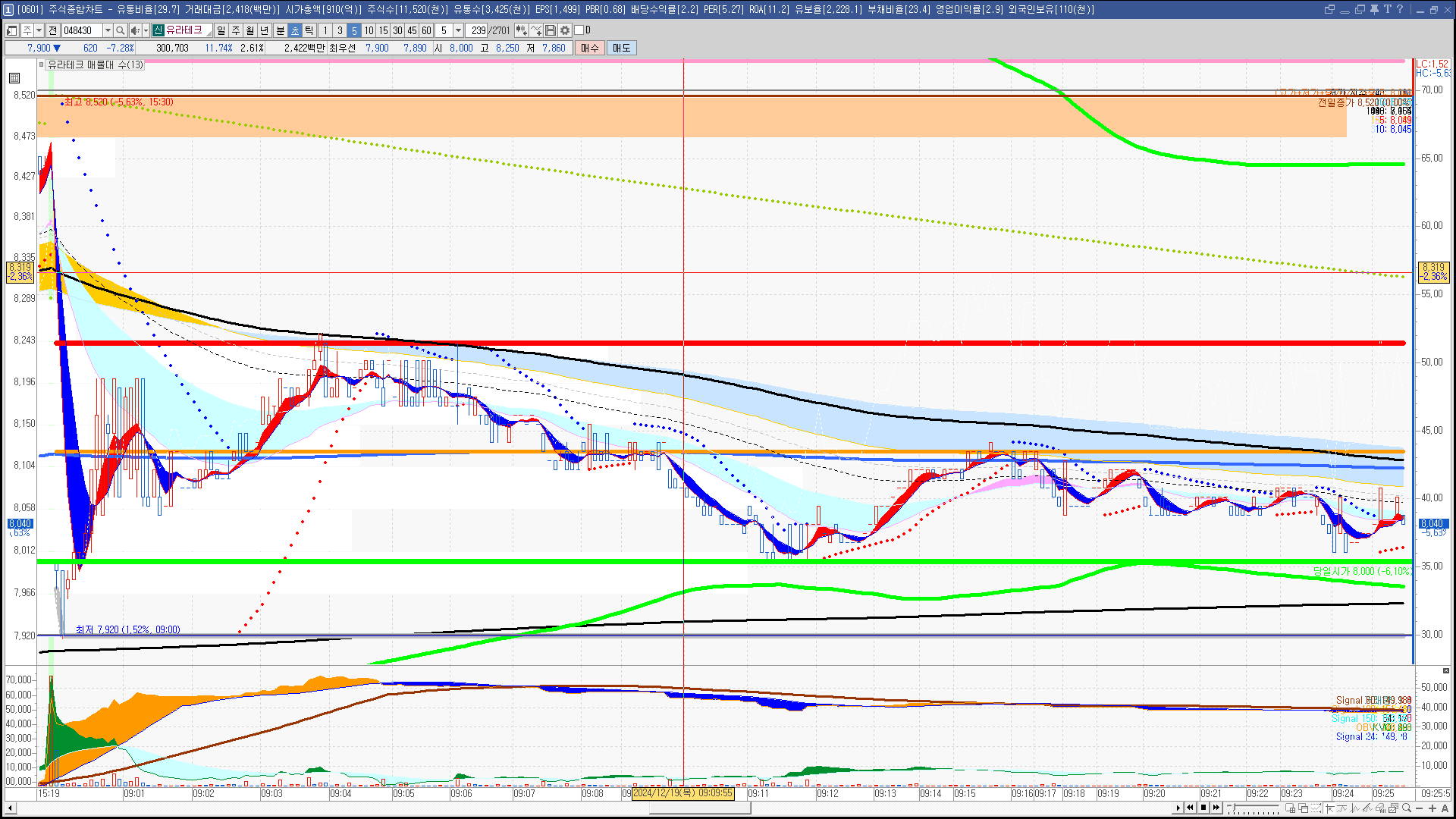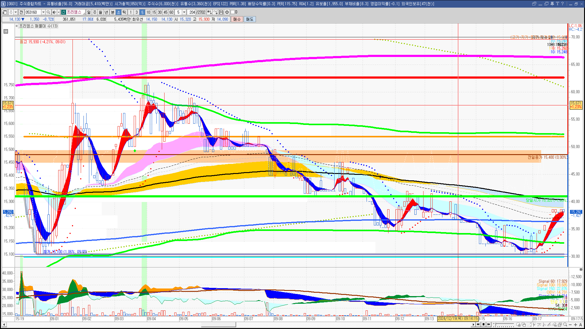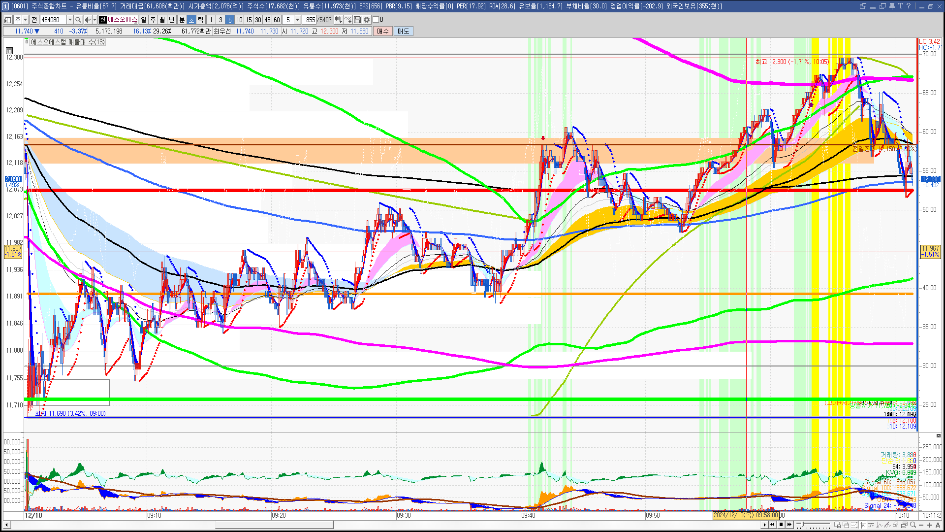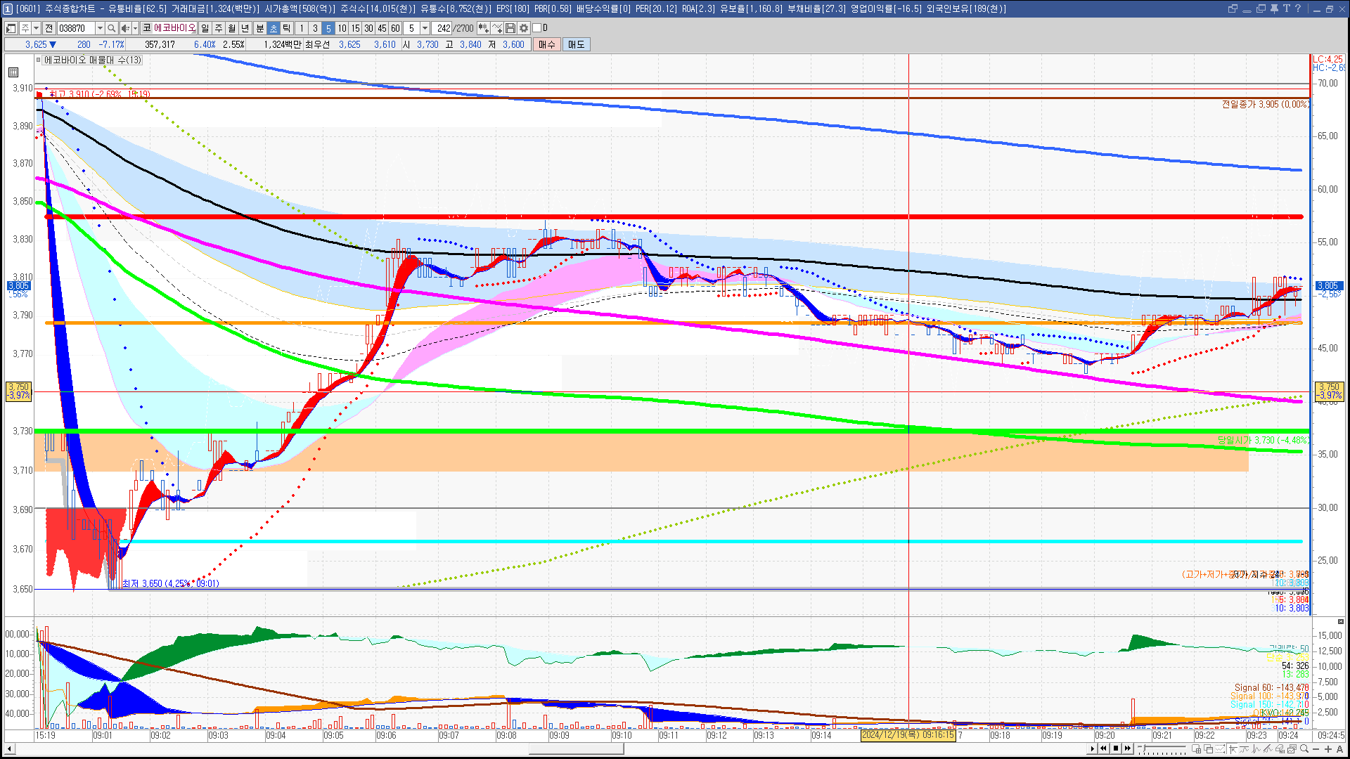 | 빨강 3% | 주황 1.5% | 녹색 시가 | 옥색 -1.5% | 파랑 -3% | 회색 저가 | 갈색 전일종가 | 장미7% | 분홍8% | 보라 10% |