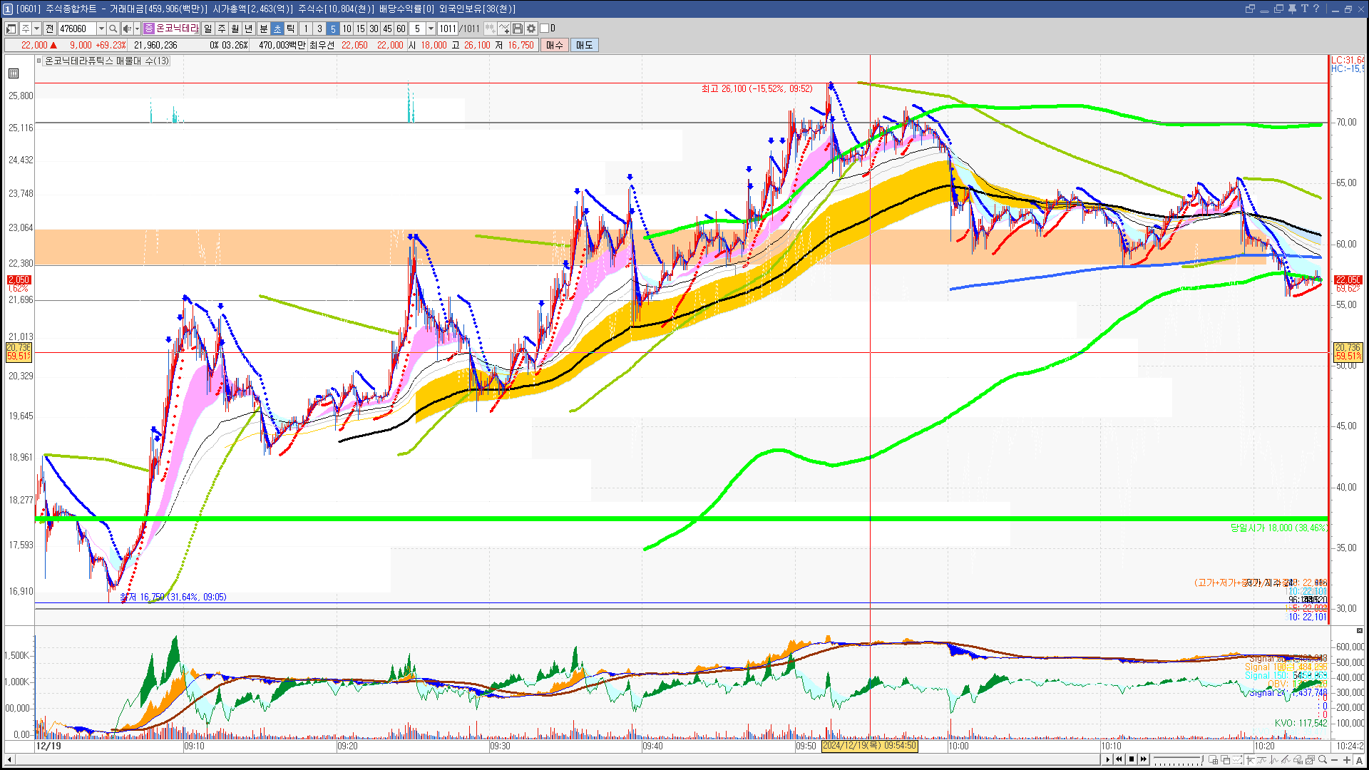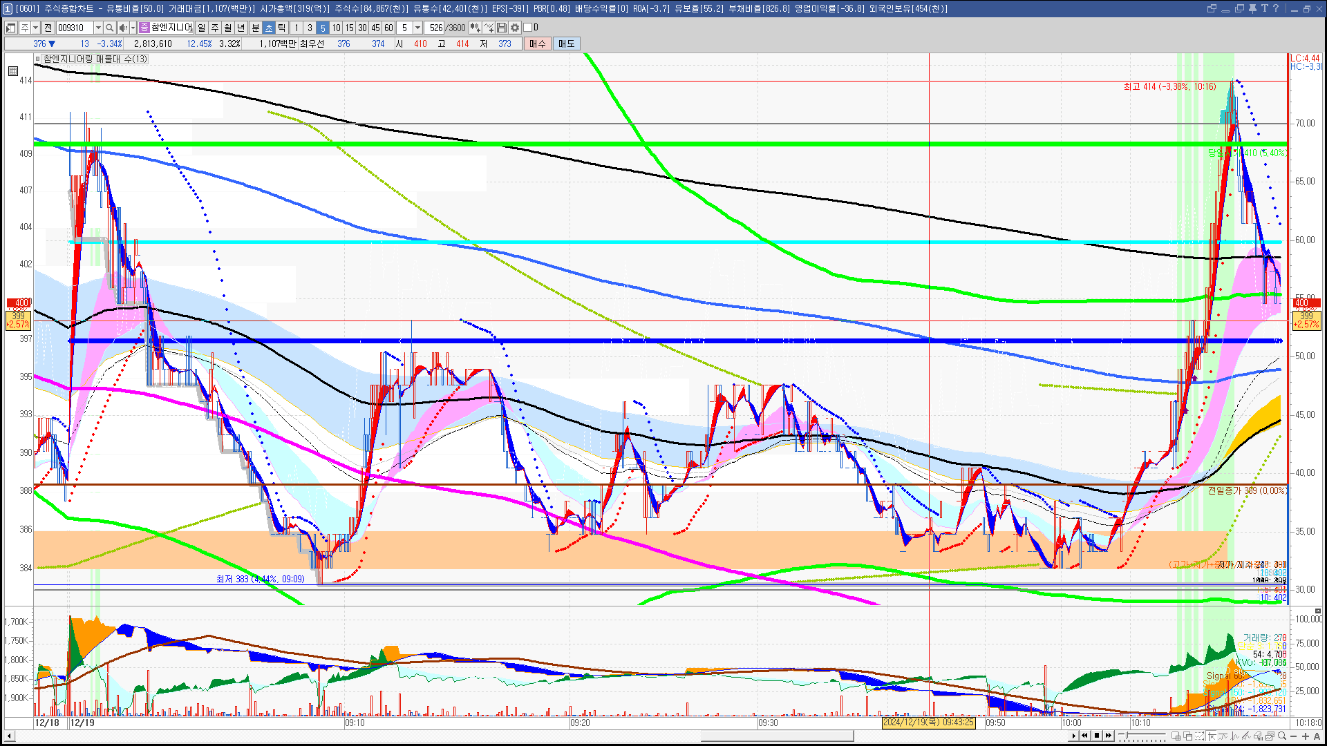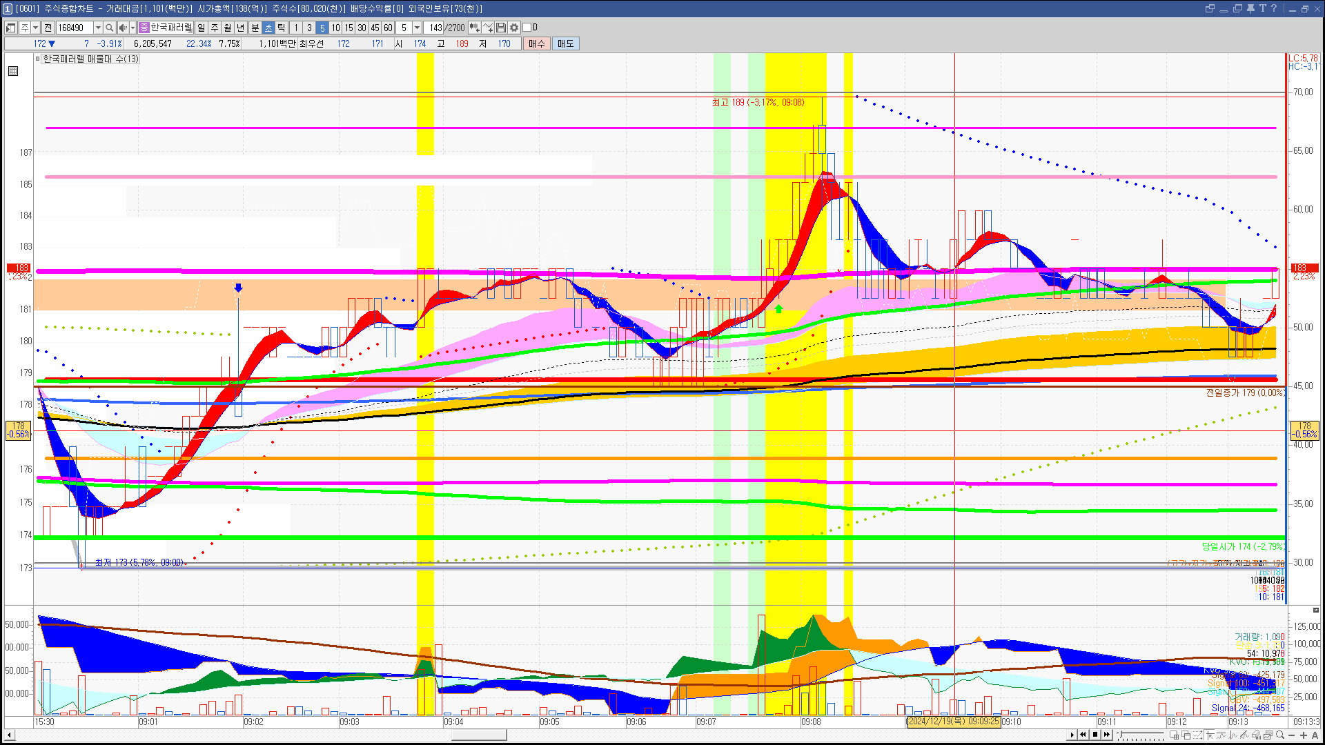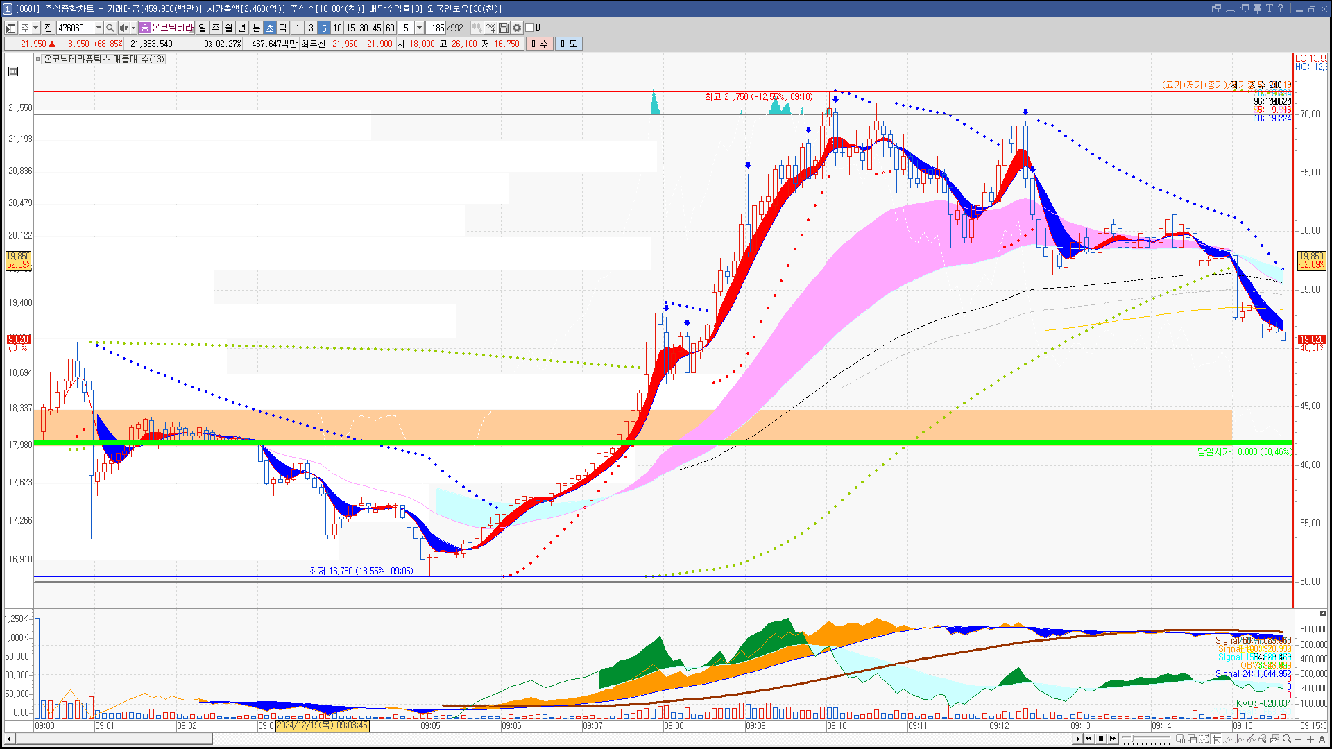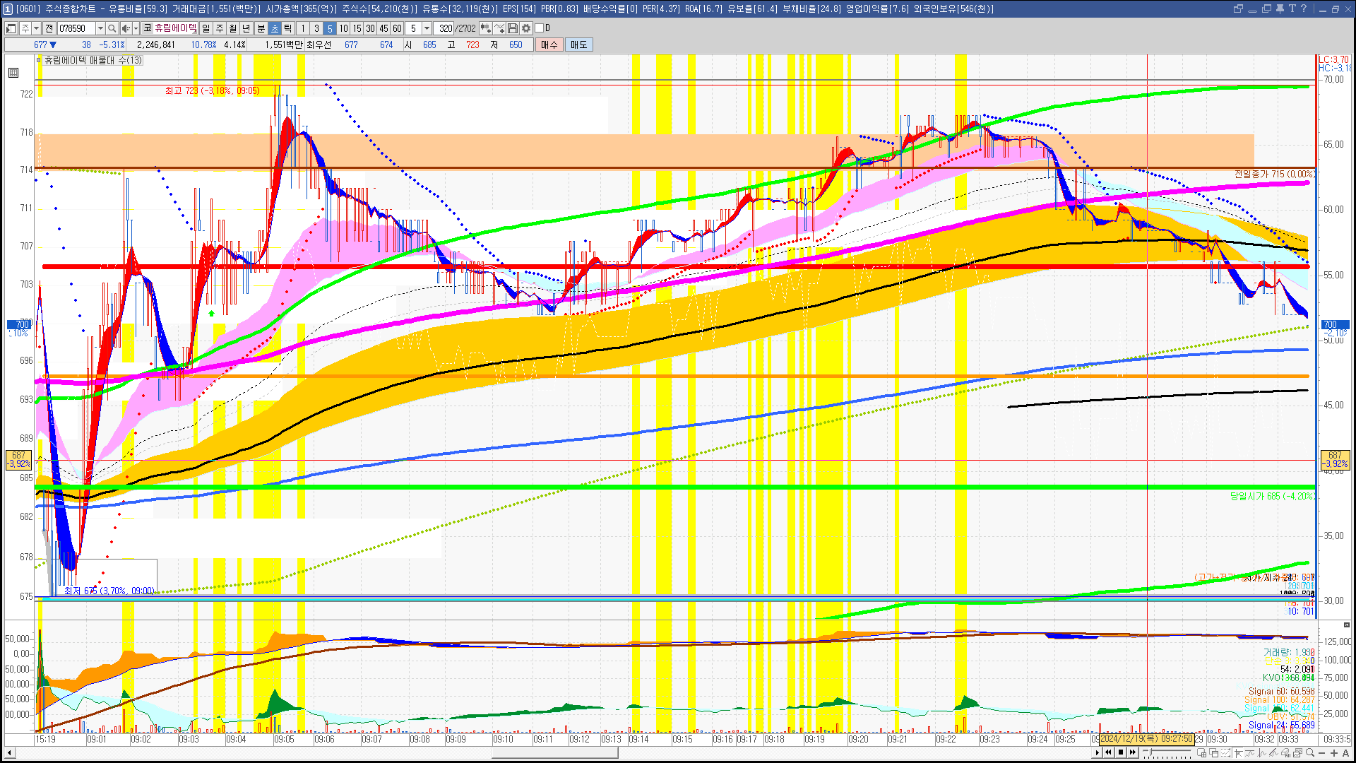 | 빨강 3% | 주황 1.5% | 녹색 시가 | 옥색 -1.5% | 파랑 -3% | 회색 저가 | 갈색 전일종가 | 장미7% | 분홍8% | 보라 10% |