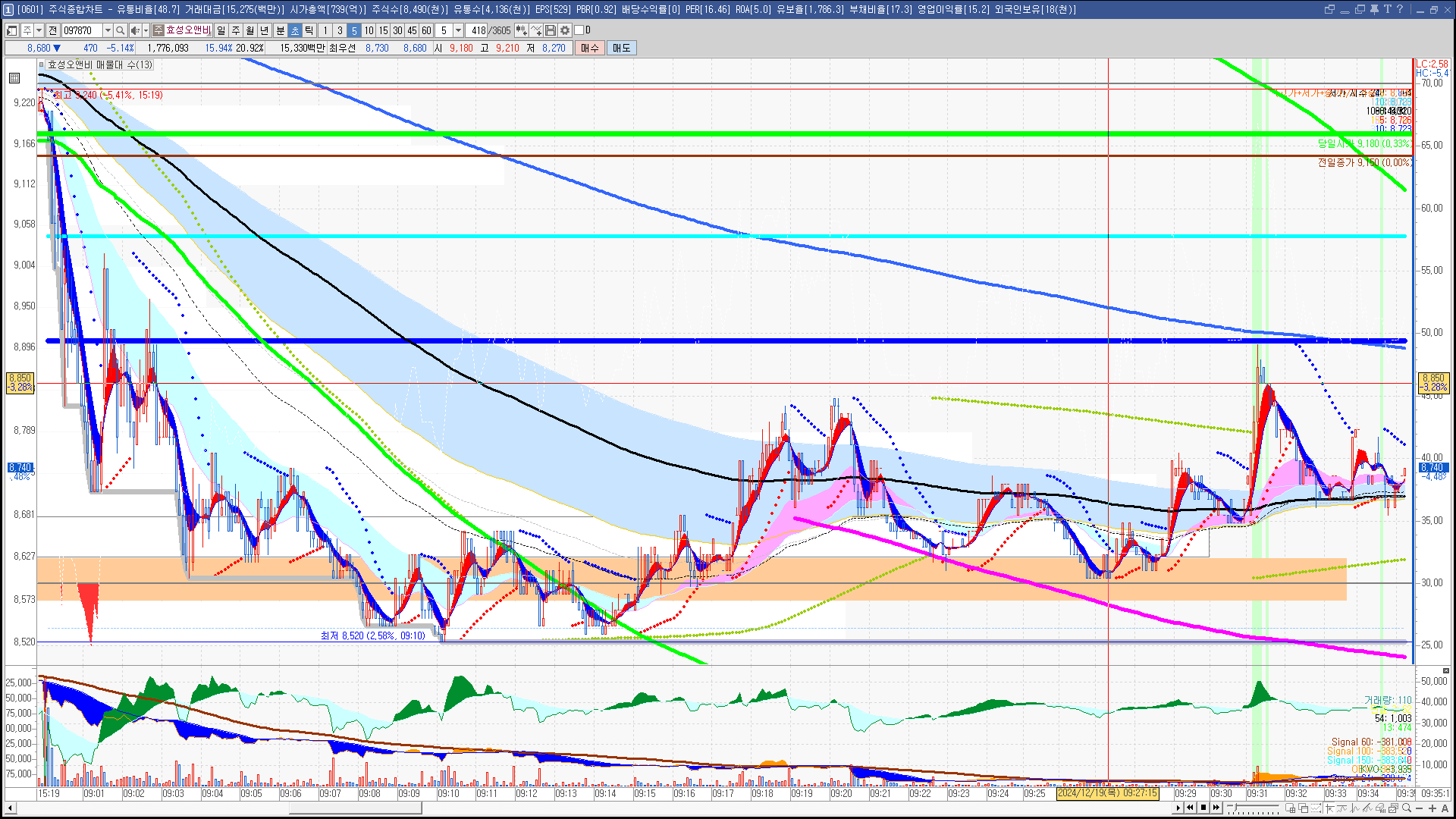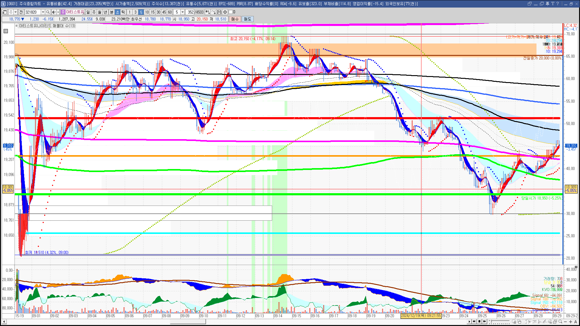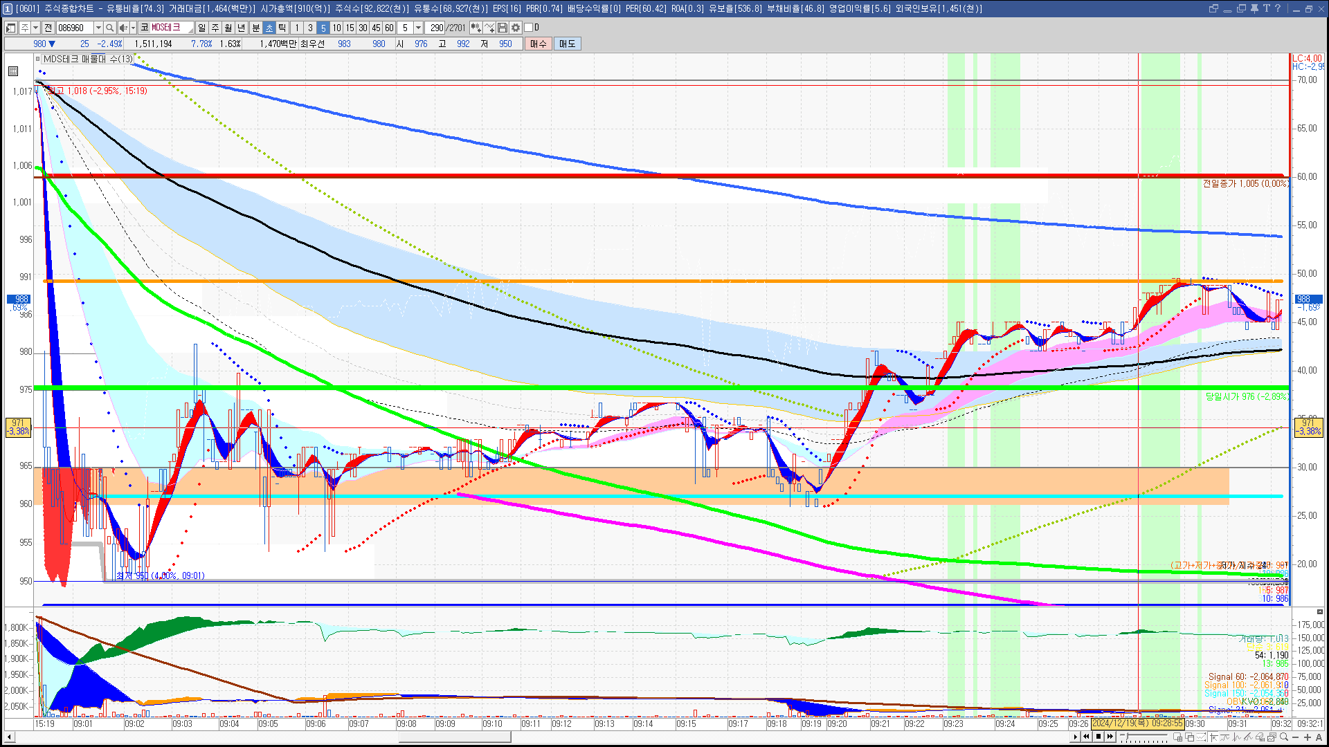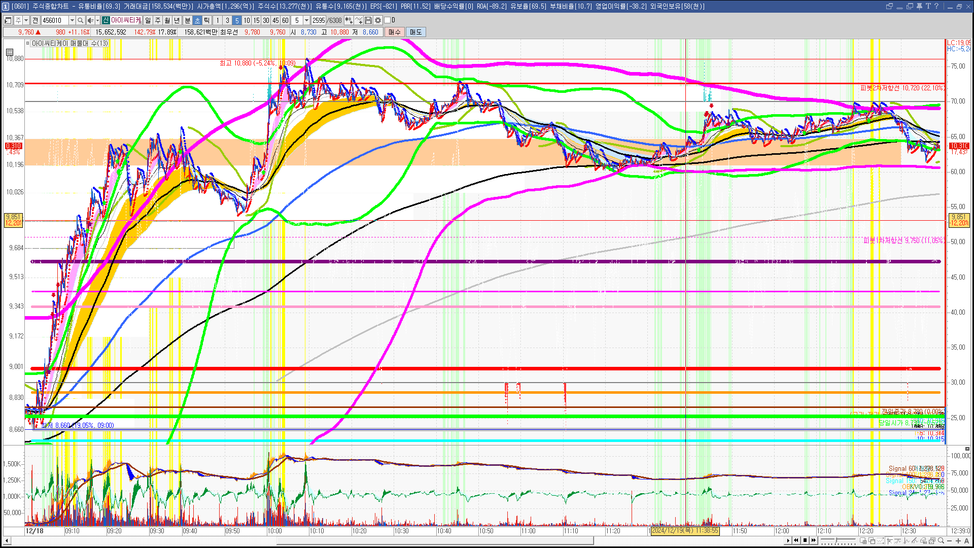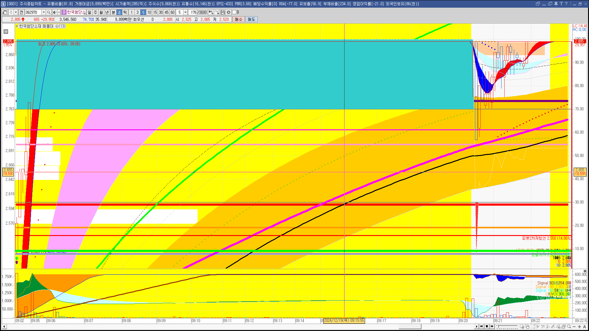 | 빨강 3% | 주황 1.5% | 녹색 시가 | 옥색 -1.5% | 파랑 -3% | 회색 저가 | 갈색 전일종가 | 장미7% | 분홍8% | 보라 10% |