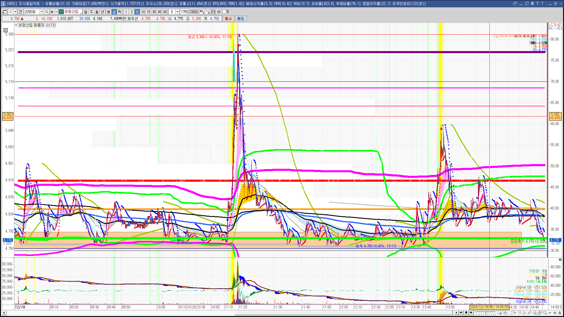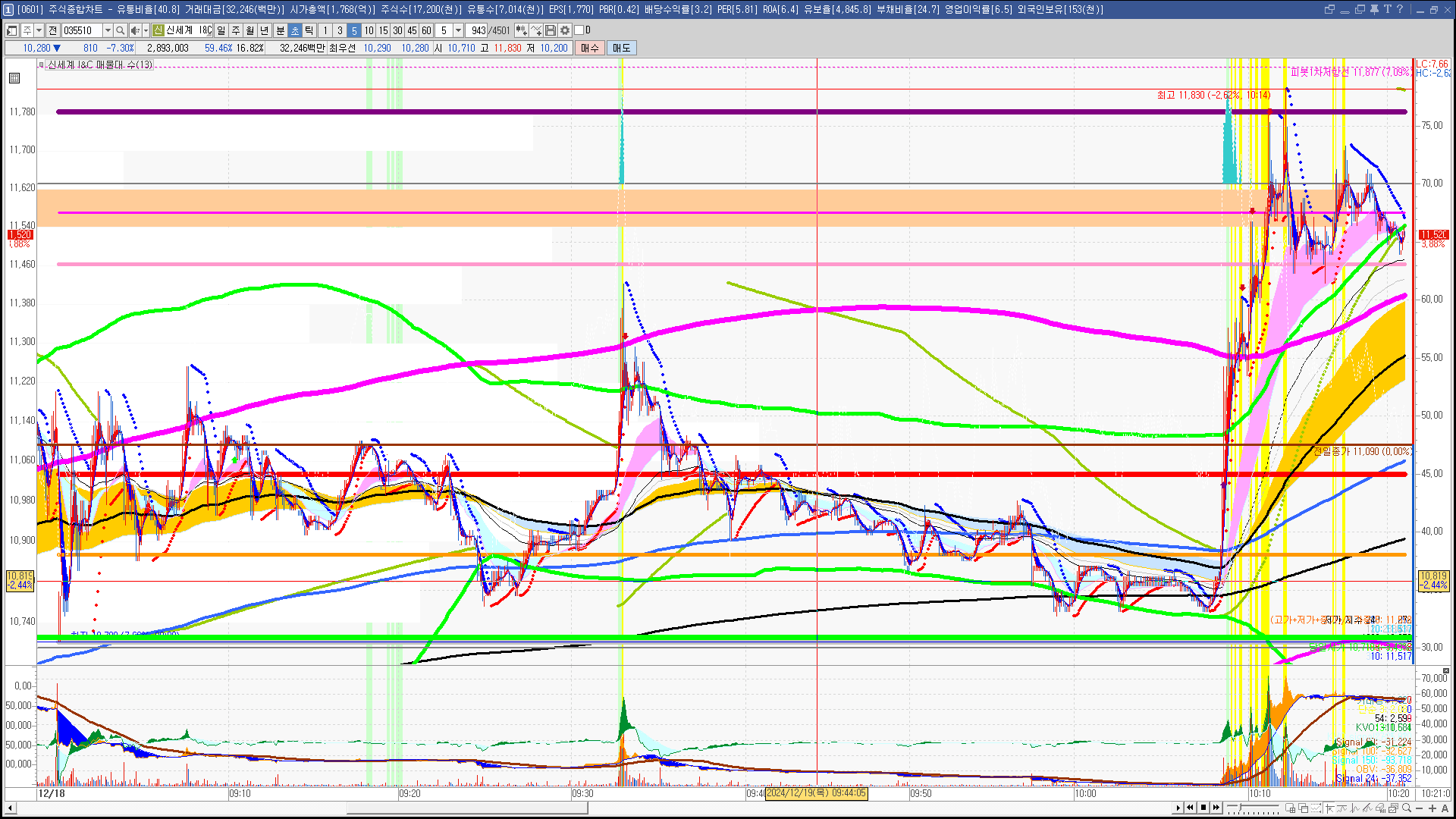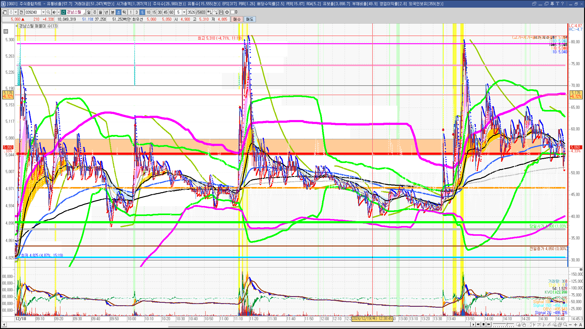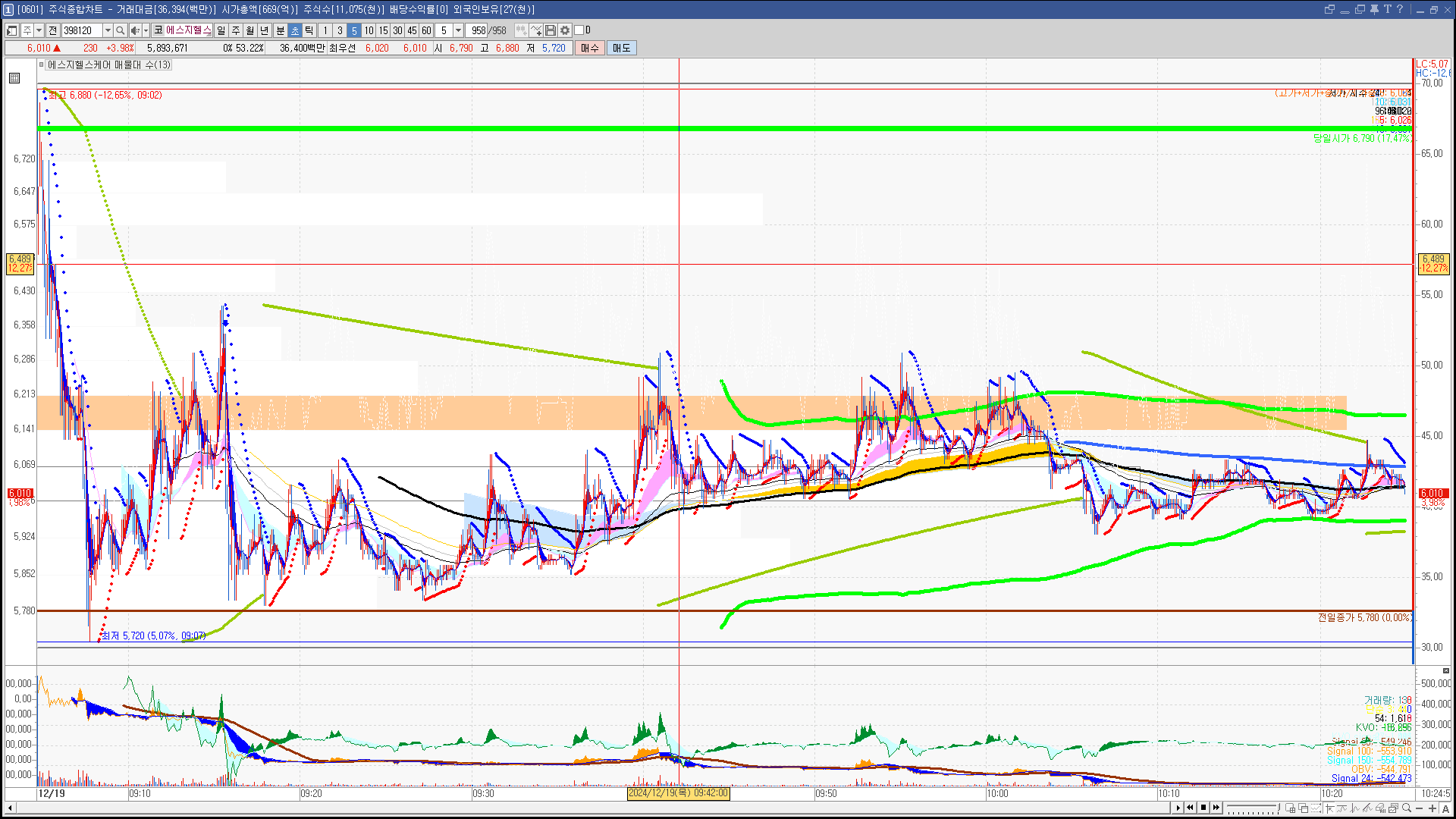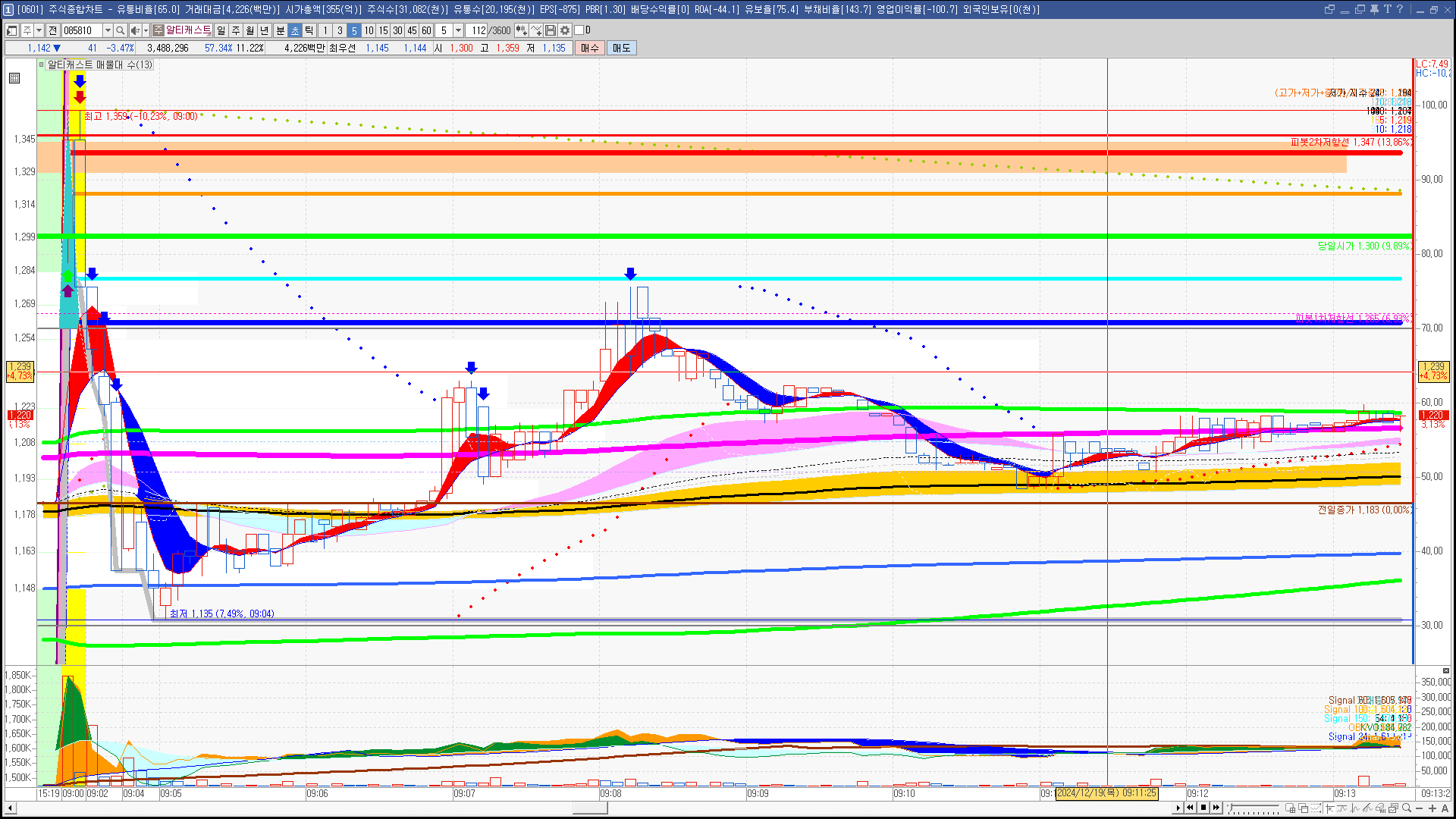 | 빨강 3% | 주황 1.5% | 녹색 시가 | 옥색 -1.5% | 파랑 -3% | 회색 저가 | 갈색 전일종가 | 장미7% | 분홍8% | 보라 10% |
