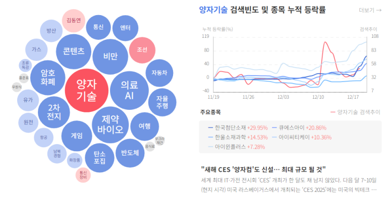 3. 한국첨단소재 (29.95%) : 통신장비관련주, 시총200억대, 통신부품사업, 25년 1월 2일 반중국 반도체, AI, 양자컴퓨팅 투자 통제 시행 예정, 연내 AI 기본법 법안 통과 기대감, 구글의 양자컴퓨터 개발 등 ⇨ ETRI와 양자인터넷사업, 2연속 상한가 등 ⇨ 양자암호관련주 부각