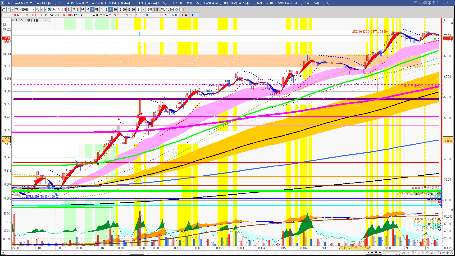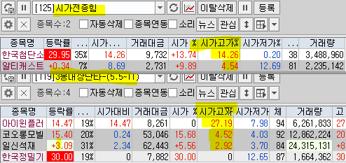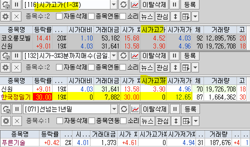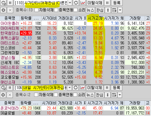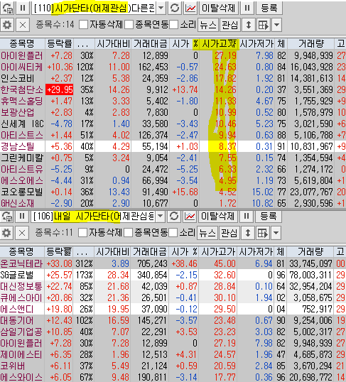 | 시가단타(1~3%) : 아티스트스튜디오, 코오롱모빌리티그룹, 신세계 I&C, 아이윈플러스, 유라테크, 아티스트유나이티드, GH신소재, 경남스틸, 효성오앤비 ++ 휴맥스홀딩스, 알티캐스트, 인스코비, 한국첨단소재, 에스오에스랩, 휴림에이텍 + 아이씨티케이, 프리엠스, 그린케미칼, 참엔지니어링, 에코바이오, 보광산업, MDS테크, 한국패러랠 + 뱅크웨어글로벌 상장 온코닉테라퓨틱스 소화기질환 신약, 표적항암제 신약 순이익 1,682 (백만원) 2,589,819 / 10,803,960 상장 에스지헬스케어 | |