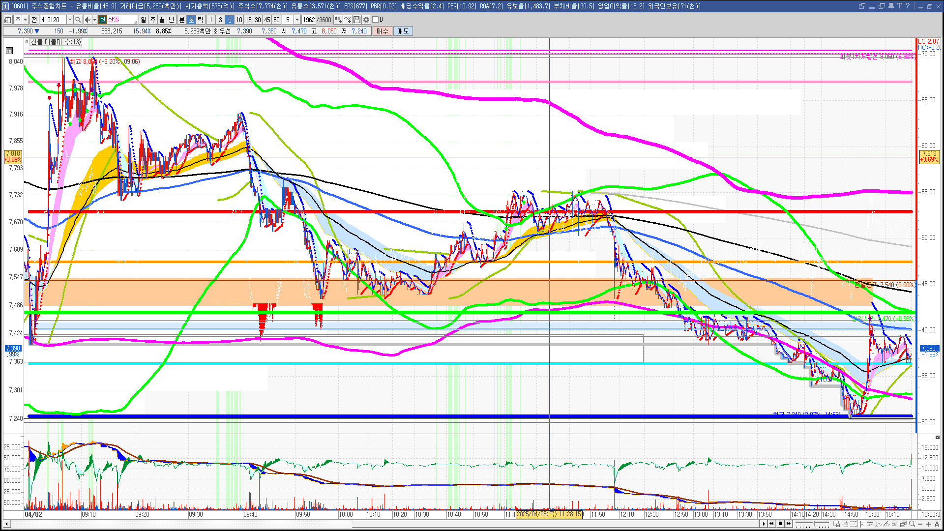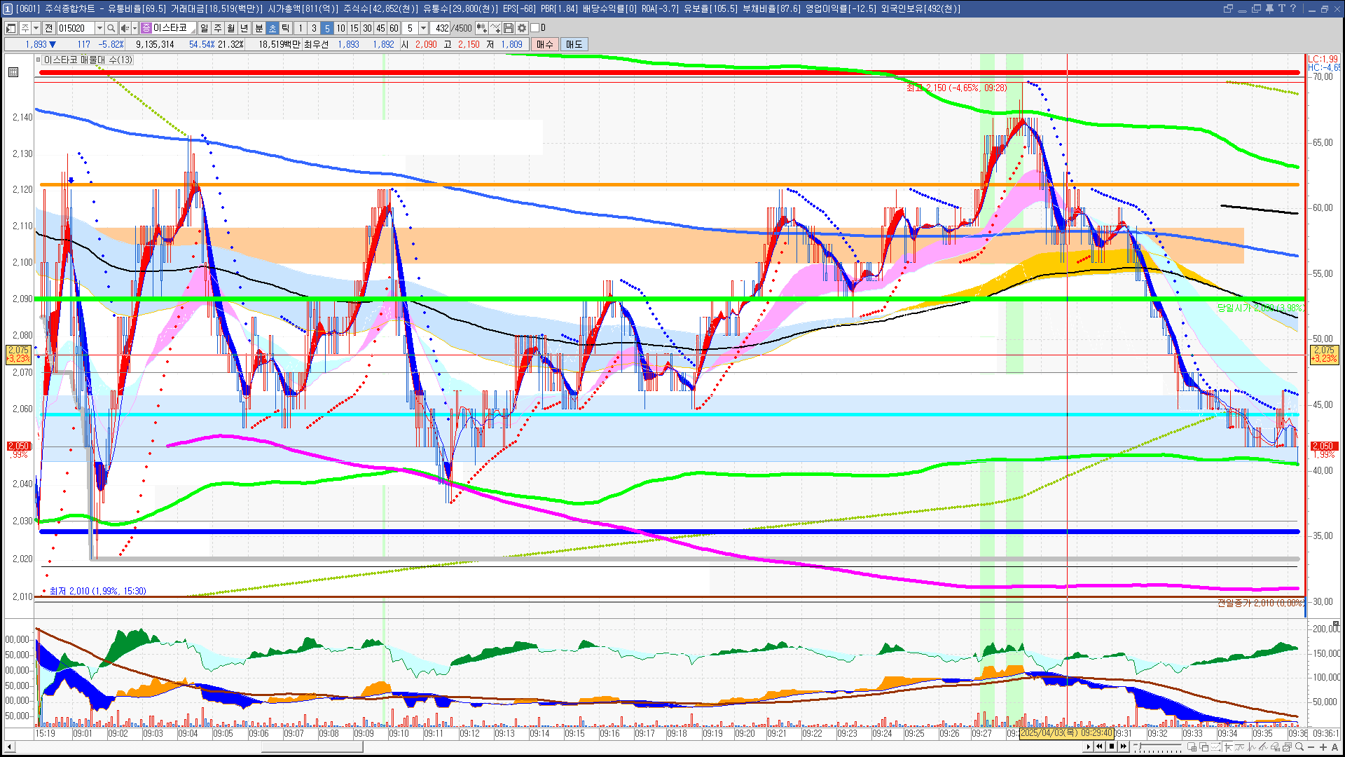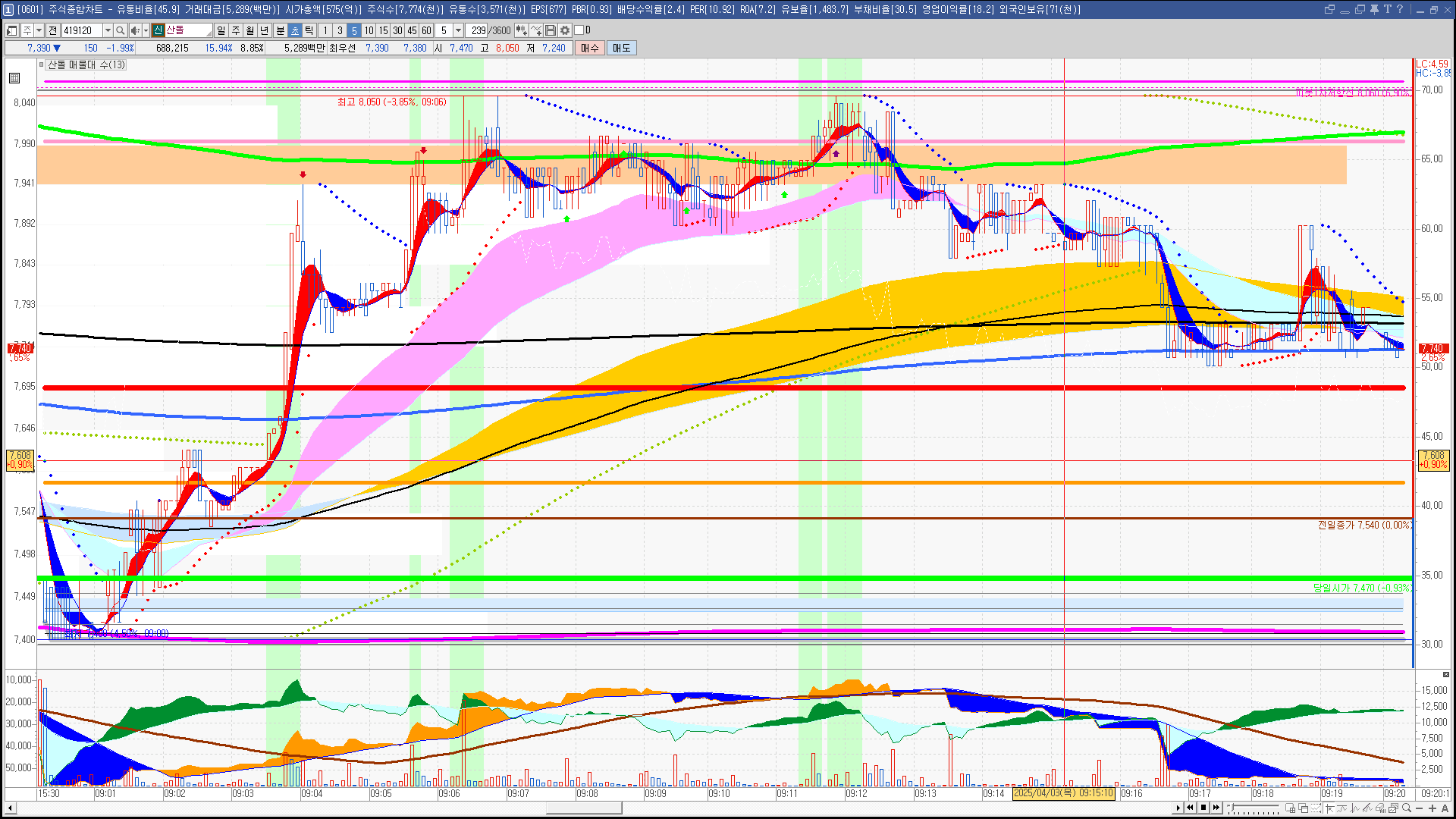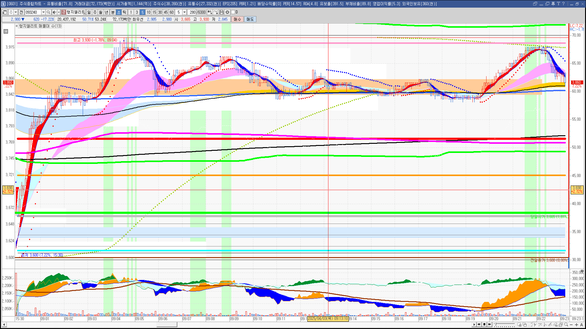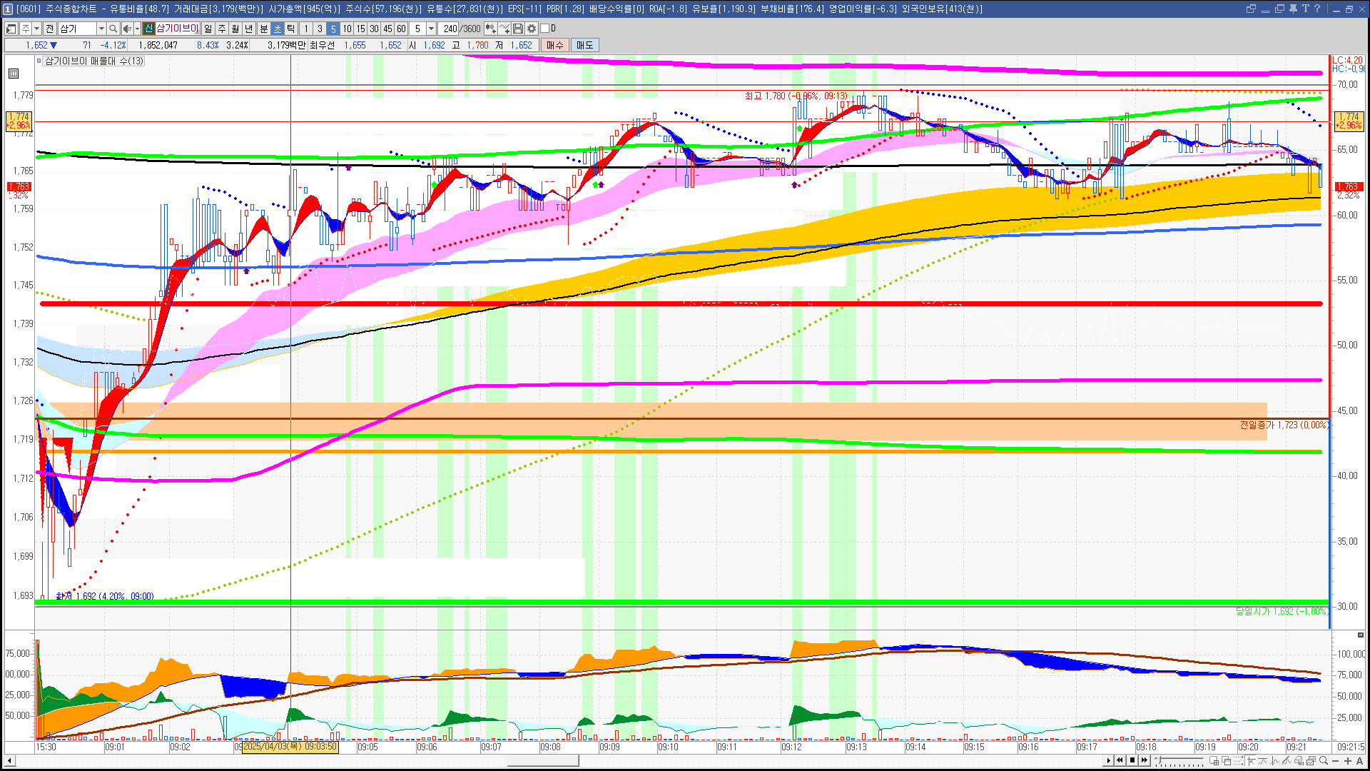 | 빨강 3% | 주황 1.5% | 녹색 시가 | 옥색 -1.5% | 파랑 -3% | 회색 저가 | 갈색 전일종가 | 장미7% | 분홍8% | 보라 10% |