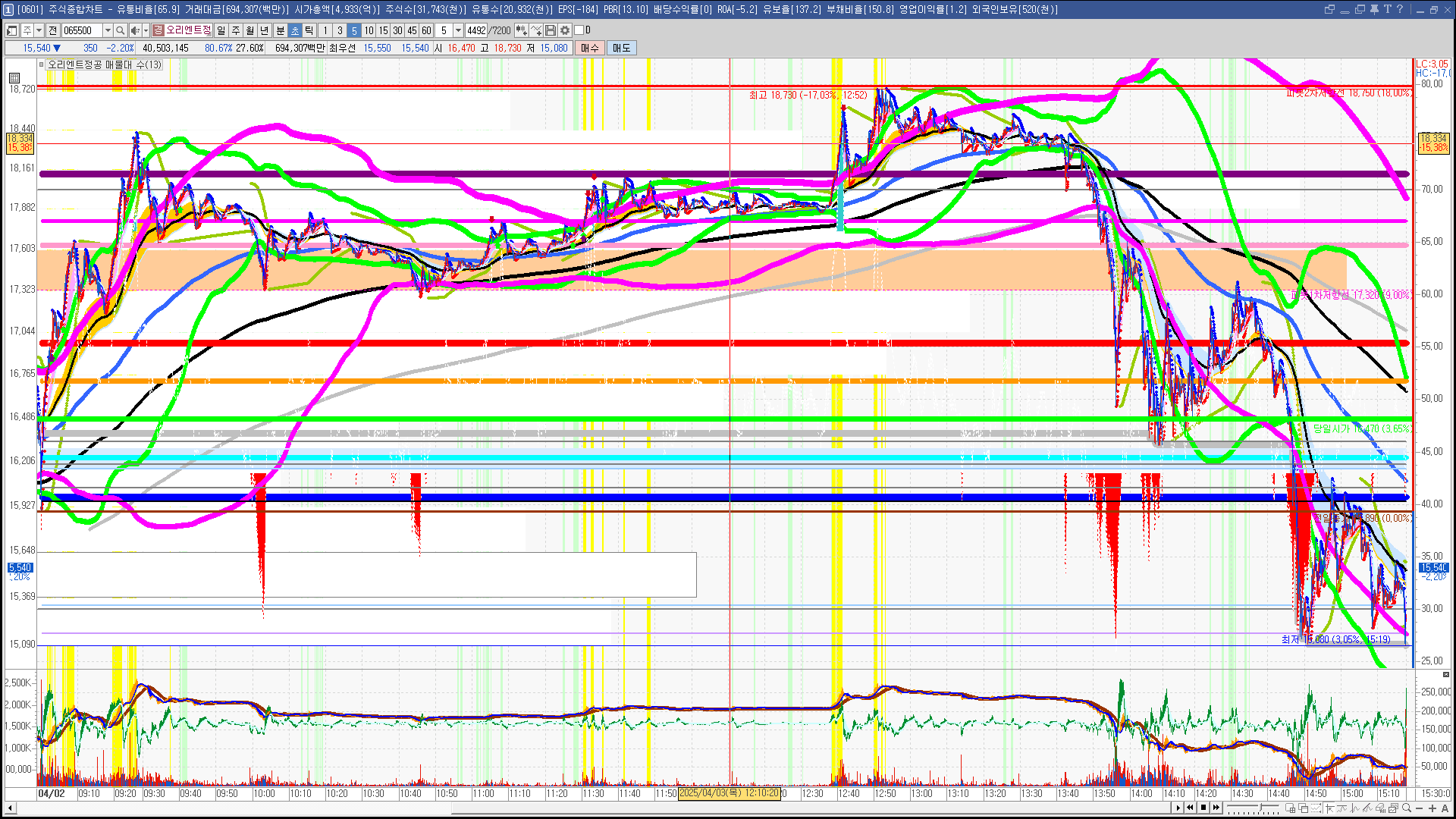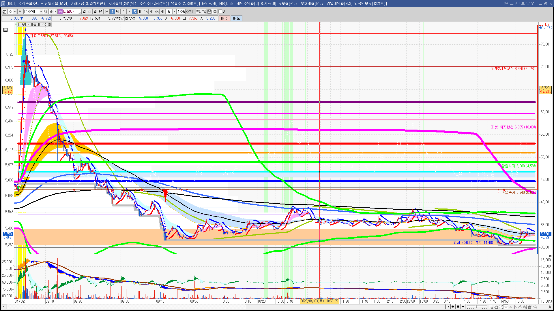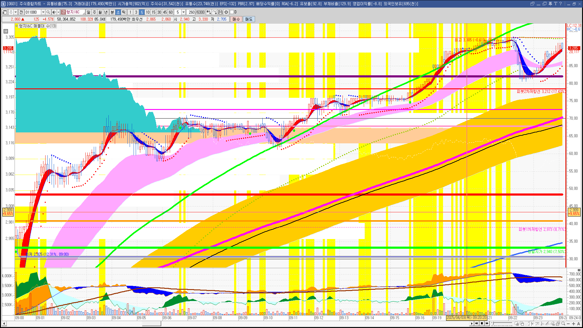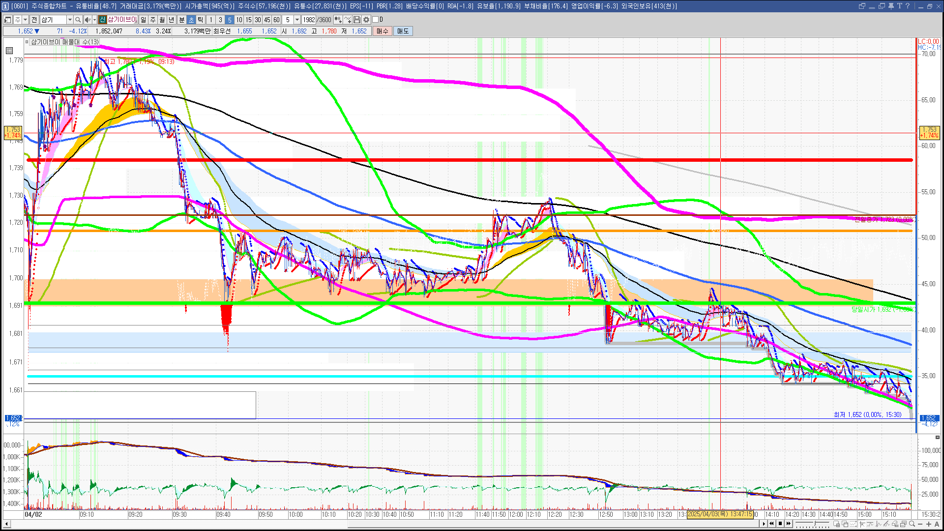 | 빨강 3% | 주황 1.5% | 녹색 시가 | 옥색 -1.5% | 파랑 -3% | 회색 저가 | 갈색 전일종가 | 장미7% | 분홍8% | 보라 10% |