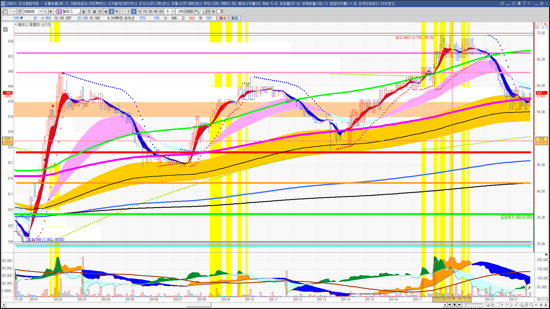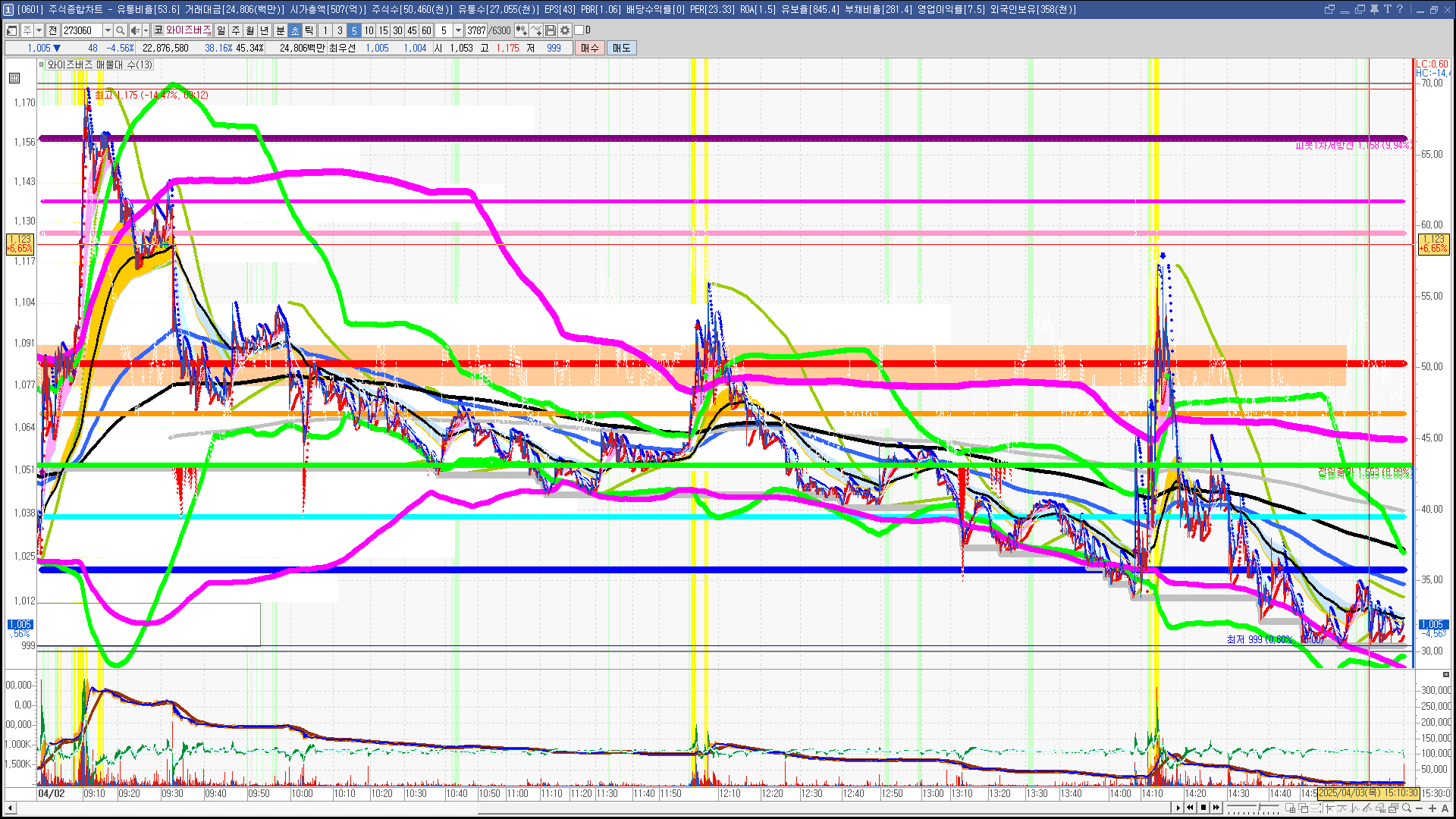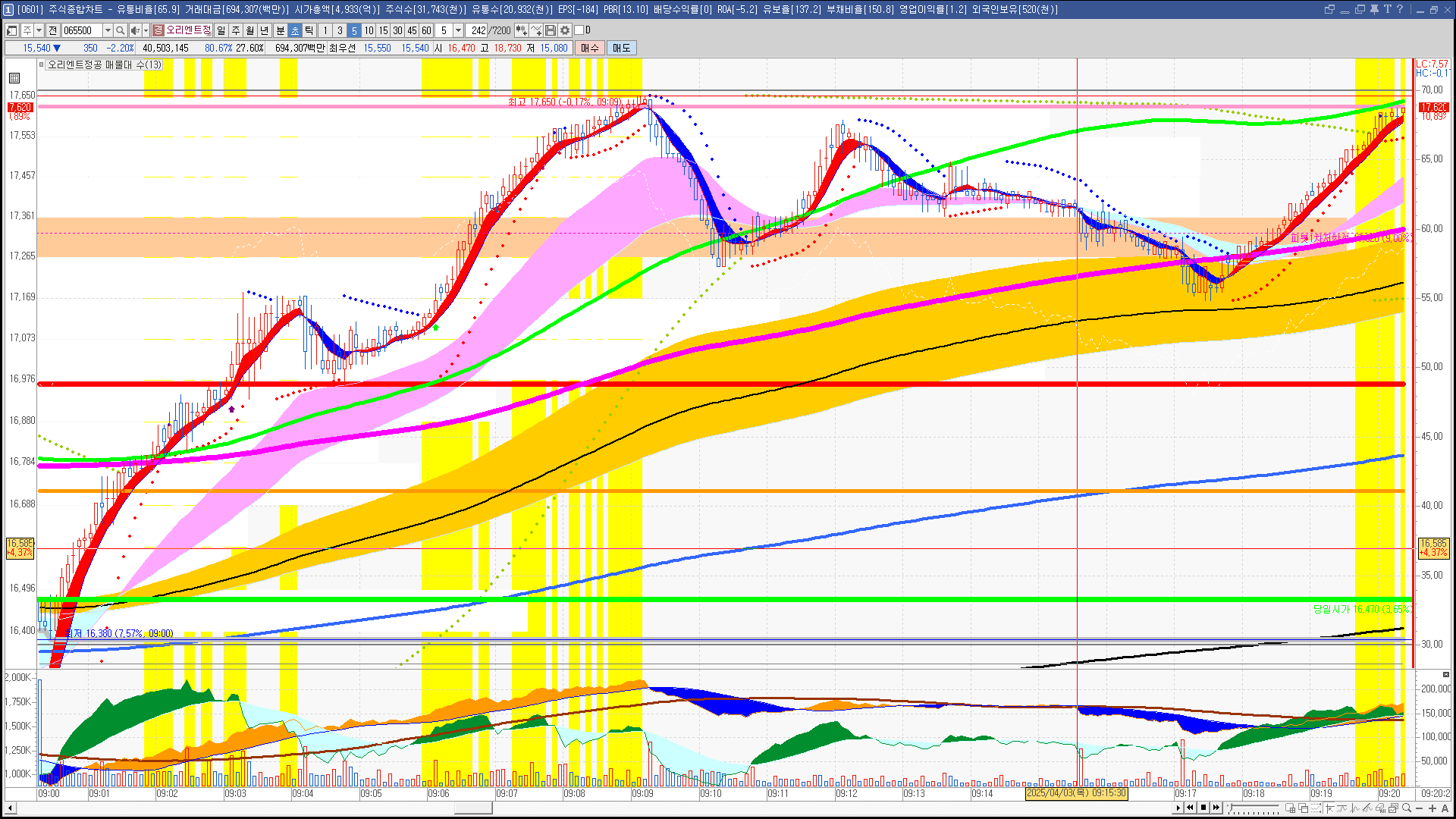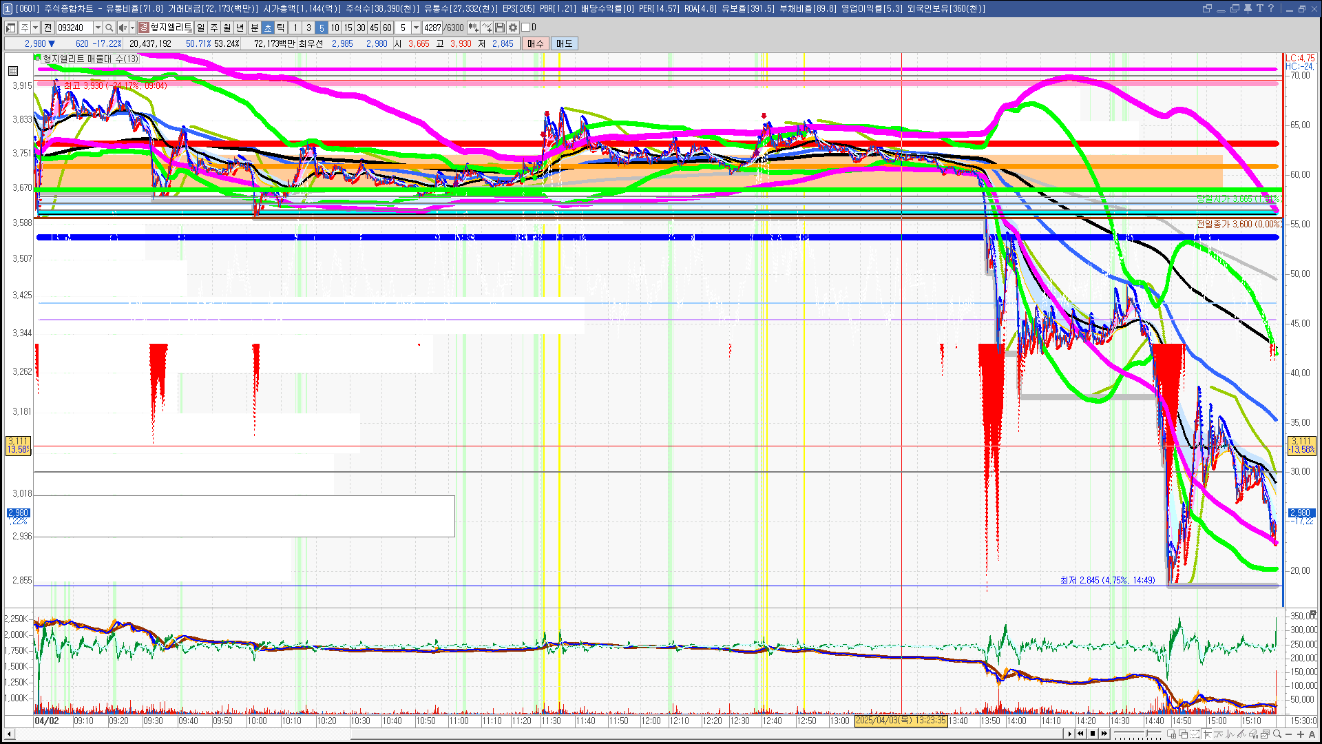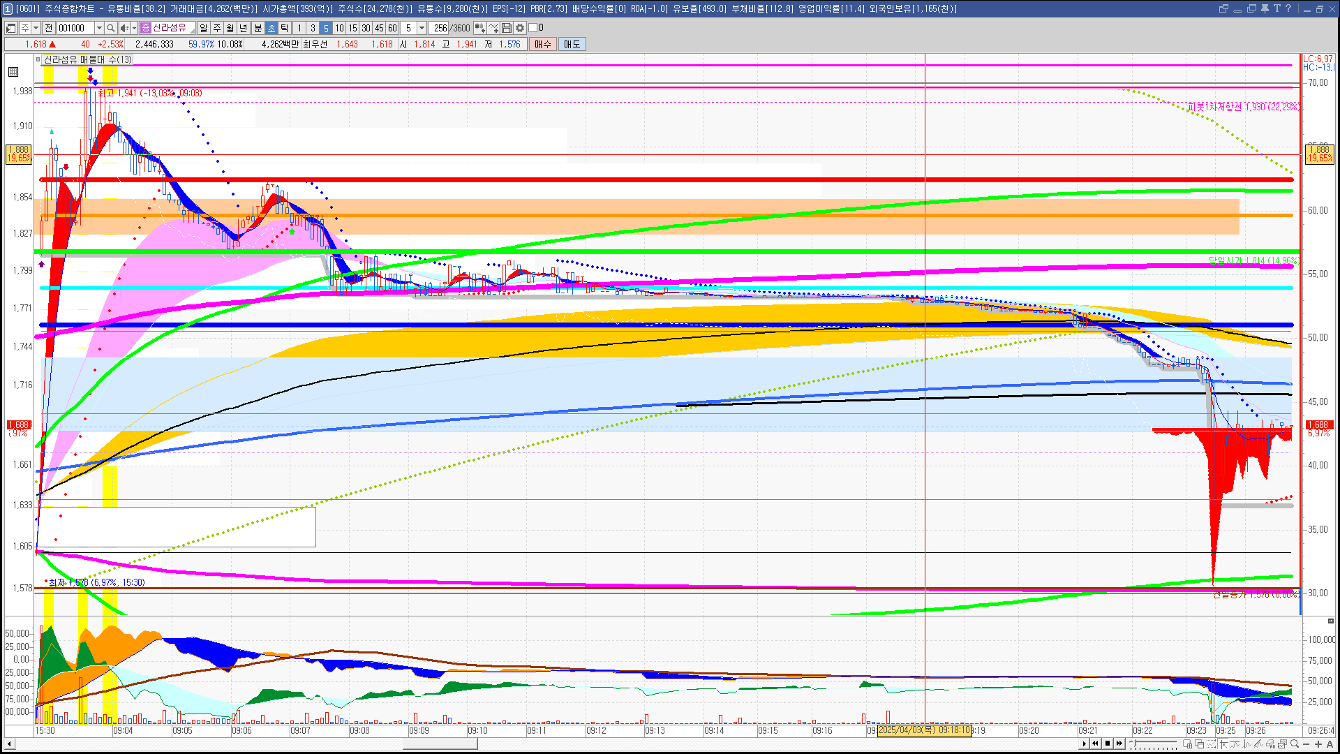 | 빨강 3% | 주황 1.5% | 녹색 시가 | 옥색 -1.5% | 파랑 -3% | 회색 저가 | 갈색 전일종가 | 장미7% | 분홍8% | 보라 10% |