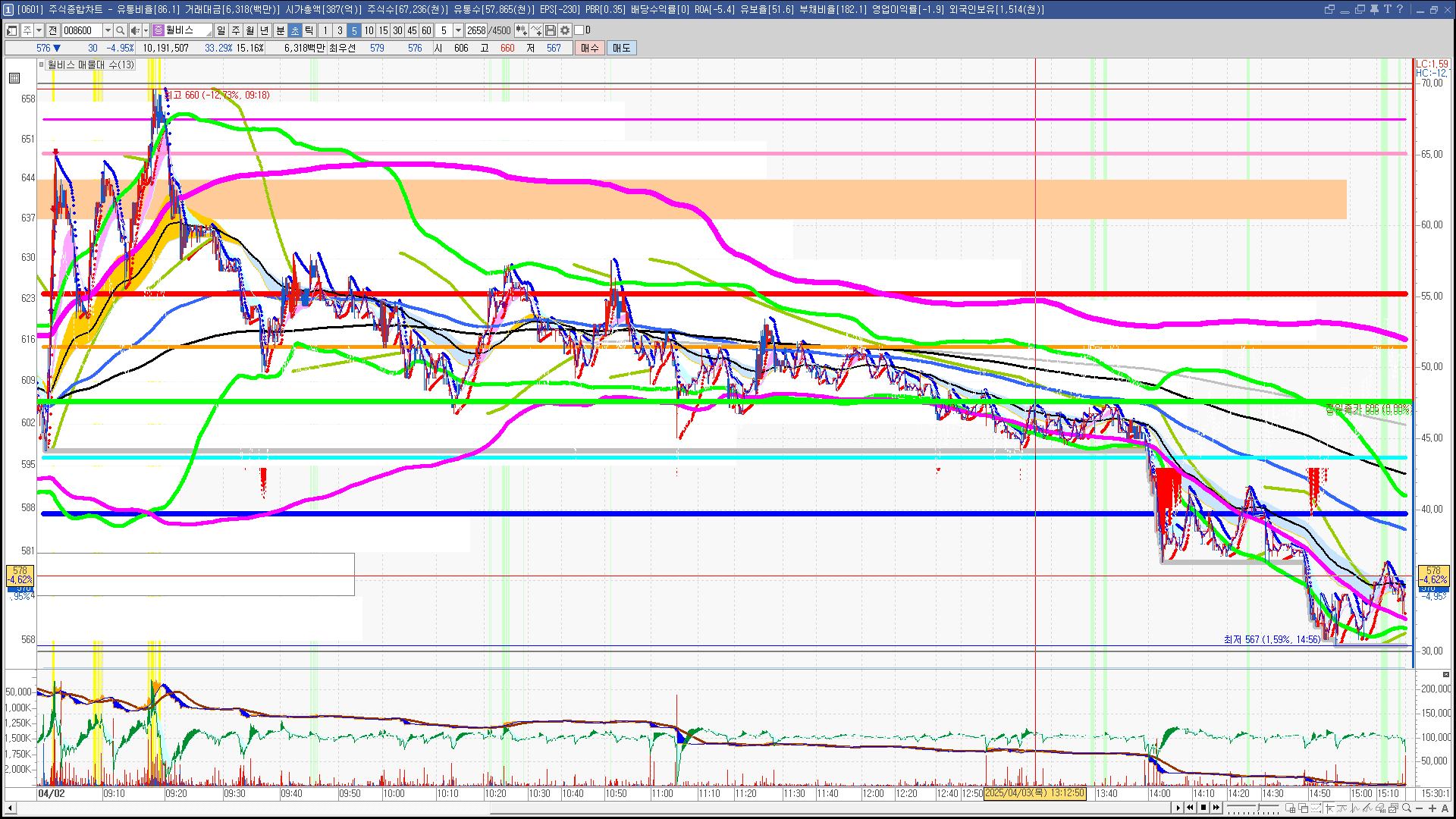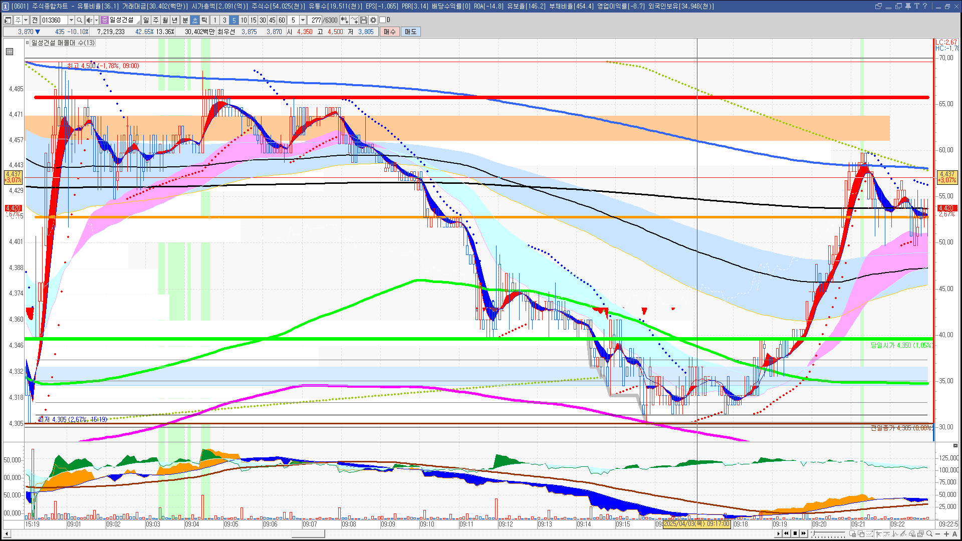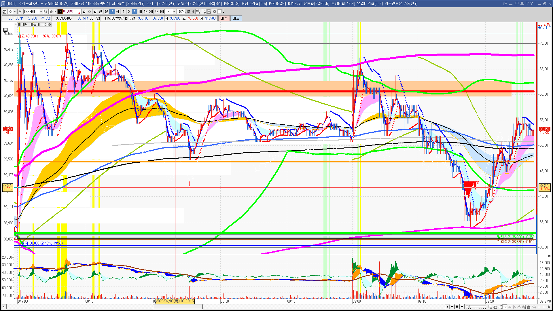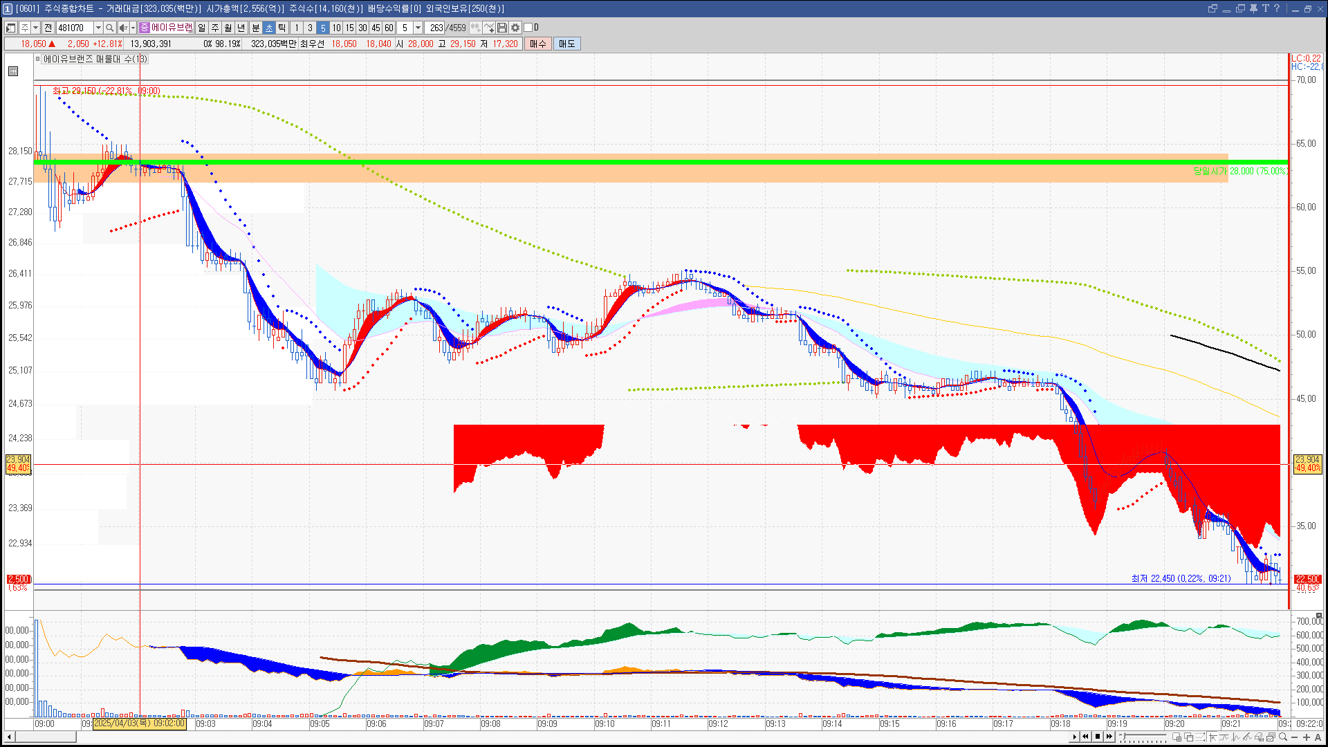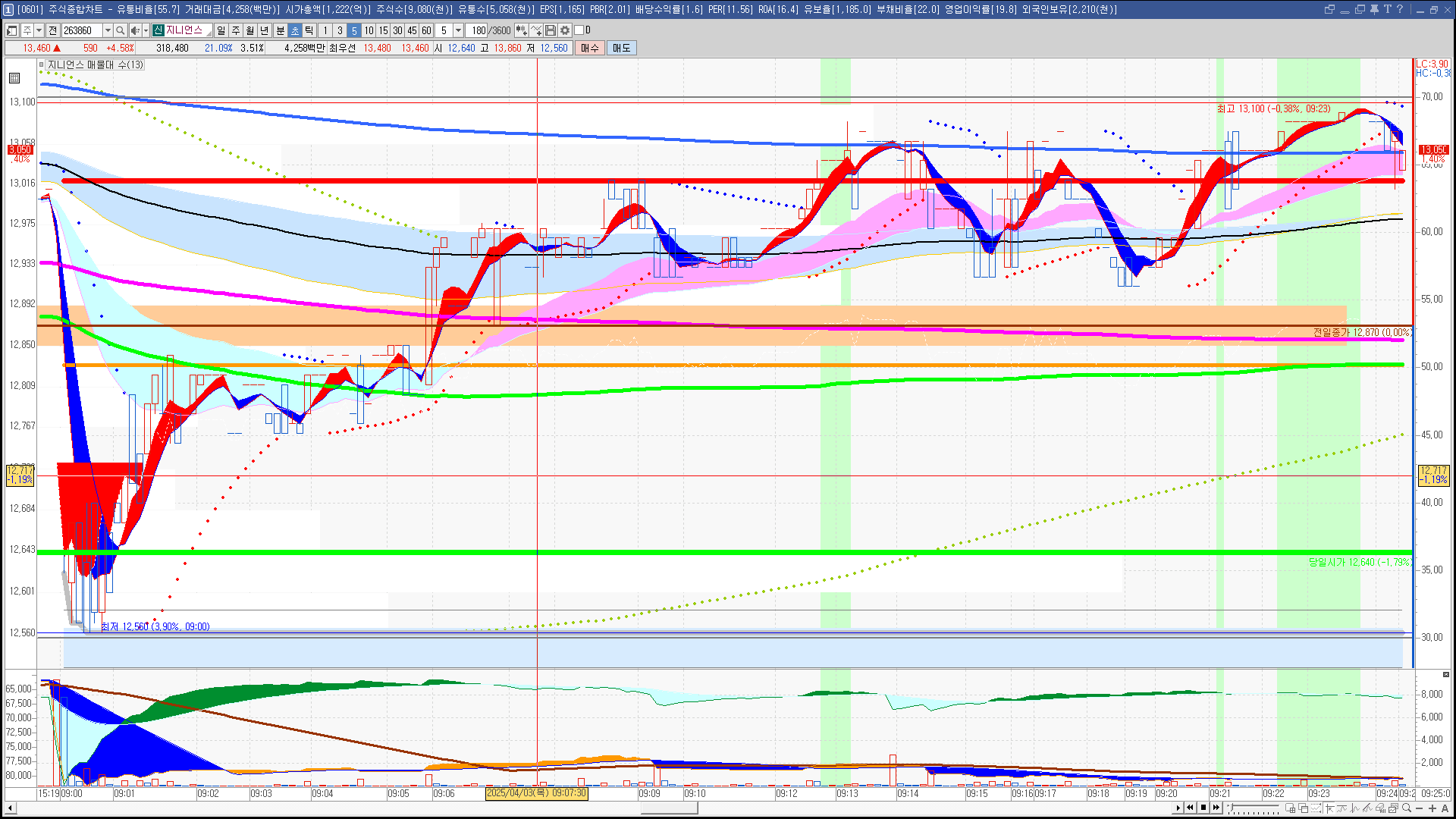 | 빨강 3% | 주황 1.5% | 녹색 시가 | 옥색 -1.5% | 파랑 -3% | 회색 저가 | 갈색 전일종가 | 장미7% | 분홍8% | 보라 10% |
