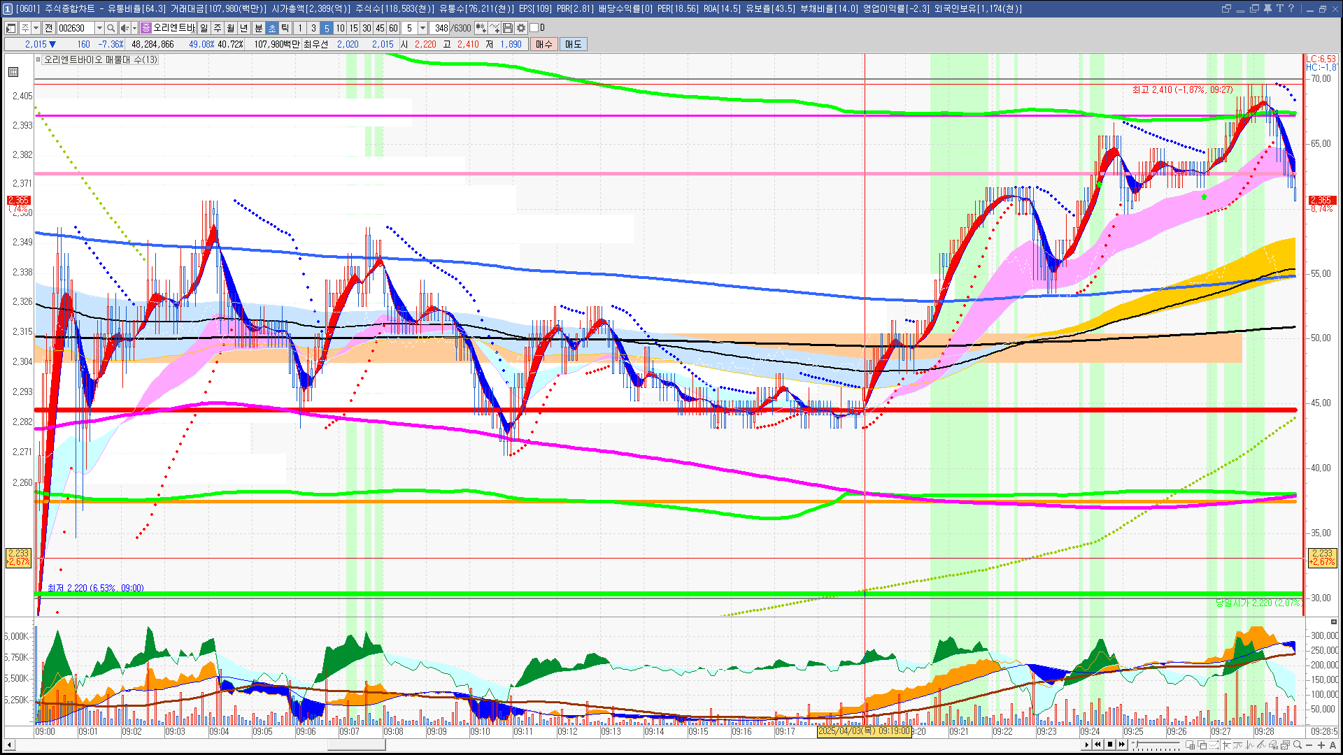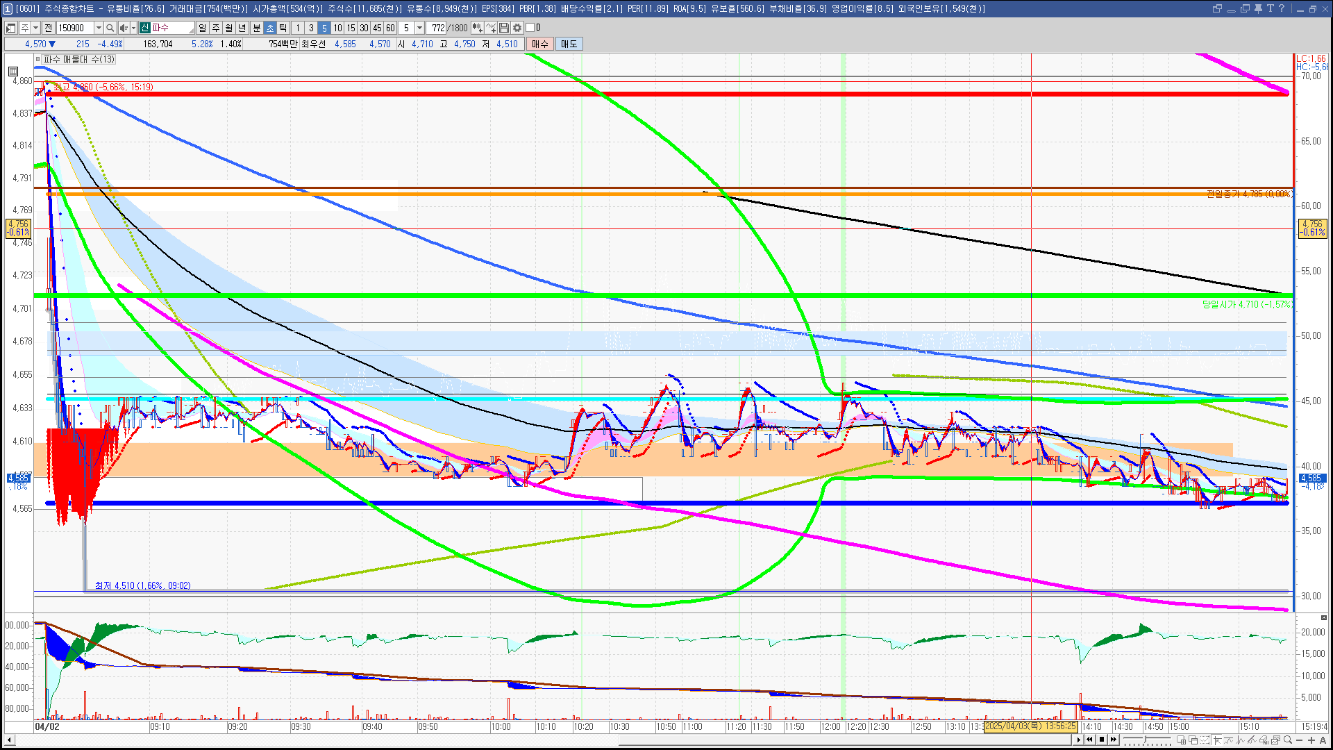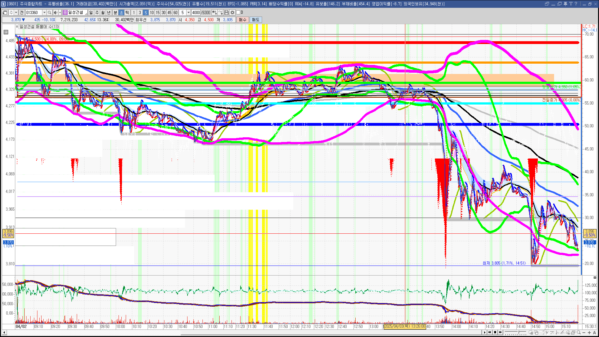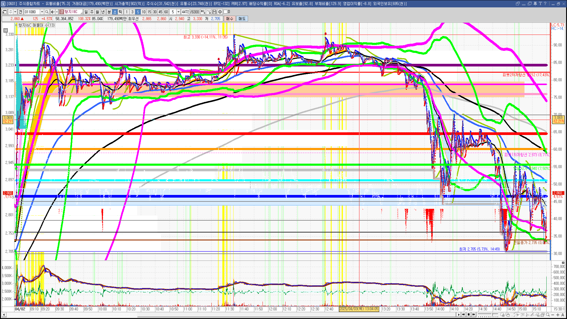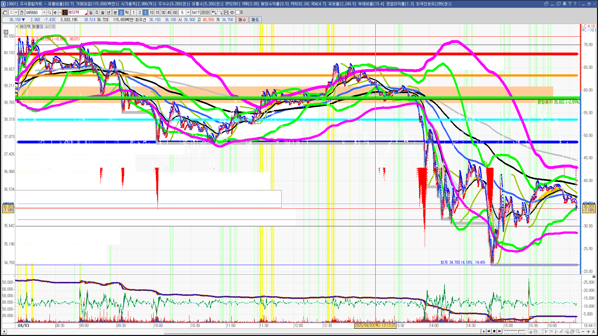 | 빨강 3% | 주황 1.5% | 녹색 시가 | 옥색 -1.5% | 파랑 -3% | 회색 저가 | 갈색 전일종가 | 장미7% | 분홍8% | 보라 10% |