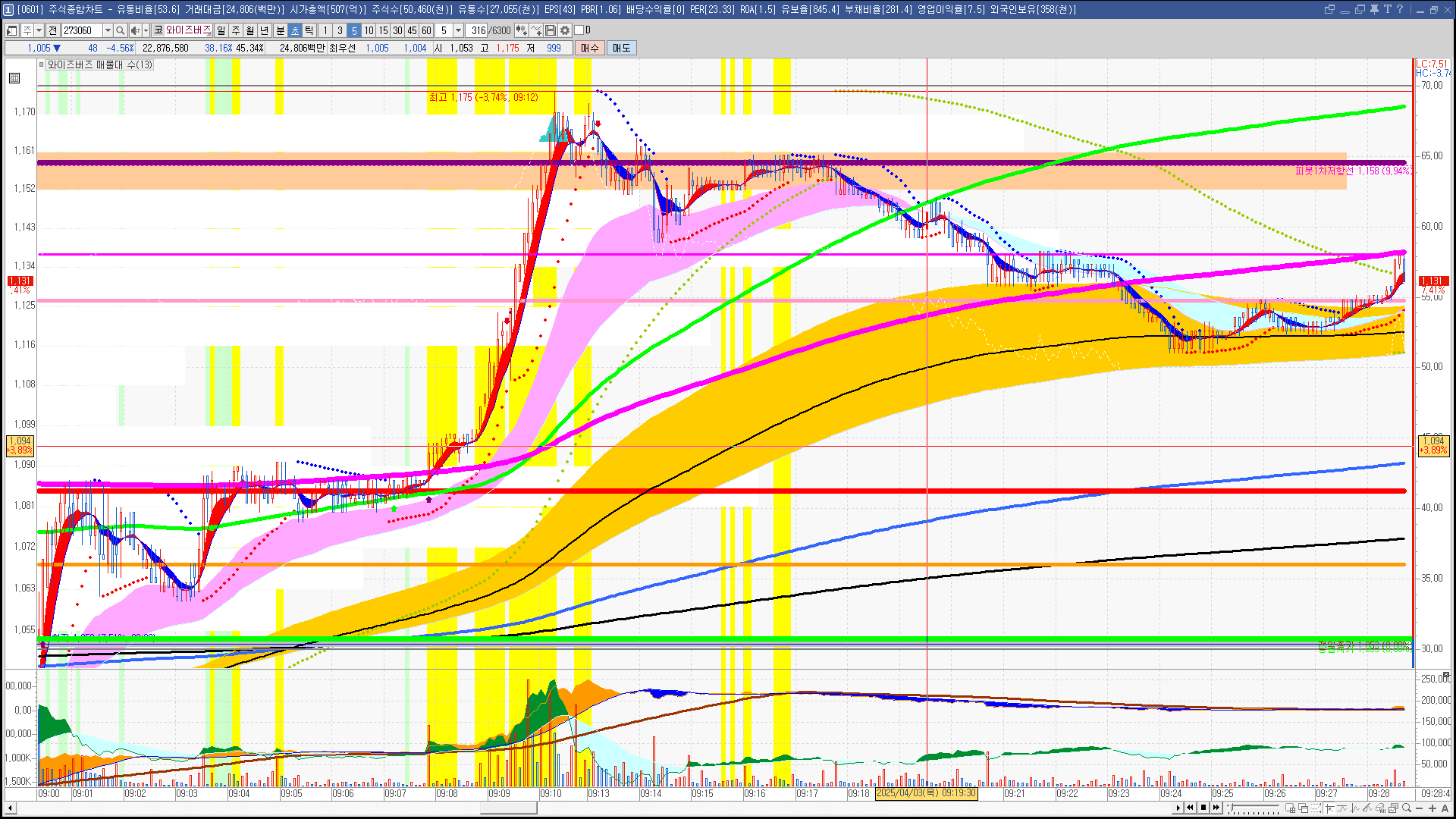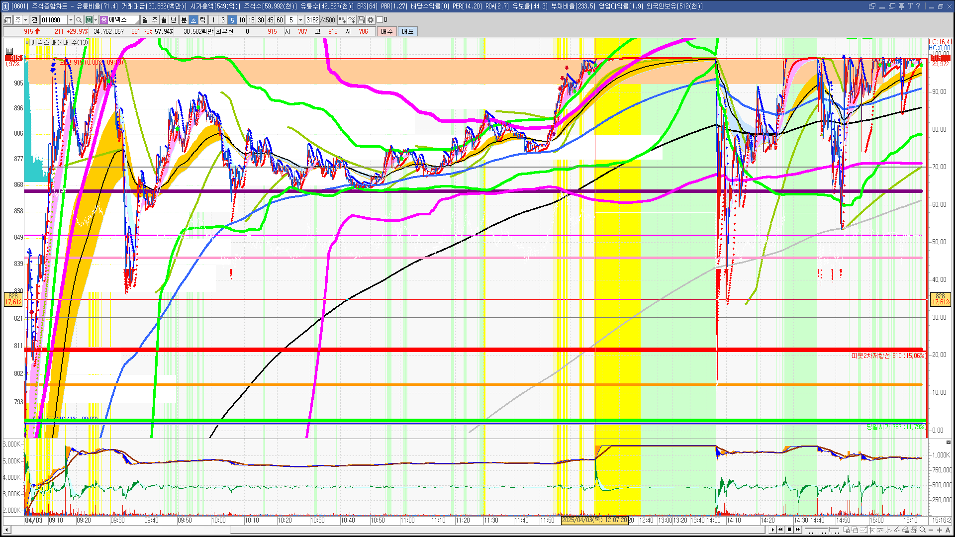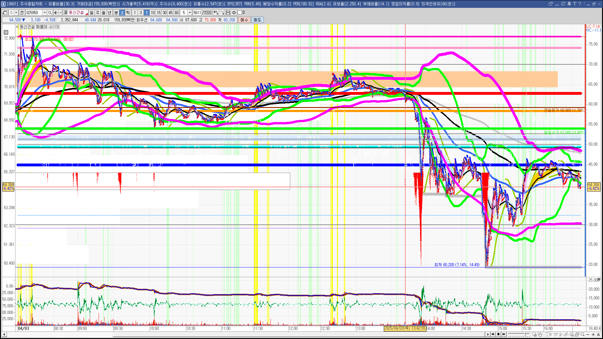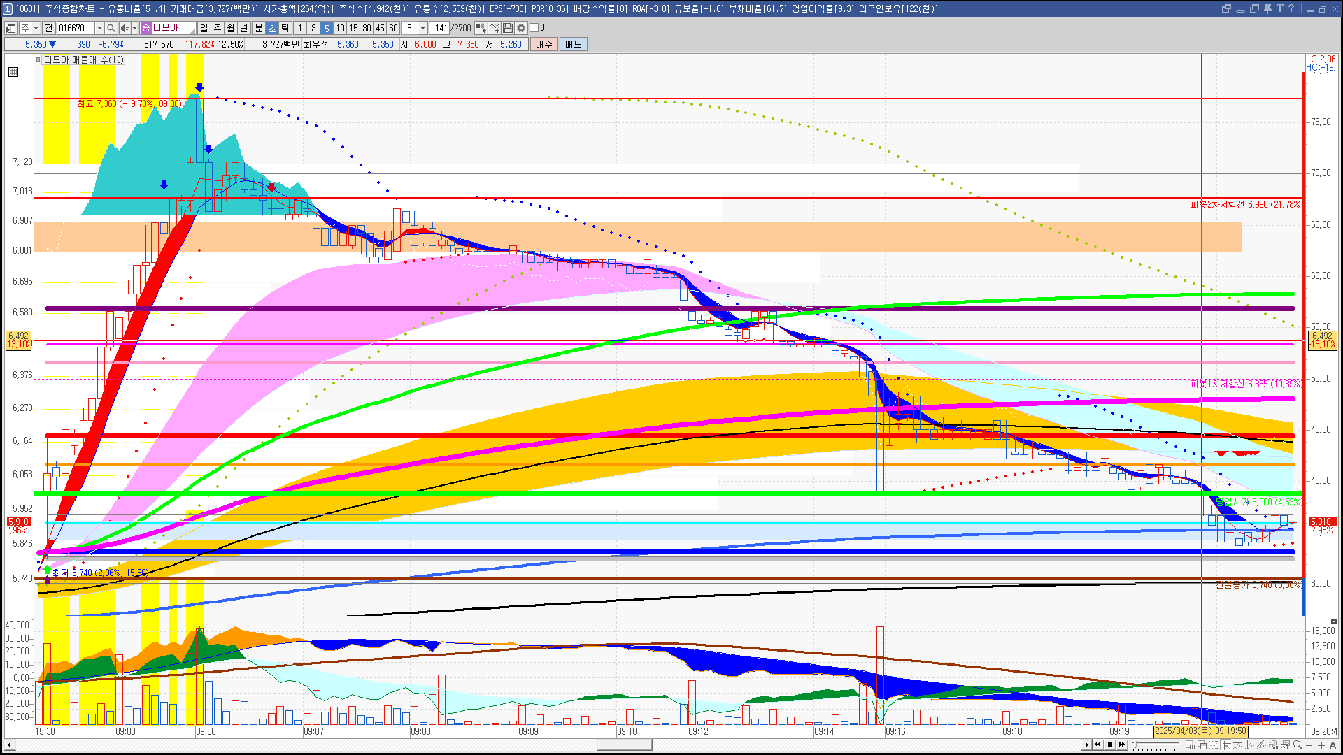 | 빨강 3% | 주황 1.5% | 녹색 시가 | 옥색 -1.5% | 파랑 -3% | 회색 저가 | 갈색 전일종가 | 장미7% | 분홍8% | 보라 10% |