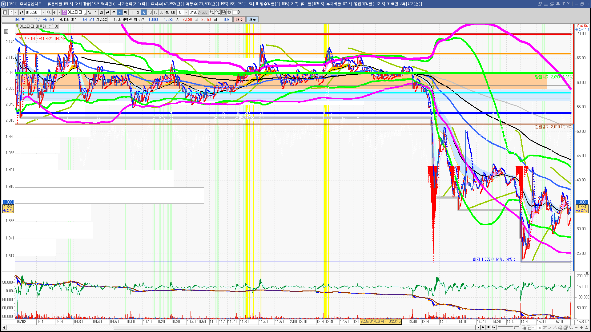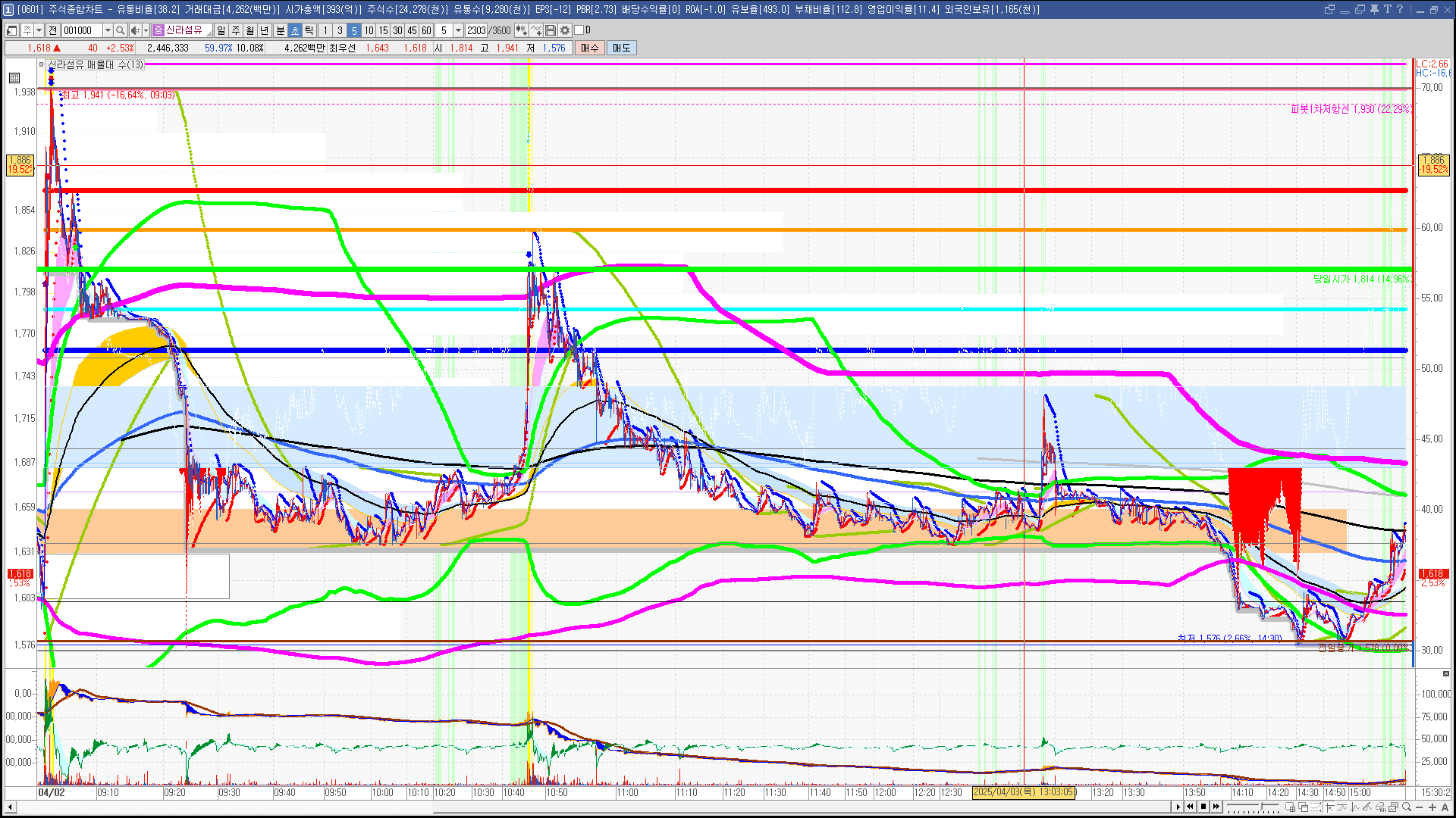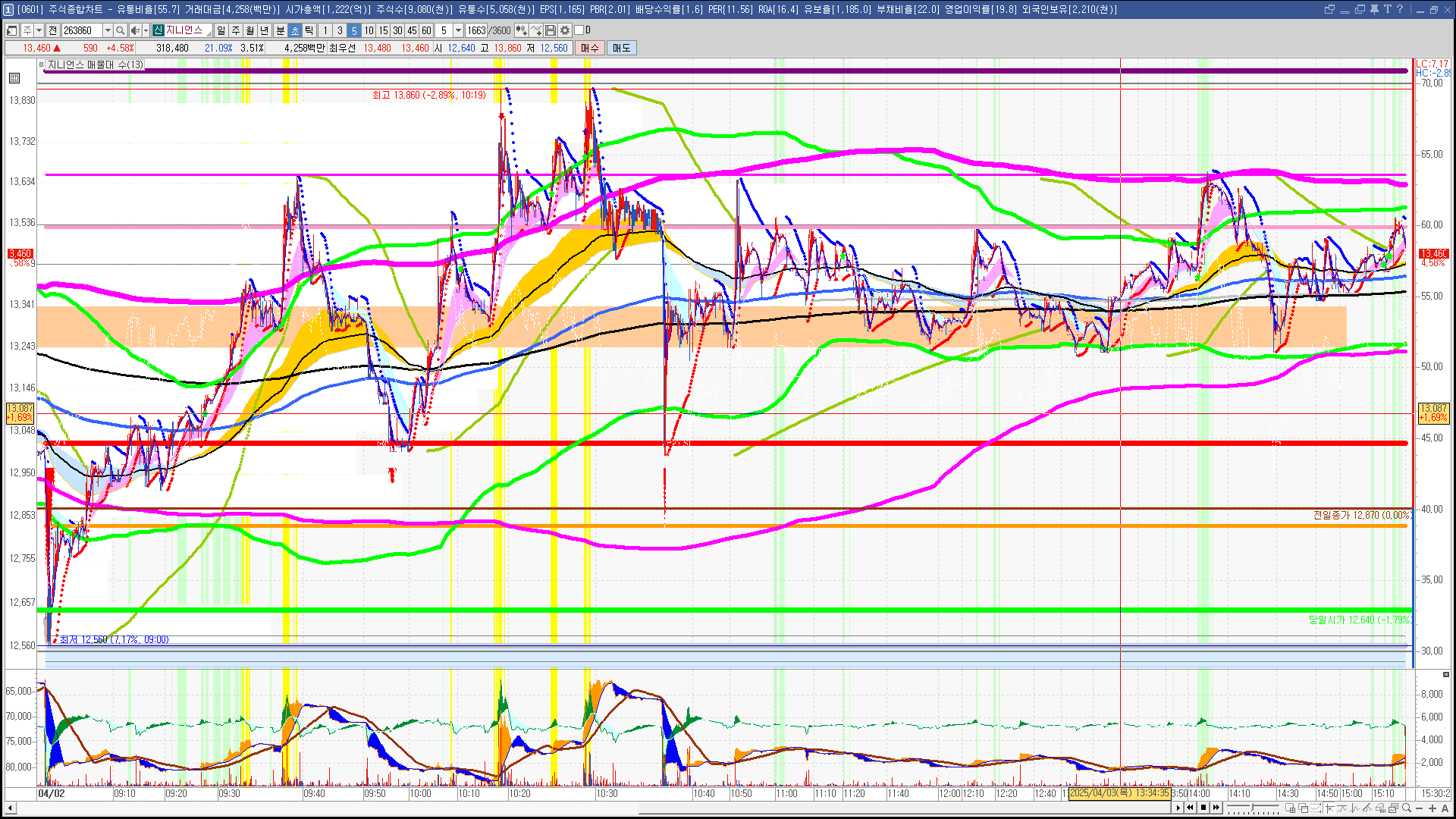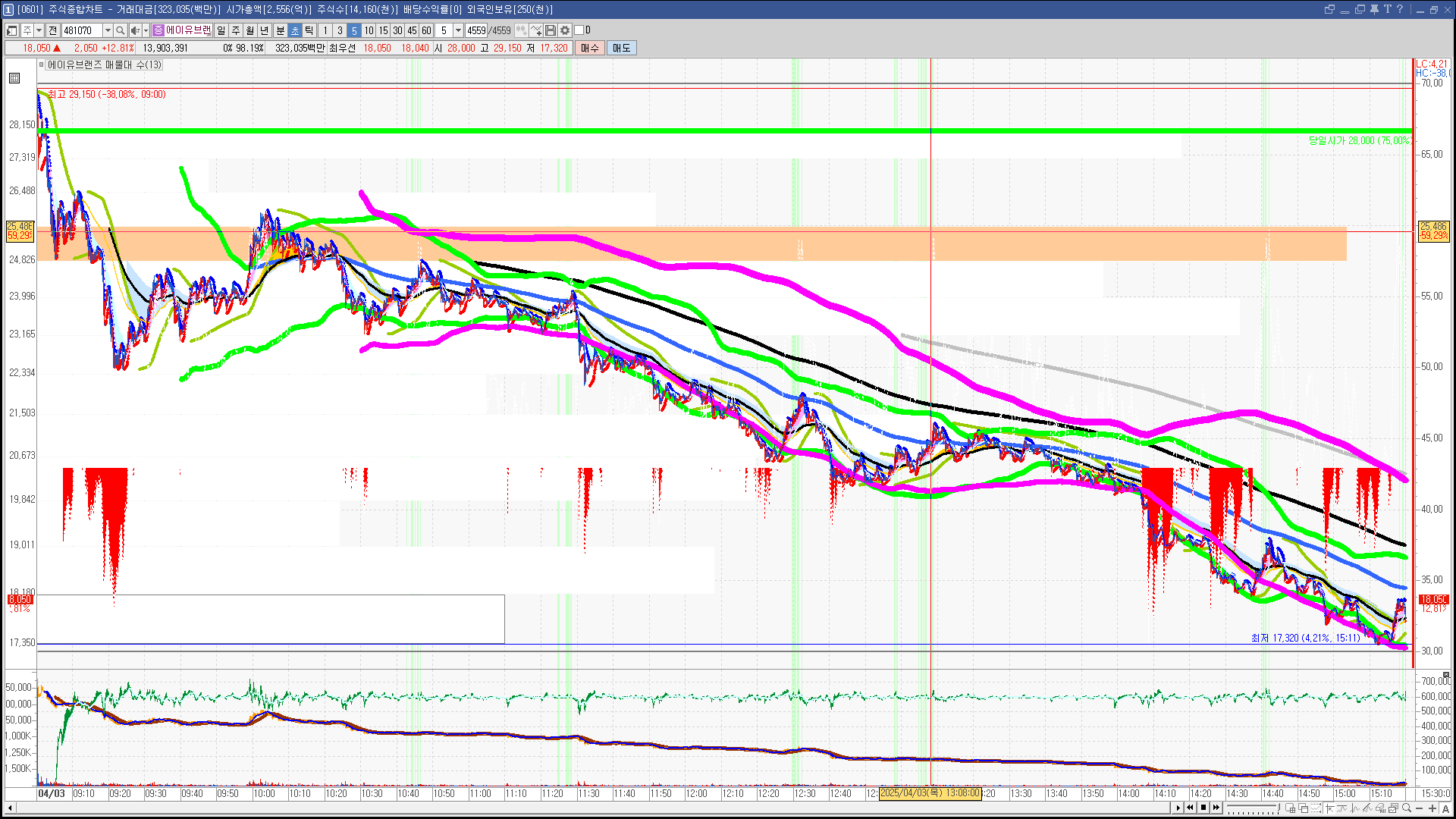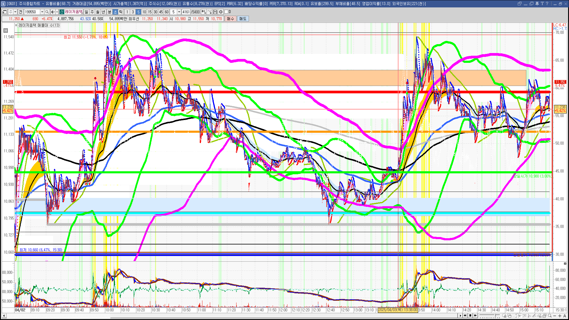 | 빨강 3% | 주황 1.5% | 녹색 시가 | 옥색 -1.5% | 파랑 -3% | 회색 저가 | 갈색 전일종가 | 장미7% | 분홍8% | 보라 10% |