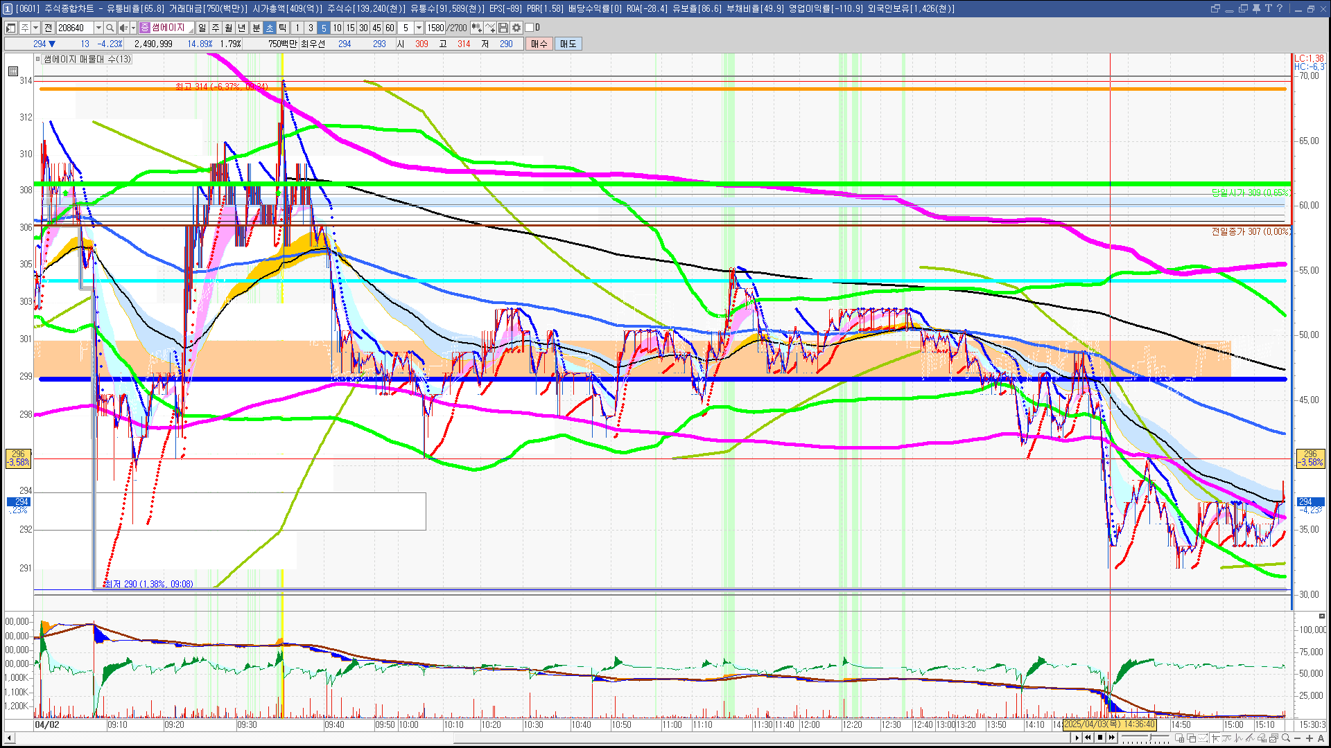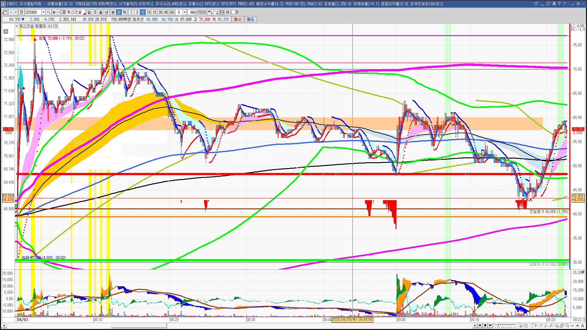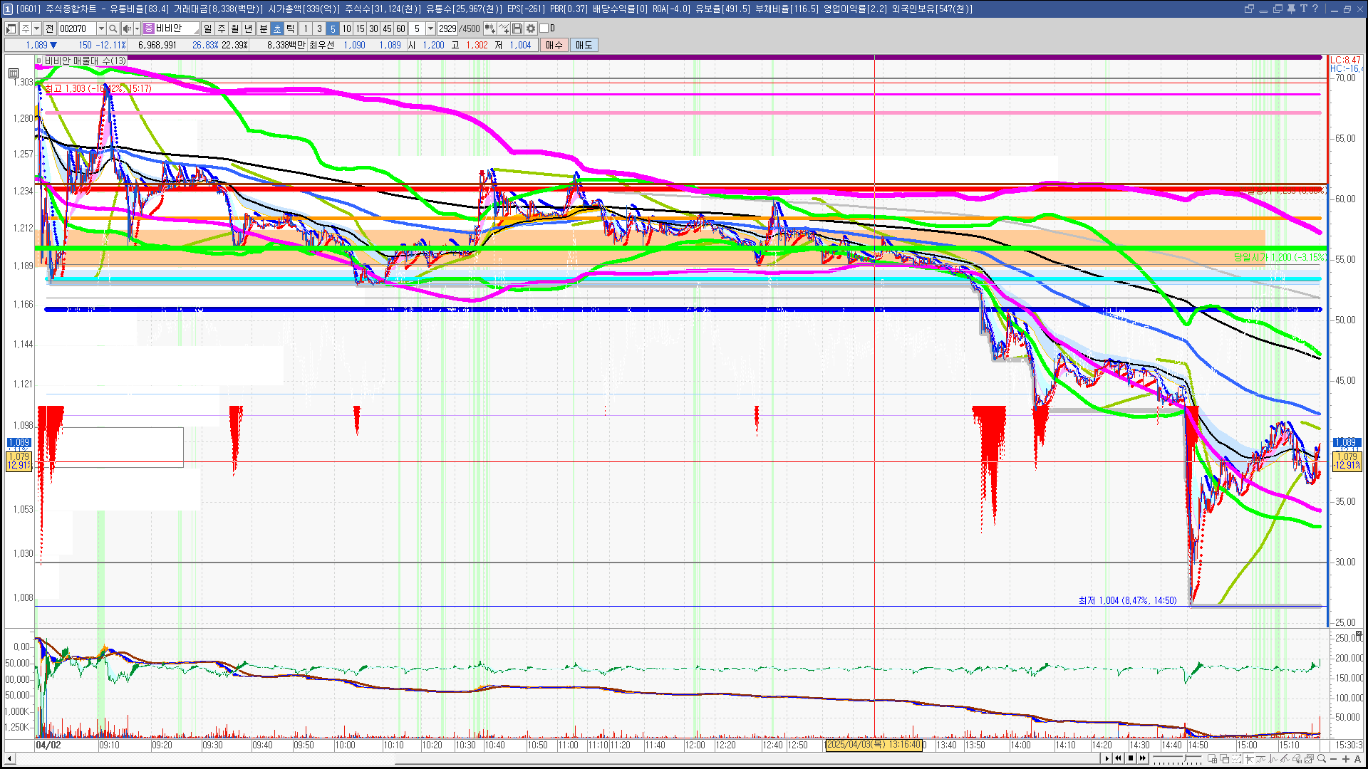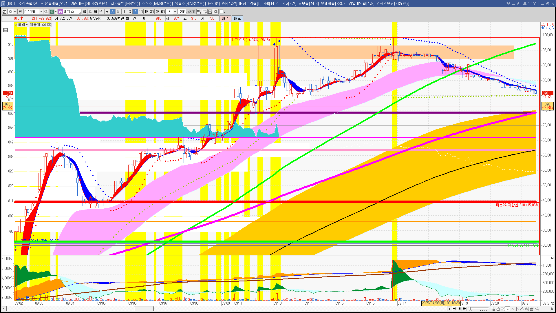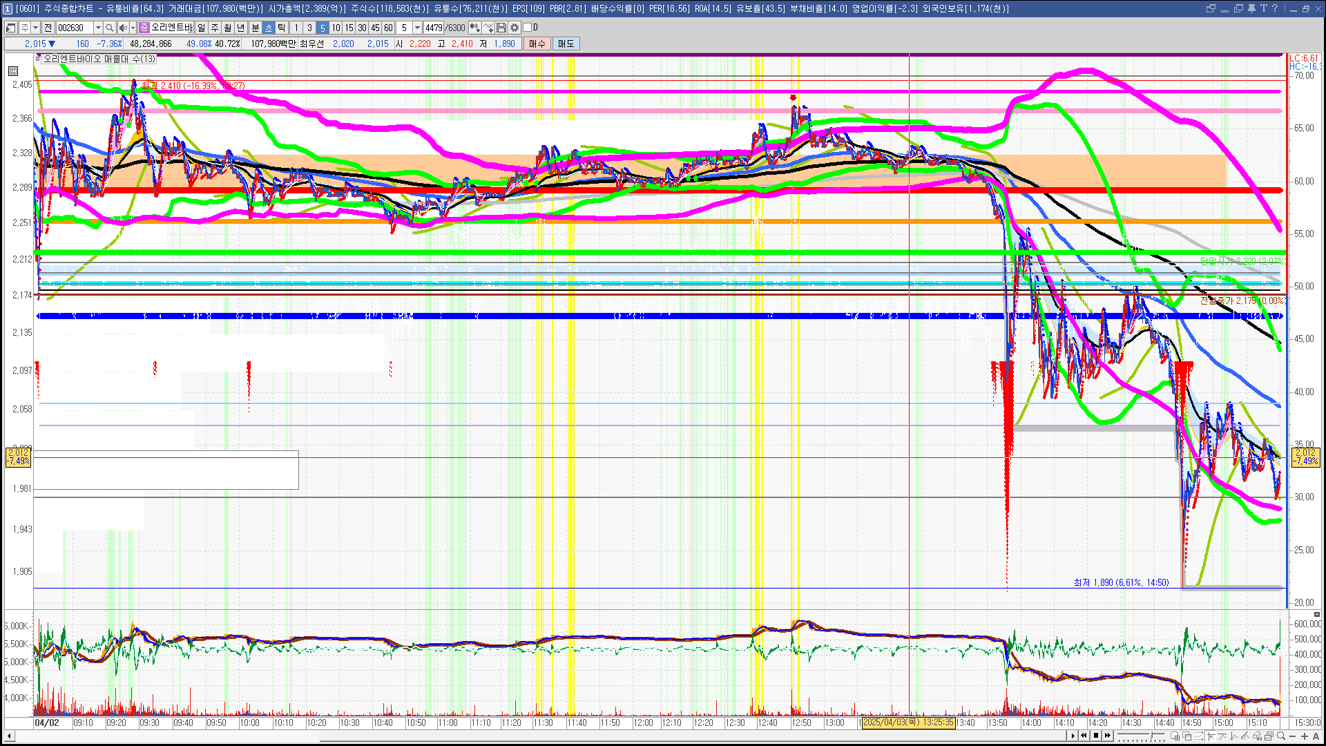 | 빨강 3% | 주황 1.5% | 녹색 시가 | 옥색 -1.5% | 파랑 -3% | 회색 저가 | 갈색 전일종가 | 장미7% | 분홍8% | 보라 10% |