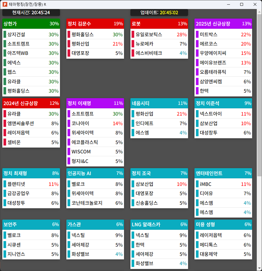 | 금융감독원, 정치테마주 관련 특별단속반 가동 및 집중감시 실시 이재명 : 토탈소프트, 수산아이앤티, 코이즈, 일성건설, 이스타코, 디젠스, 오리엔트바이오, 동신건설, 카스, 오리엔트정공, 와토스코리아, 이노룰스, 형지엘리트, 형지I&C , CS, 엔에프씨, 에이텍, 에이텍모빌리티, 코나아이, 신라에스지, 플랜티넷, WISCOM, 슈프리마에이치큐, 동원금속 우원식 : 케어랩스, 유비온, 뱅크웨이글로벌, 코오롱모빌리티그룹, 효성오앤비, 대원전선, 삼천리자전거, 코오롱, 네오오토, 고려제약, 푸른저축은행 한동훈 : 디티앤씨알오, 대상홀딩스, 오파스넷, 태양금속, 원티드랩 이준석, 홍준표 : 삼보산업, 넥스트아이, 휴맥스홀딩스, 휴맥스 김문수 : 평화홀딩스 평화산업 밸로프 원풍물산 사조씨푸드 대영포장 체리부로 한솔홈데코 사조오양 우원개발 화신정공 옵티시스 오픈놀 | |