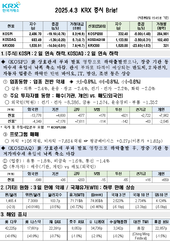 | [K-SURE 일일환율동향] 美상호관세 발표에...1,470원대 초중반 중심 등락 전망 ▶ 한국에 대한 25% 상호관세 부과 및 뉴욕증시 선물시장 급락 등에 따른 위험회피 분위기 확산에 금일 환율 상승 압력 우위 예상 ▶ 다만, 당국의 미세조정 및 수출업체 네고 물량 등은 상단을 제한할 것으로 예상 ▶ 금일 원/달러 환율 예상범위: 1,467.20~1,478.60원(금융 예상치 평균) |