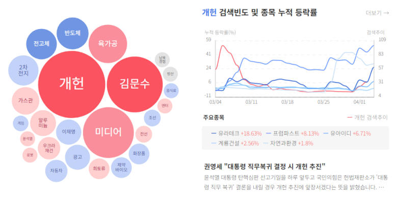 1. 웹스 (30.00%) : 화학관련주, 시총200억대, 소재&생태복원사업, 4월 4일 헌법재판소의 대통령 탄핵 관련 선고 예정 소식 등 ⇨ 대선관련주 부각