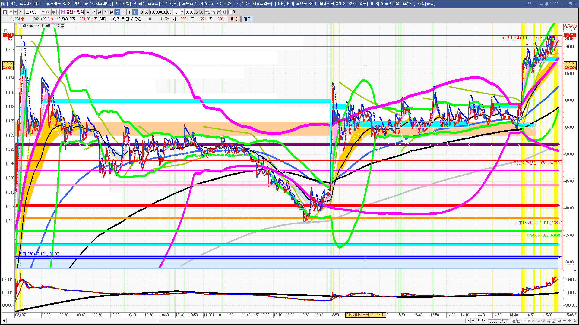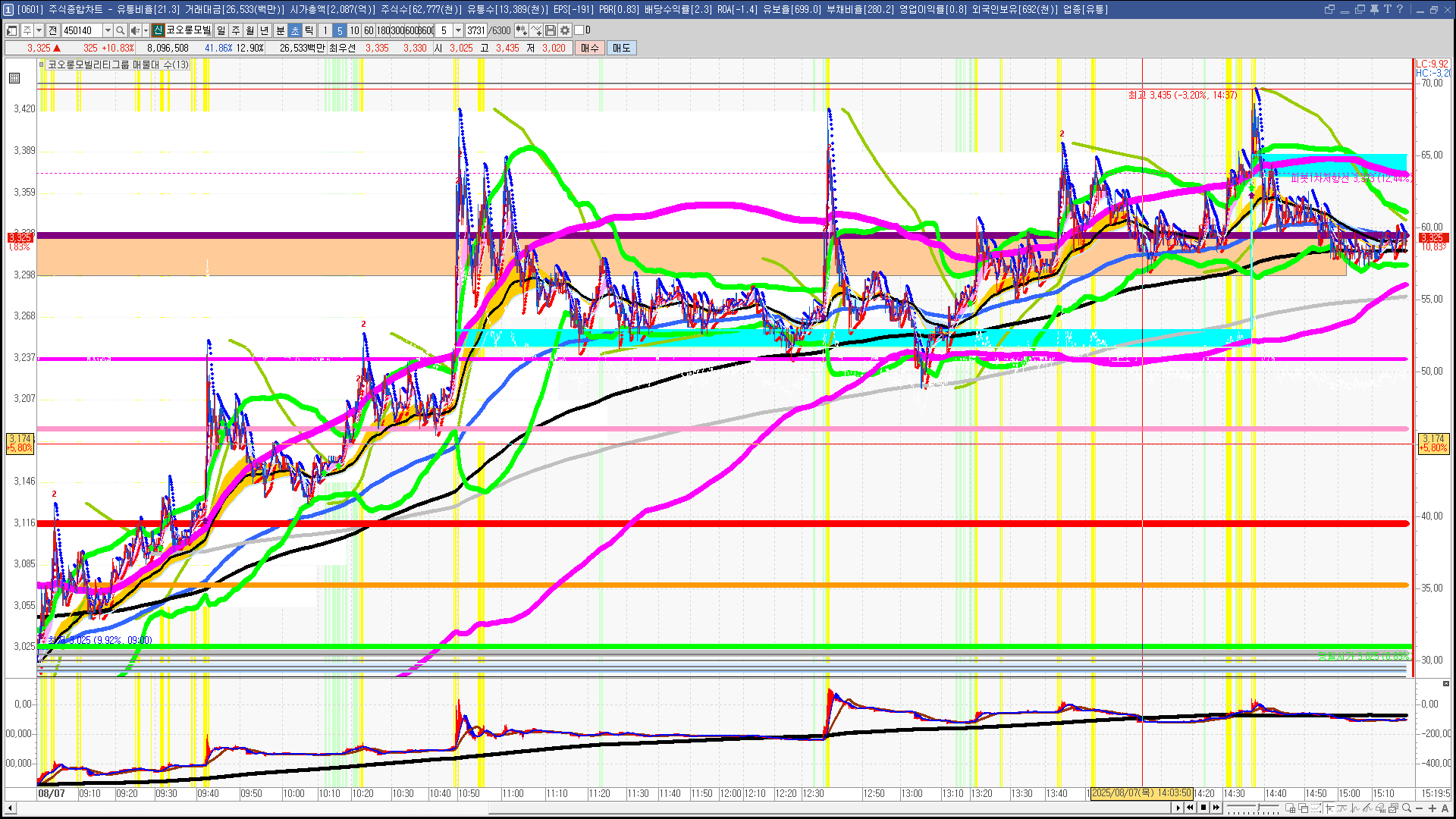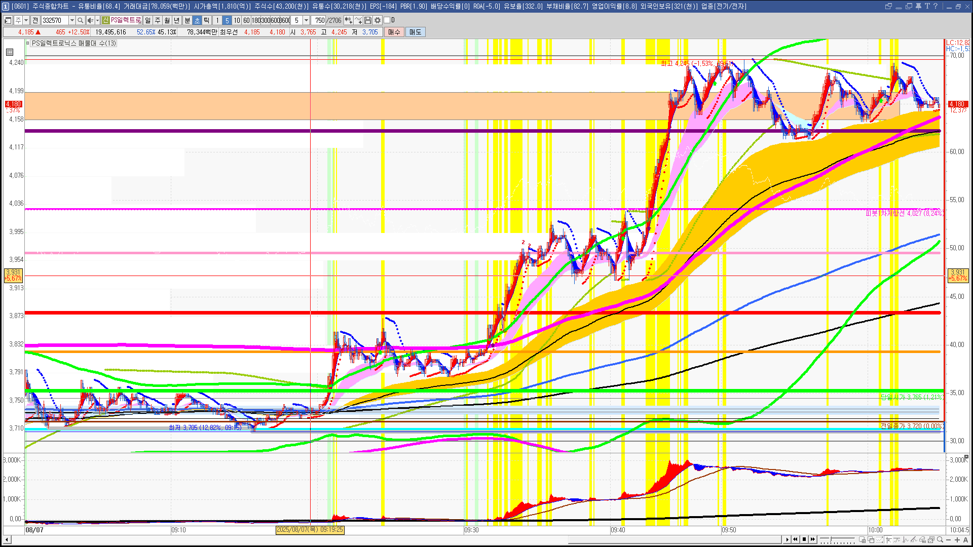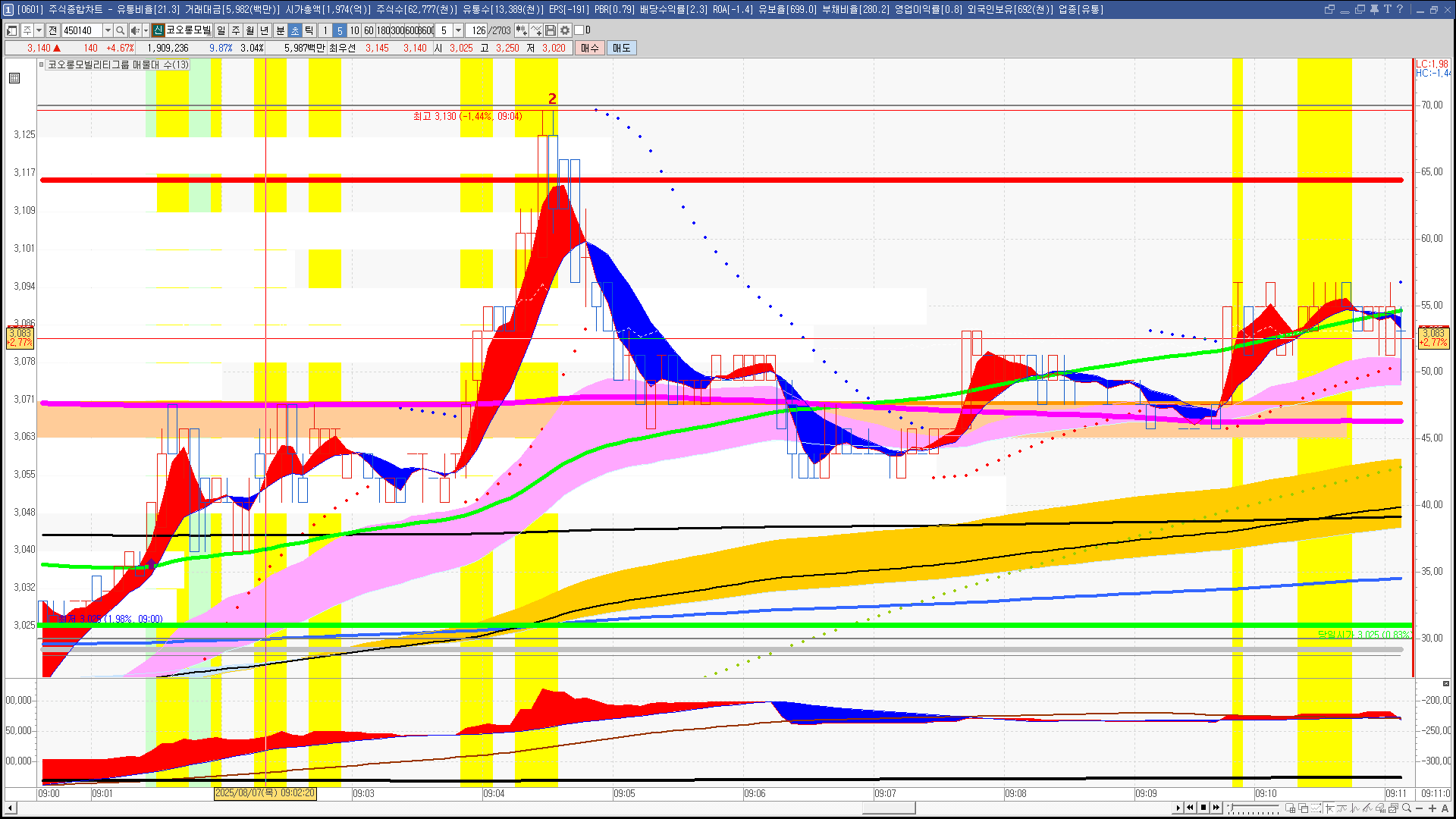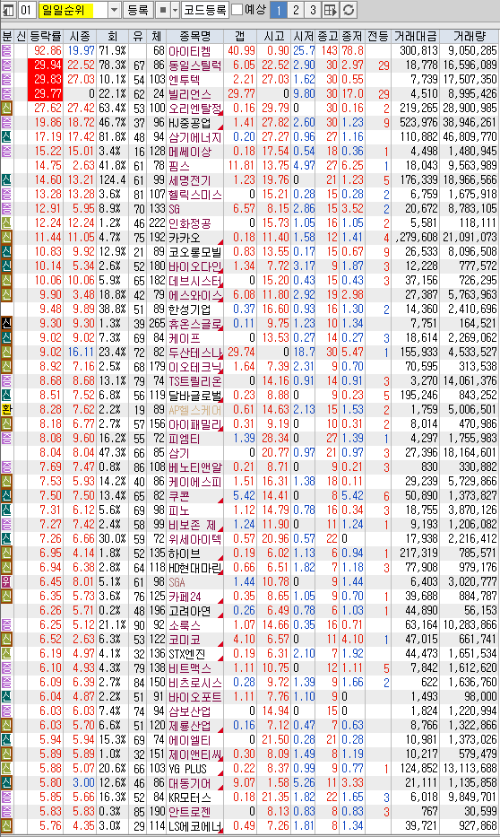 | 빨강 3% | 주황 1.5% | 녹색 시가 | 옥색 -1.5% | 파랑 -3% | 회색 저가 | 갈색 전일종가 | 장미7% | 분홍8% | 보라 10% |