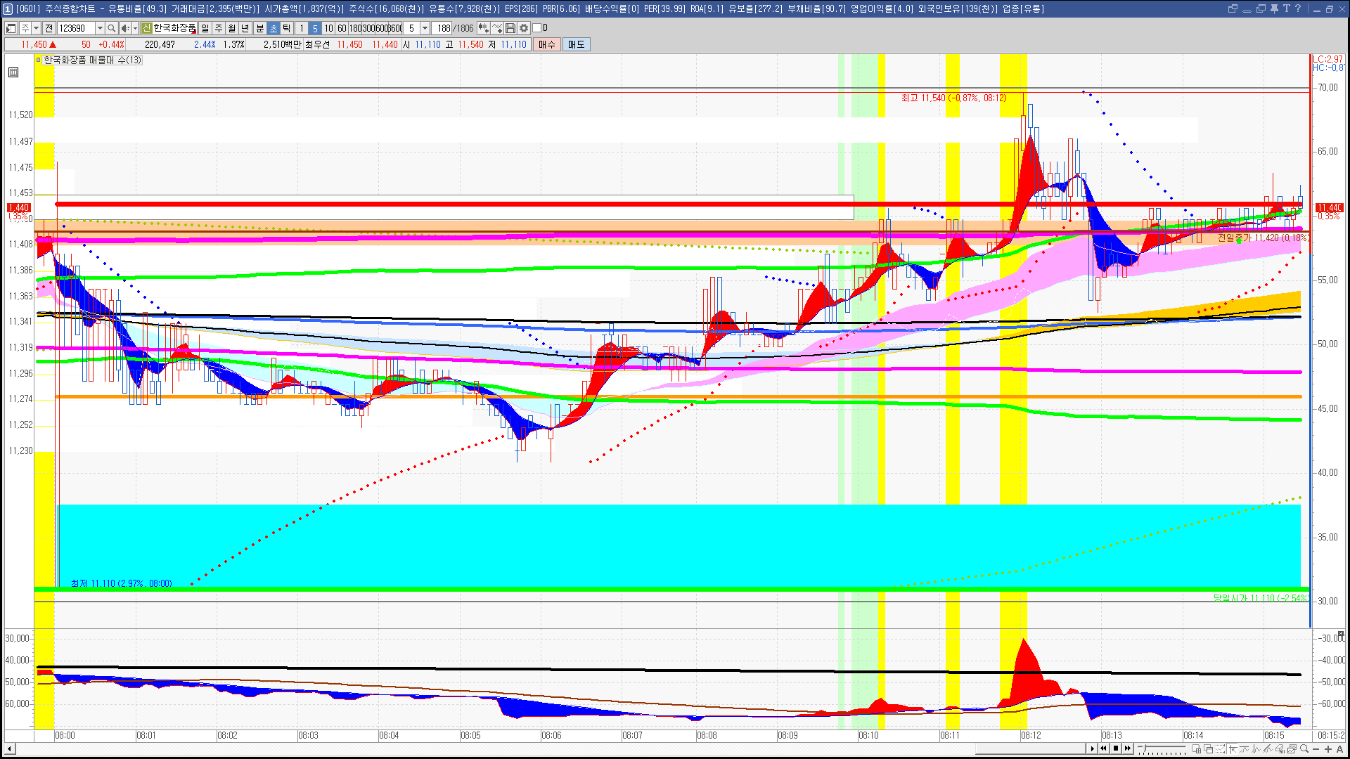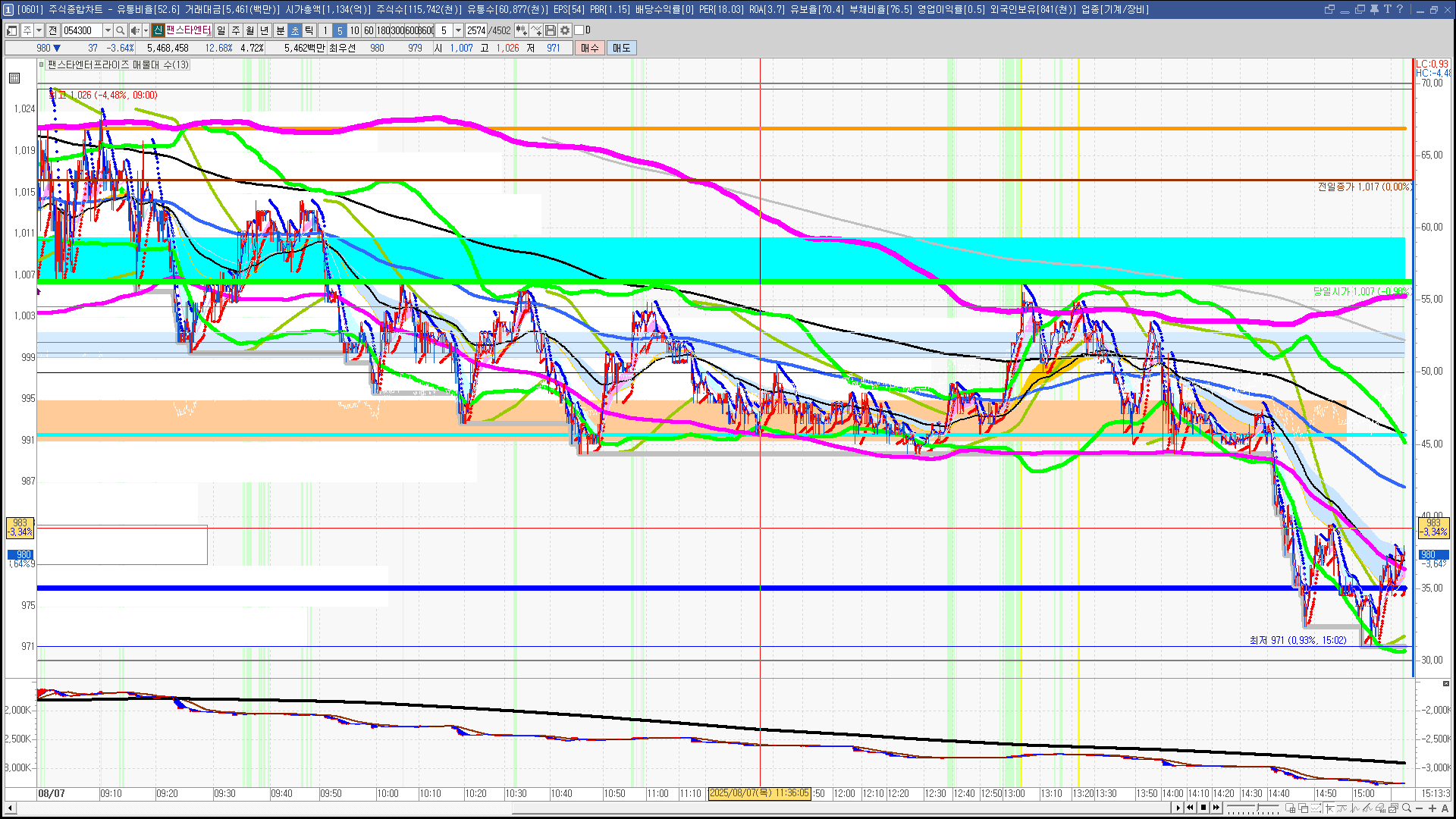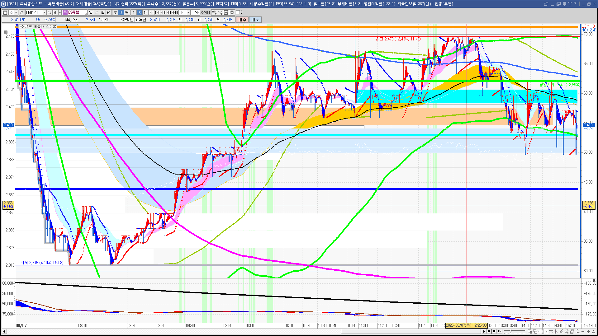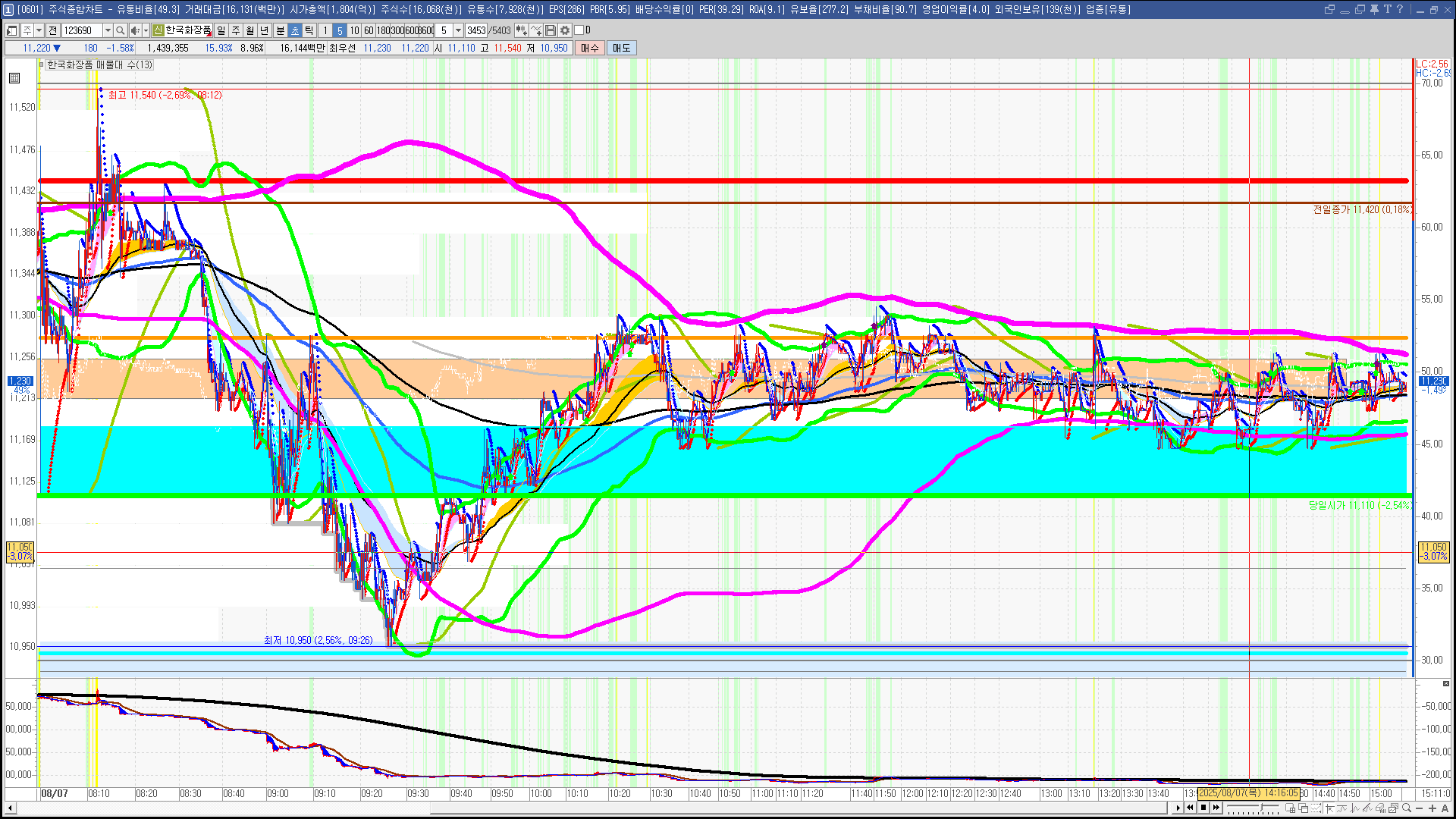| 빨강 3% | 주황 1.5% | 녹색 시가 | 옥색 -1.5% | 파랑 -3% | 회색 저가 | 갈색 전일종가 | 장미7% | 분홍8% | 보라 10% |