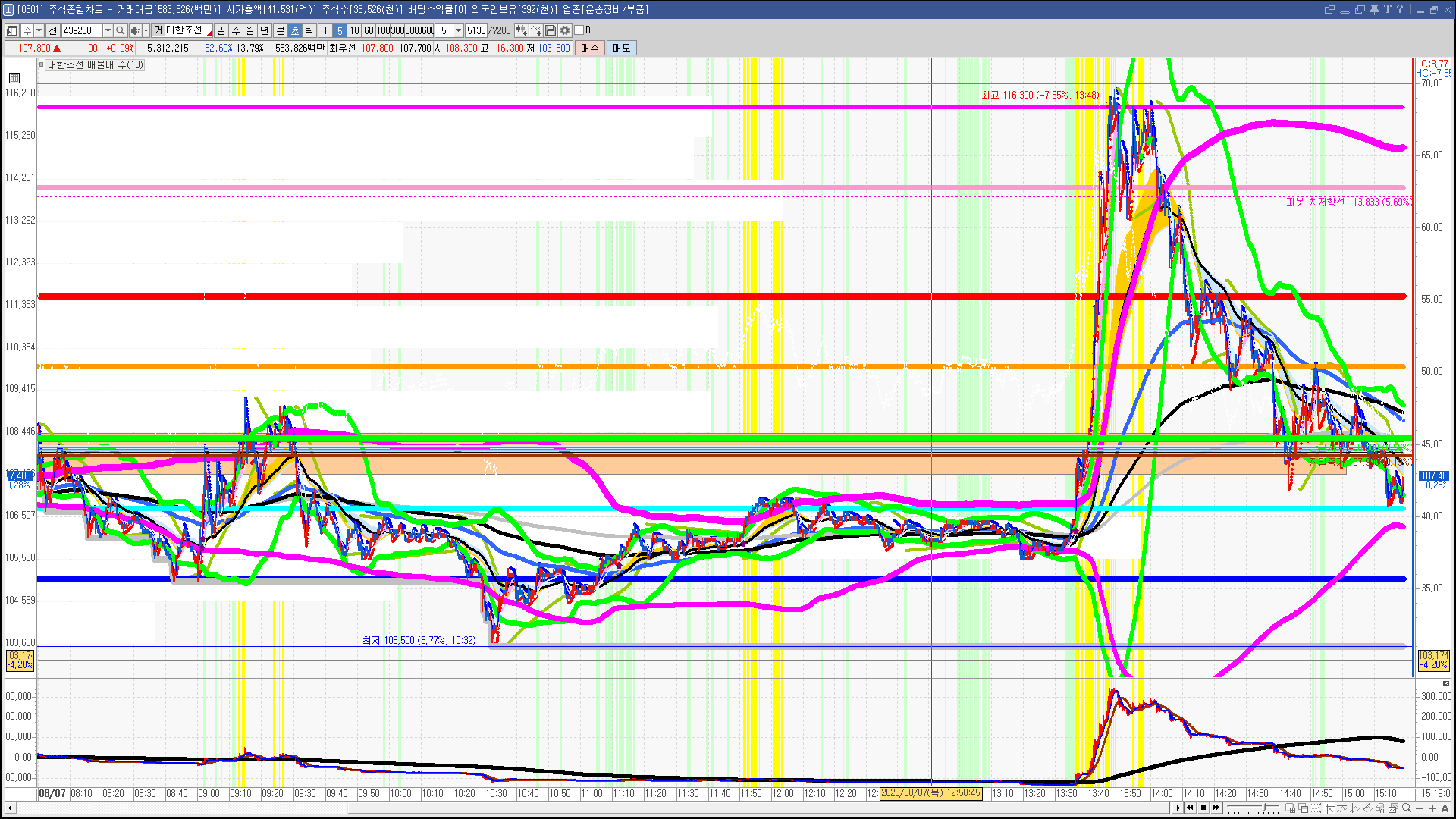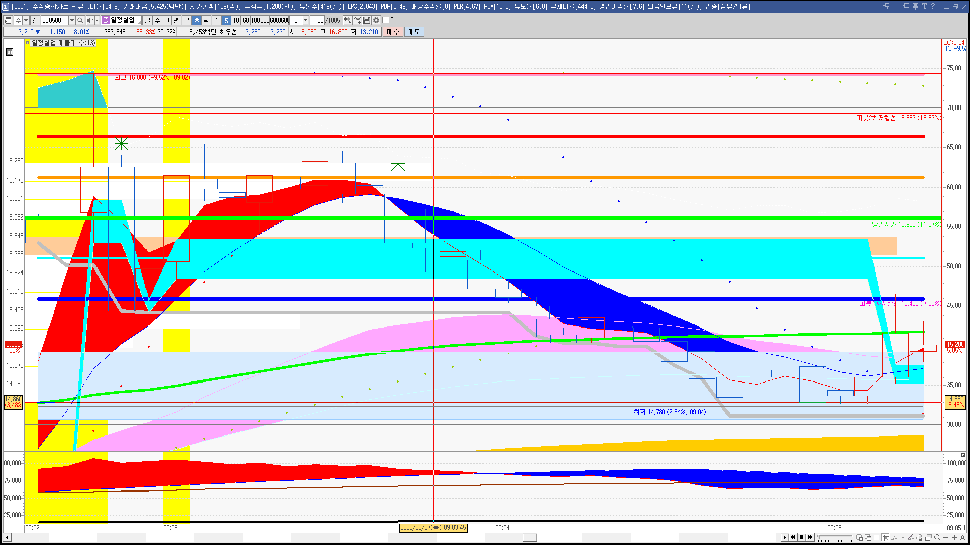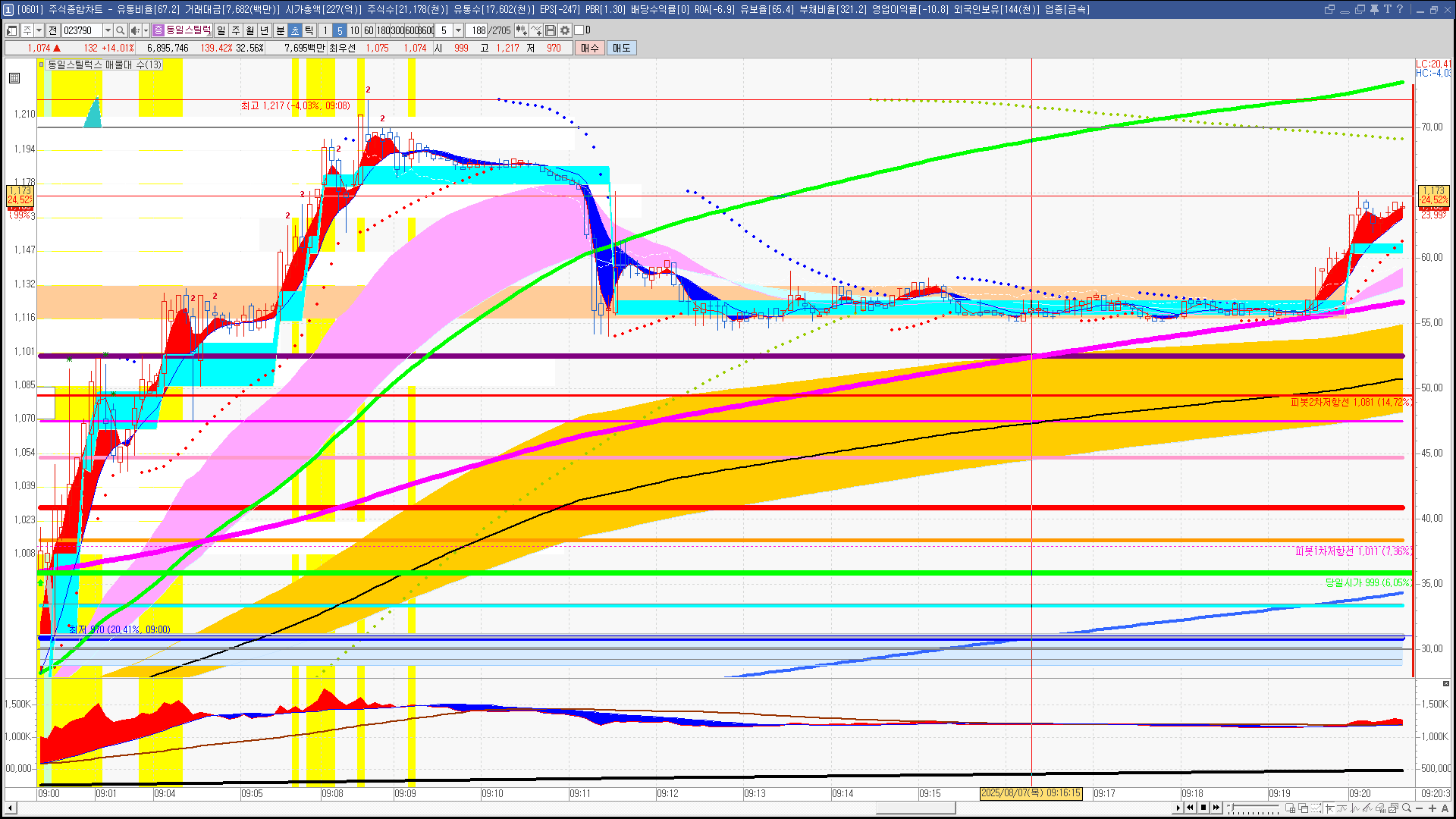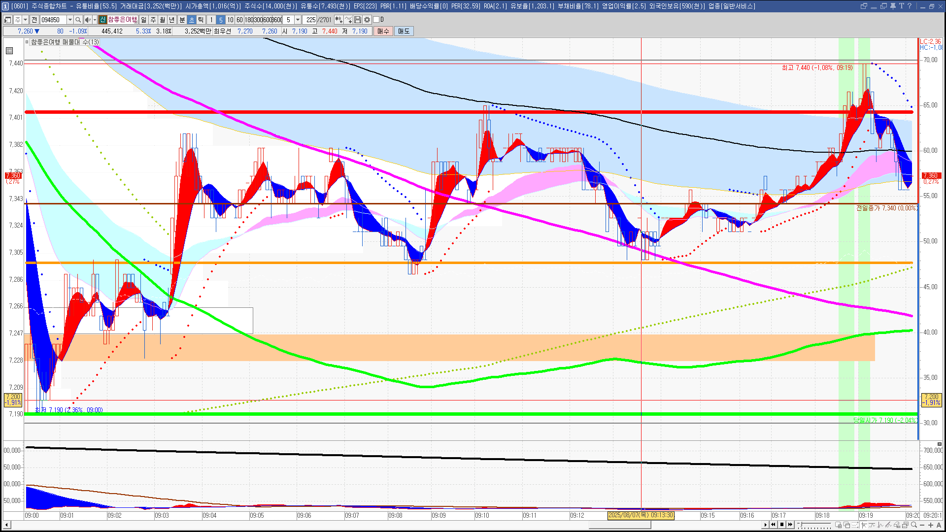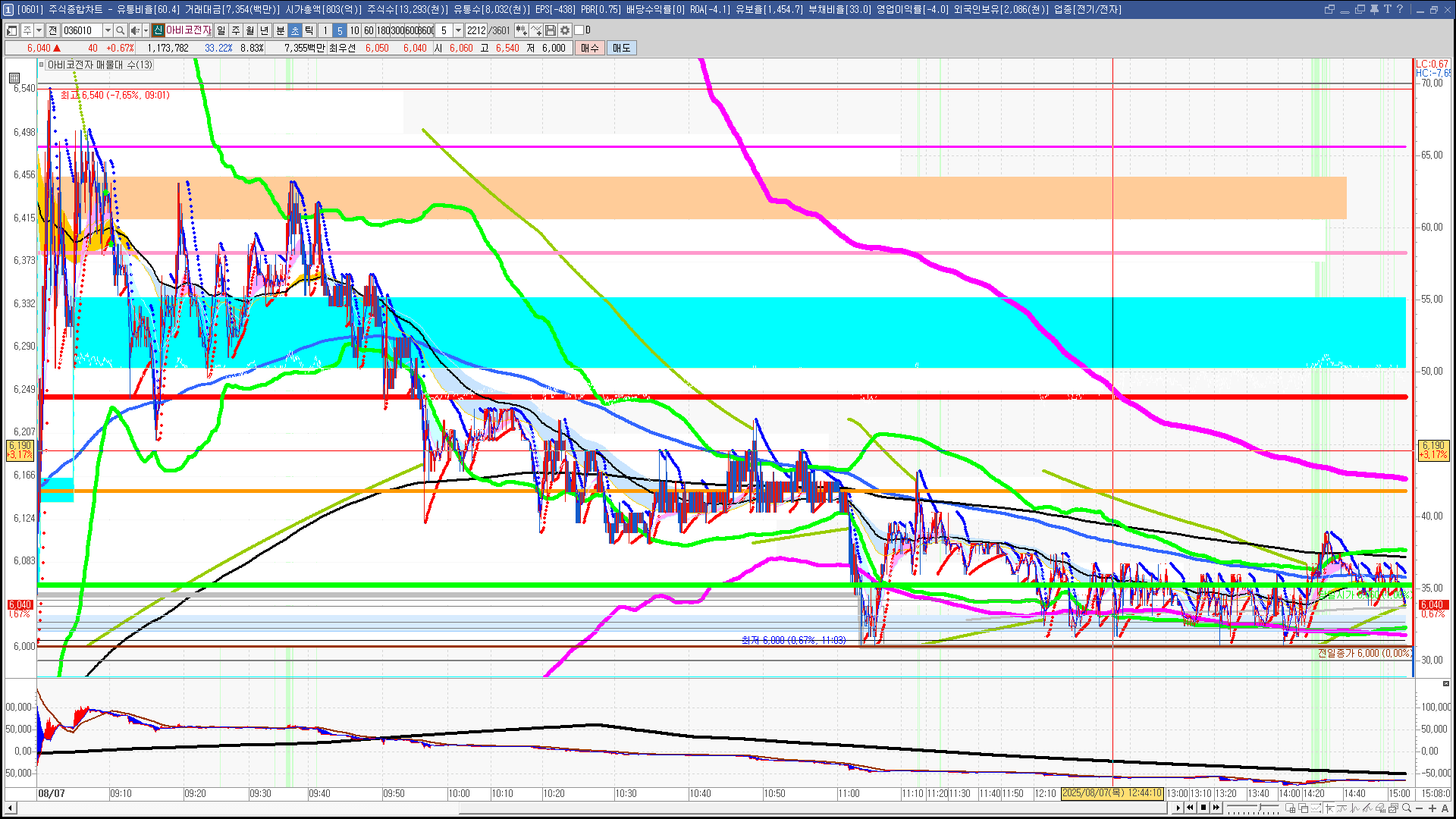 | 빨강 3% | 주황 1.5% | 녹색 시가 | 옥색 -1.5% | 파랑 -3% | 회색 저가 | 갈색 전일종가 | 장미7% | 분홍8% | 보라 10% |