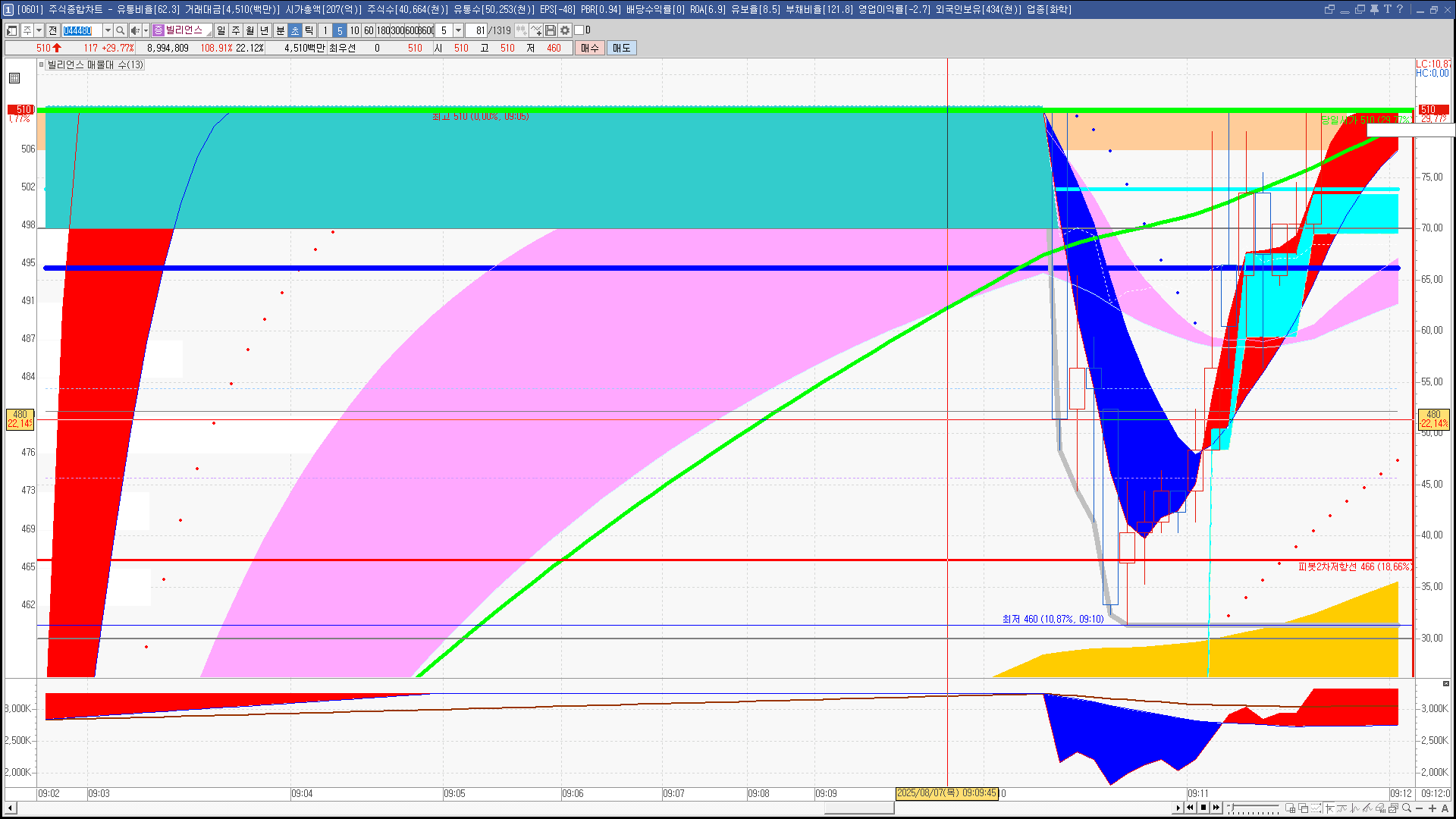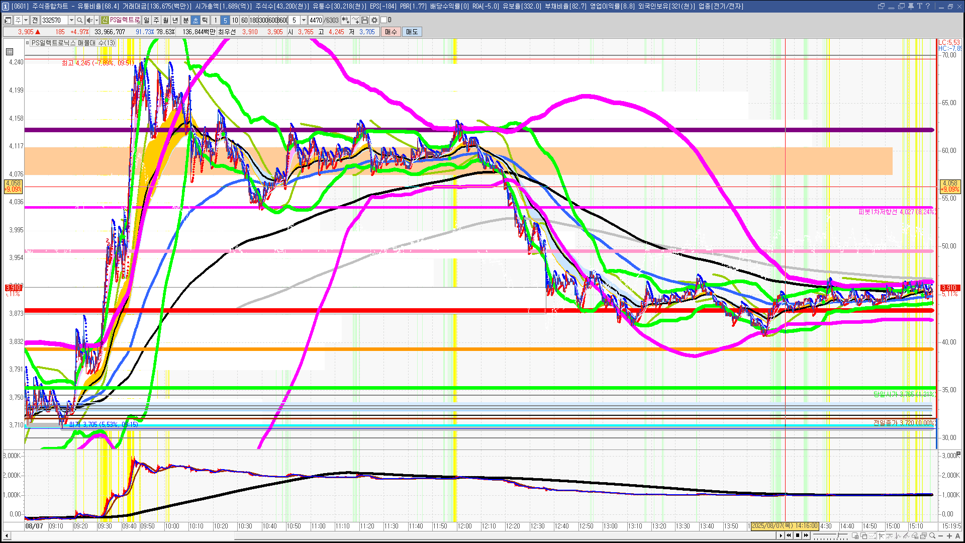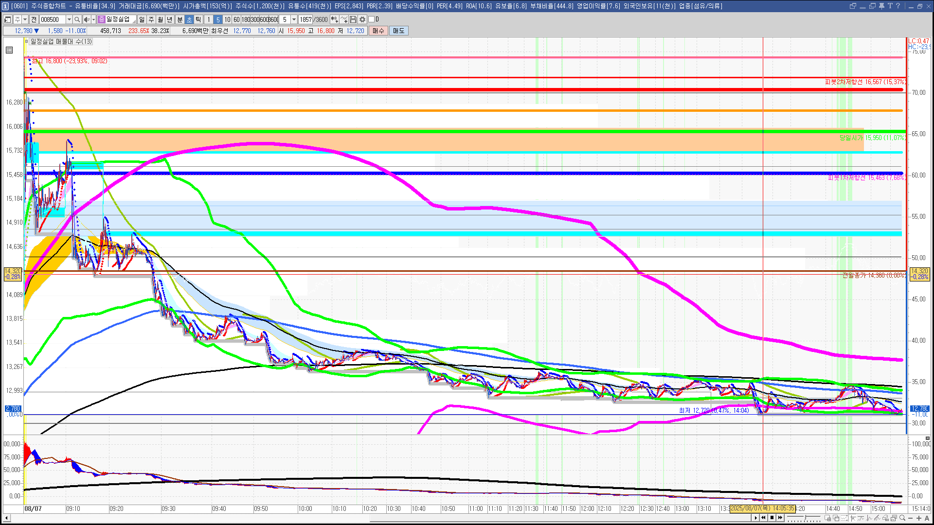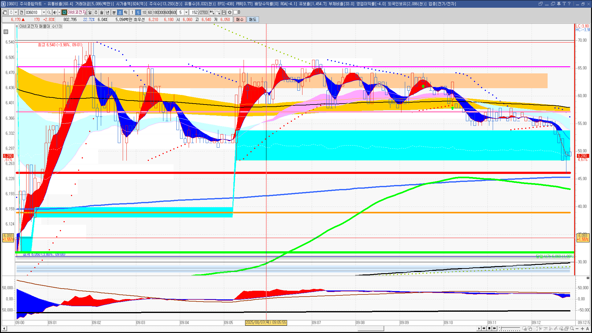 | 빨강 3% | 주황 1.5% | 녹색 시가 | 옥색 -1.5% | 파랑 -3% | 회색 저가 | 갈색 전일종가 | 장미7% | 분홍8% | 보라 10% |