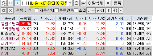 | 내일 시가단타(1~3%) : 동일스틸럭스 오리엔탈정공 HJ중공업 삼기에너지 세명전기 한성기업 삼기 ++ 엔투텍 빌리언스 + 피엠티 에이엘티 KR모터스 아센디오 한울앤제주 |