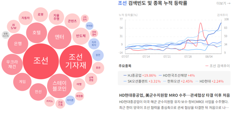 3. HJ중공업 (19.86%) : 건설관련주, 시총1조1천억대, 건설&조선&방산사업, 한미 마스가(MASGA) 프로젝트에 따른 조선업 수혜 기대감 ⇨ 국내 대형조선사들이 ‘선박 MRO’를 위한 중소형조선사 인수 검토 보도 ⇨ 조선관련주 부각