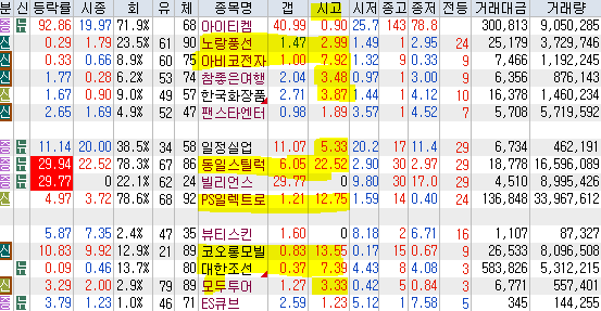 | 시가단타(1~3%) : 노랑풍선 아비코전자 참좋은여행 한국화장품 팬스타엔터프라이즈 ++ 일정실업 동일스틸럭스 빌리언스 PS일렉트로닉스 + 뷰티스킨 코오롱모빌리티그룹 대한조선 모두투어 ES큐브 상장 아이티켐 원료의약품, 의약품중간체 및 전자재료 순이익 -7,151 (백만원) 1,353,307 / 12,583,001 |
