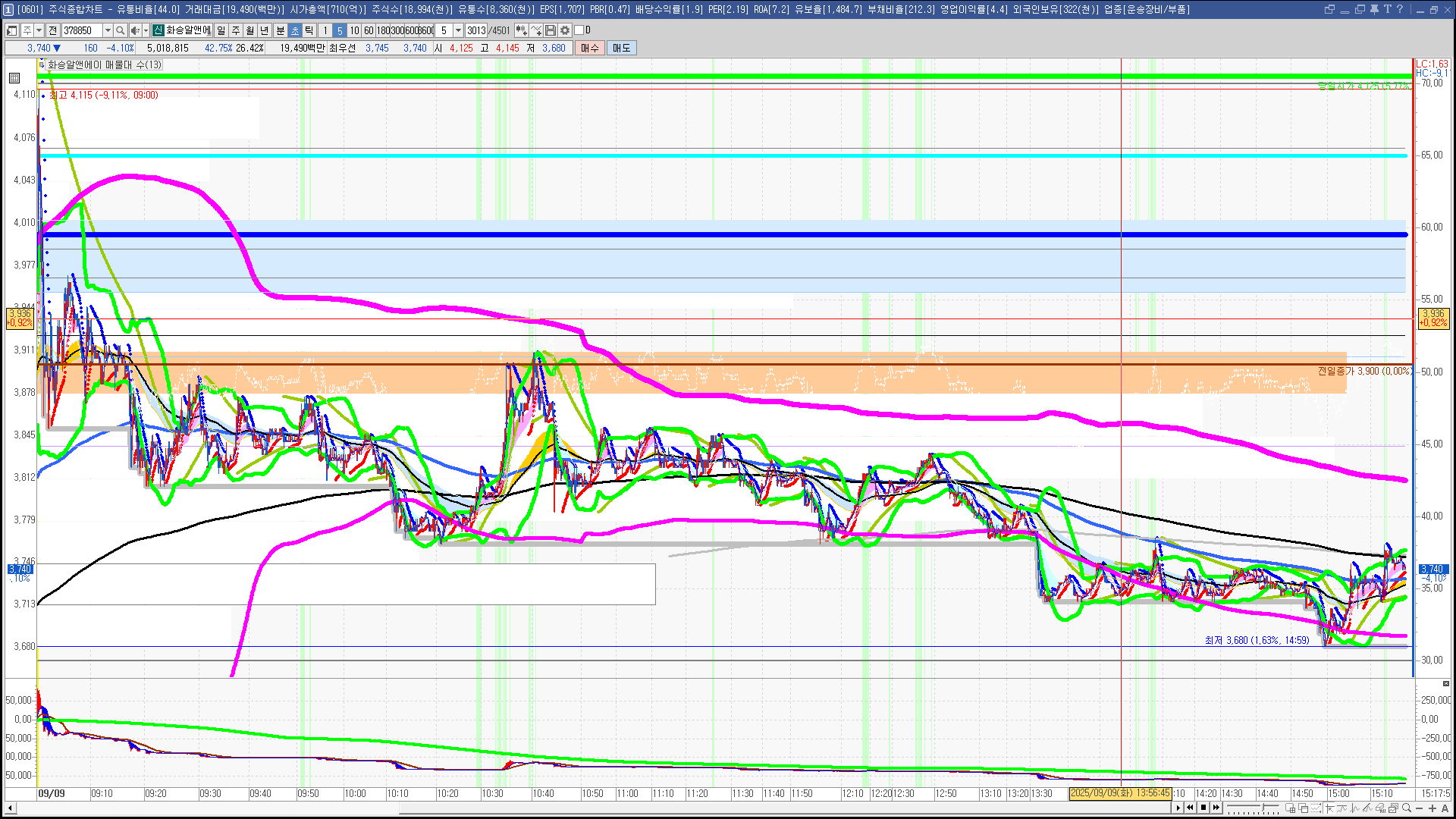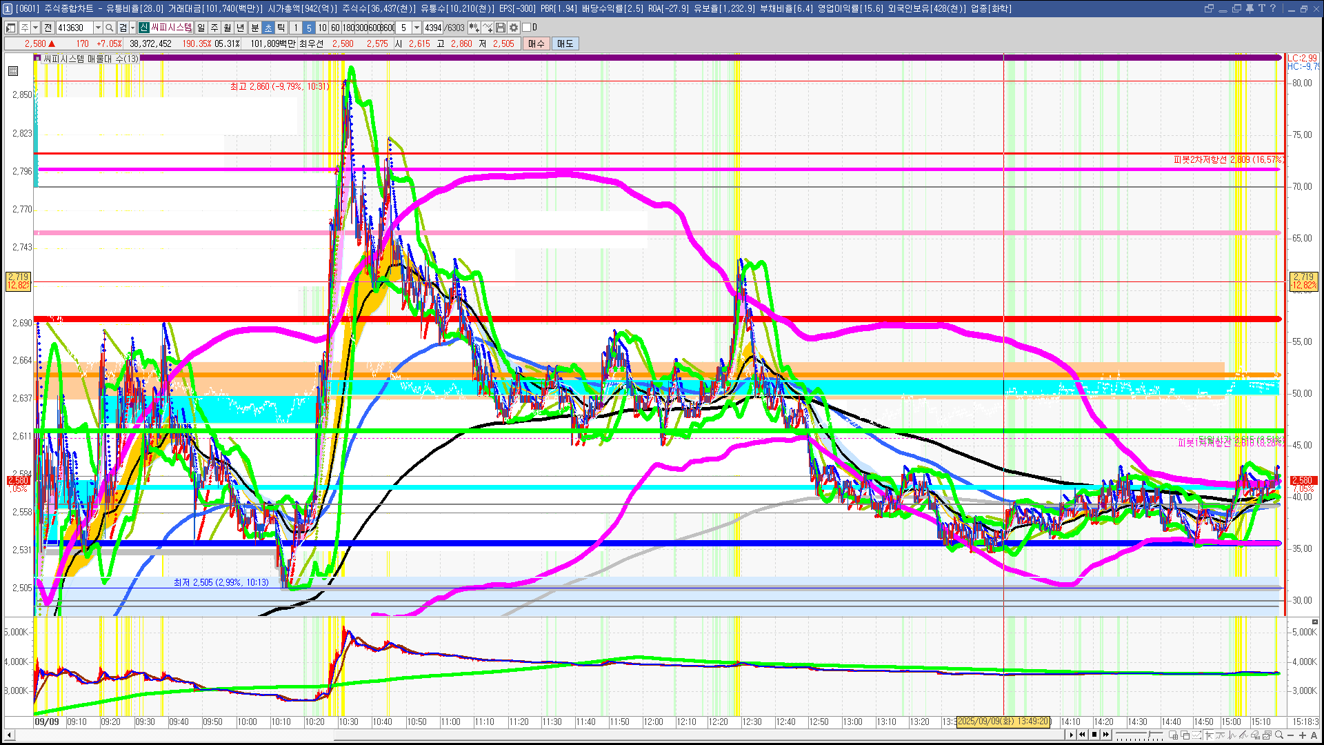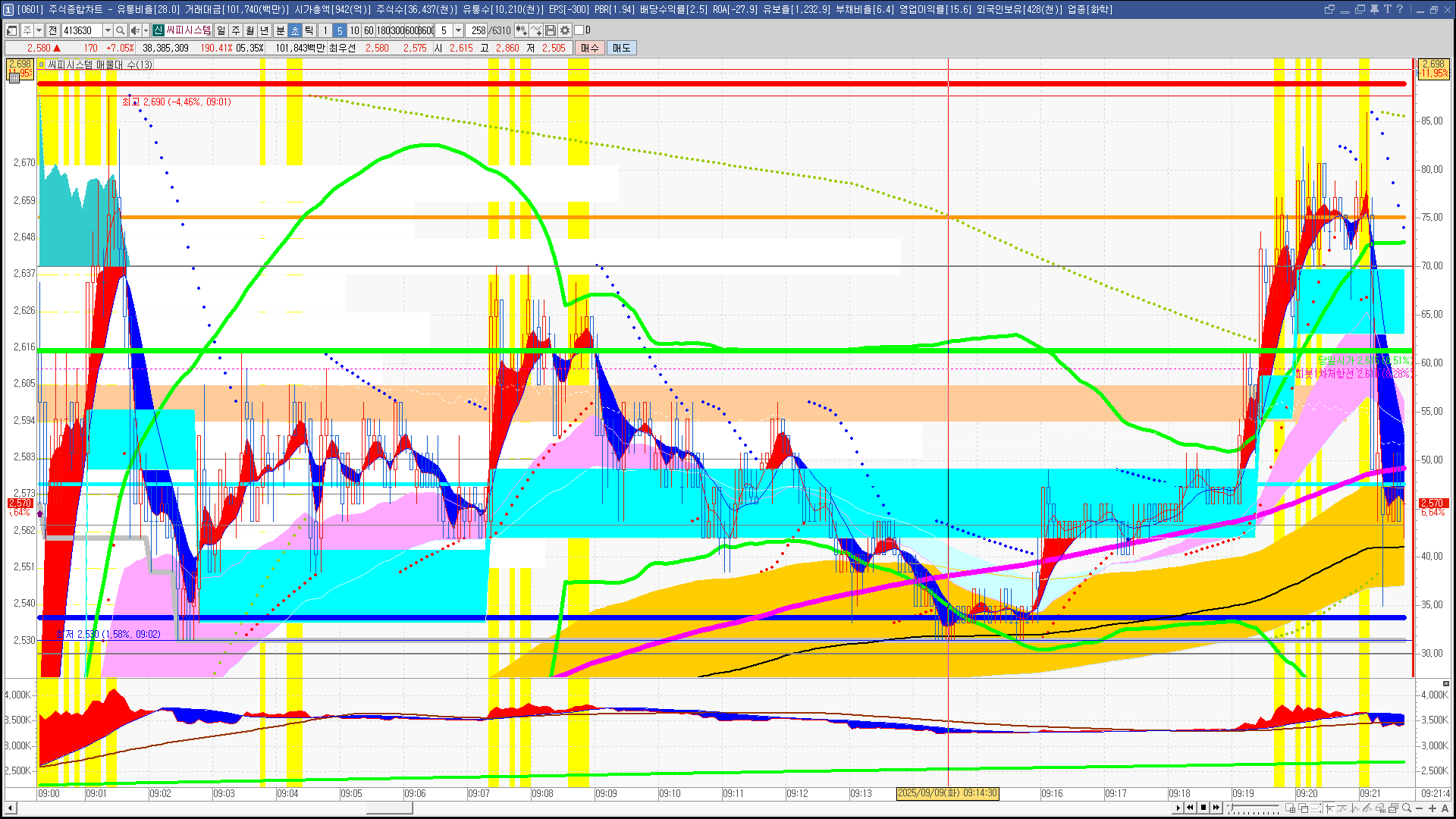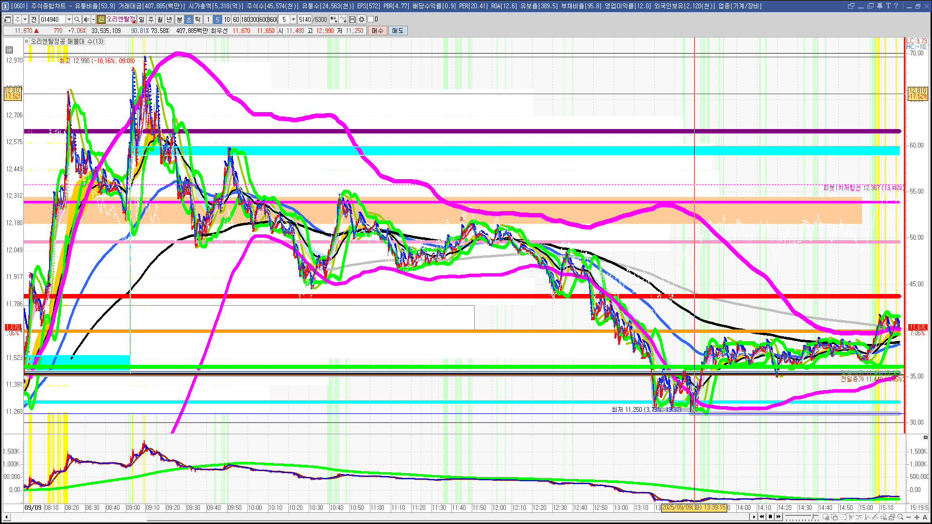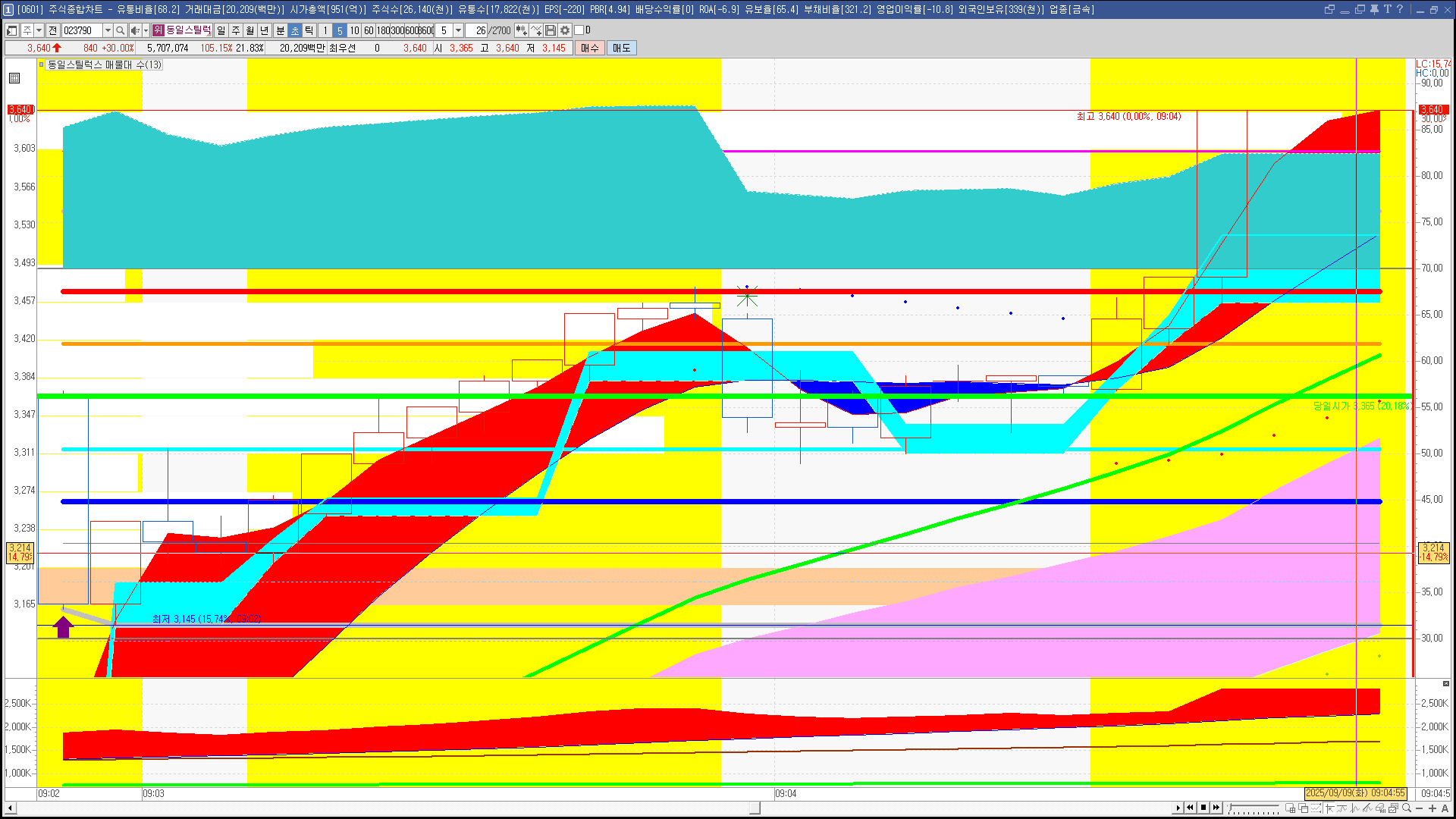 | 빨강 3% | 주황 1.5% | 녹색 시가 | 옥색 -1.5% | 파랑 -3% | 회색 저가 | 갈색 전일종가 | 장미7% | 분홍8% | 보라 10% |