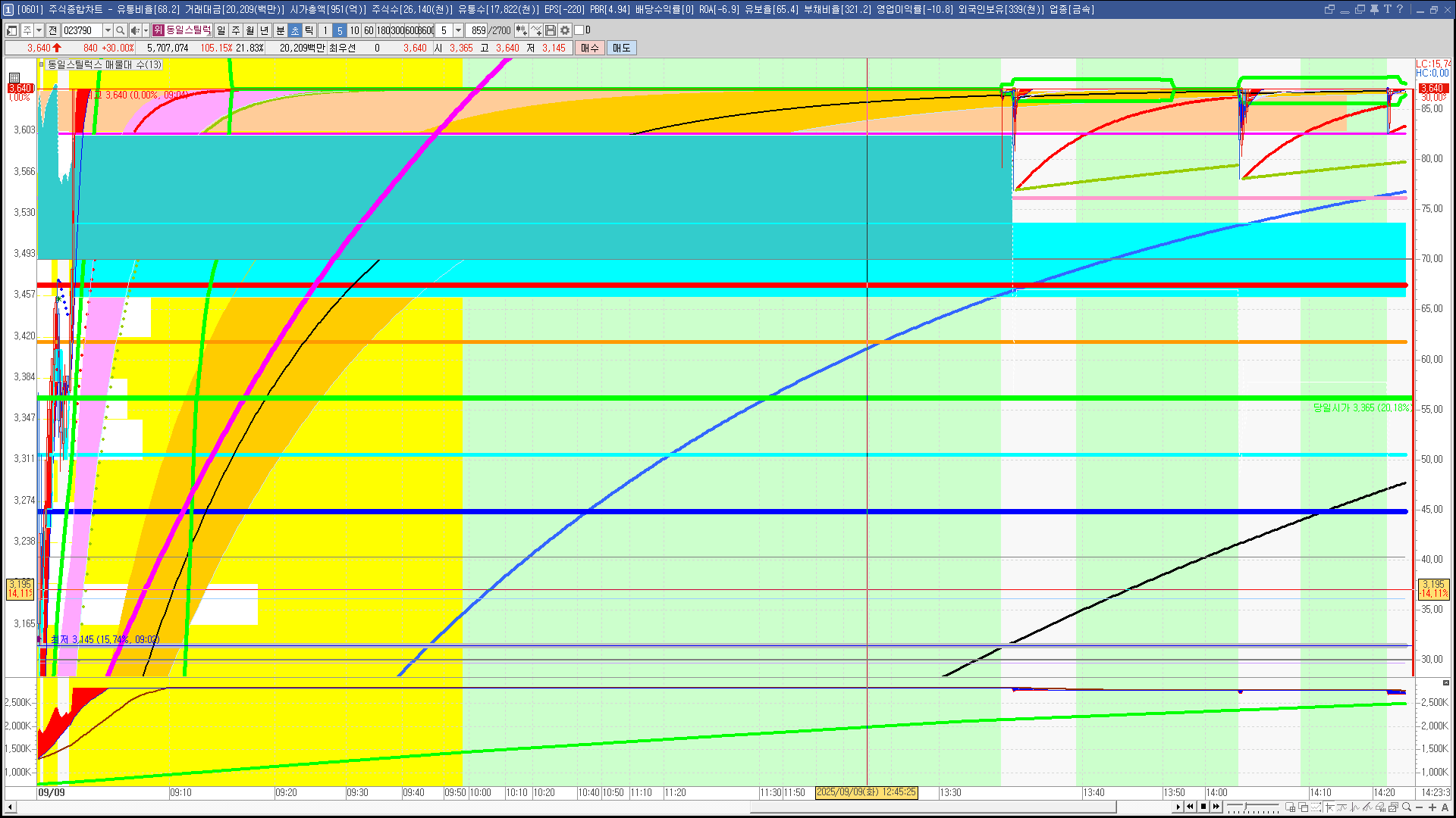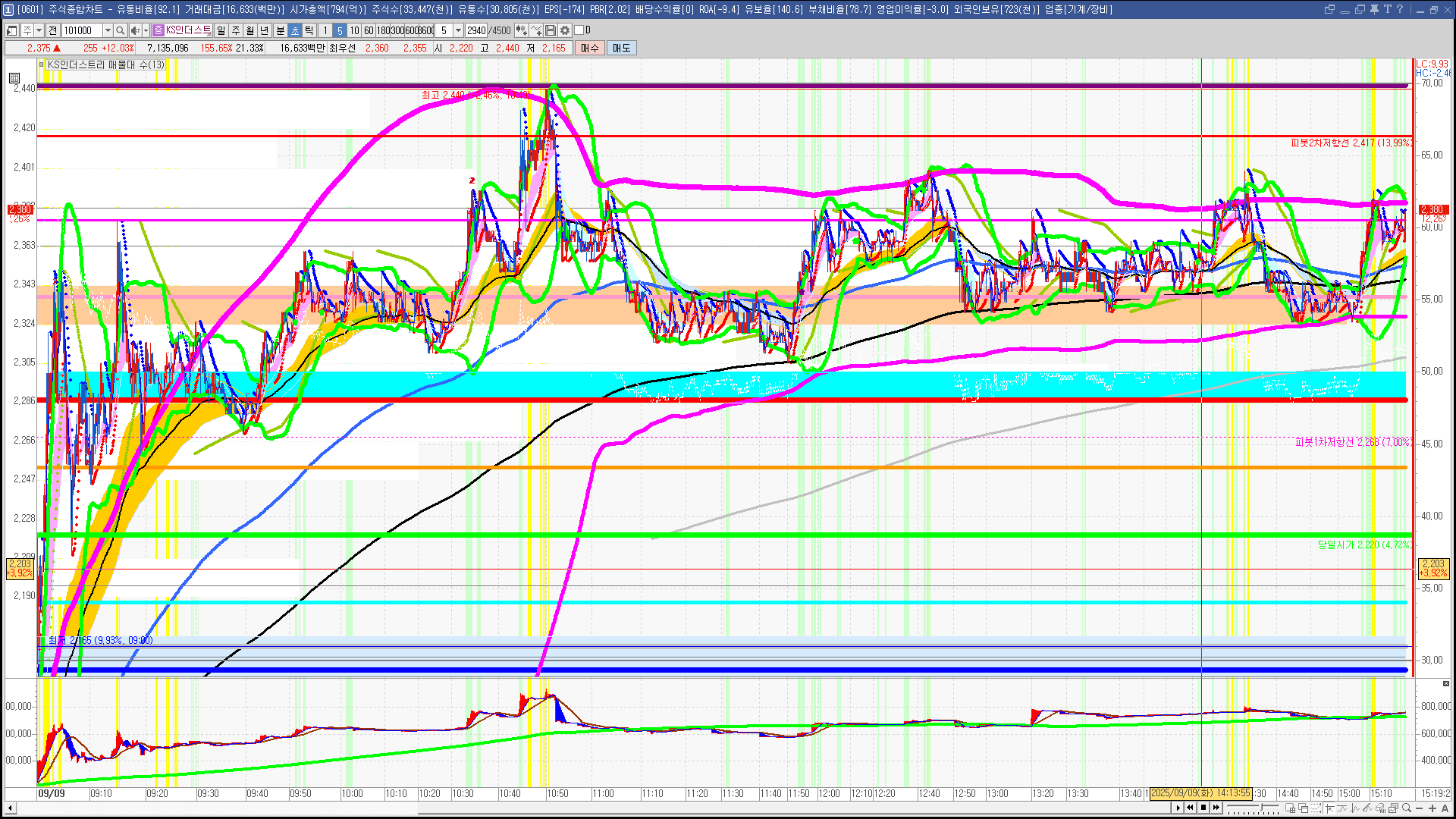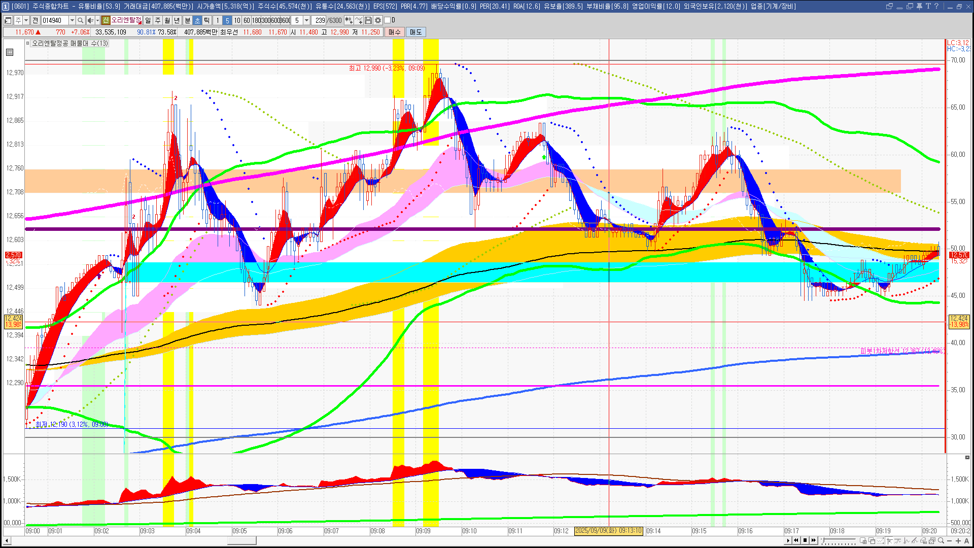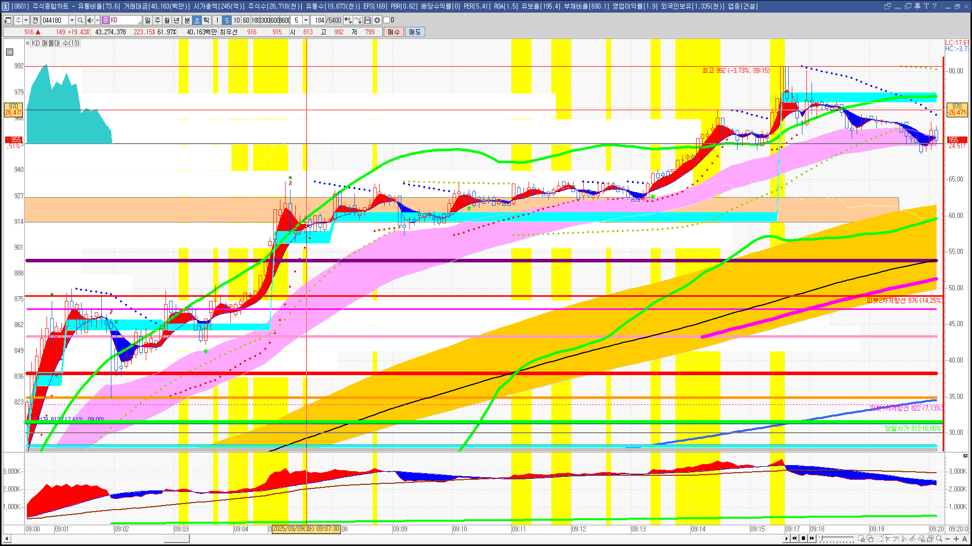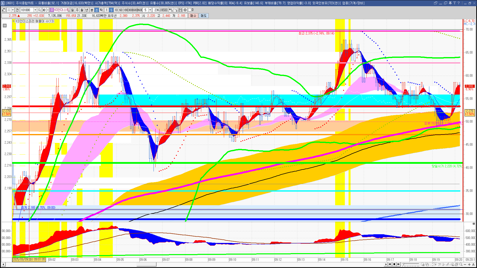 | 빨강 3% | 주황 1.5% | 녹색 시가 | 옥색 -1.5% | 파랑 -3% | 회색 저가 | 갈색 전일종가 | 장미7% | 분홍8% | 보라 10% |
