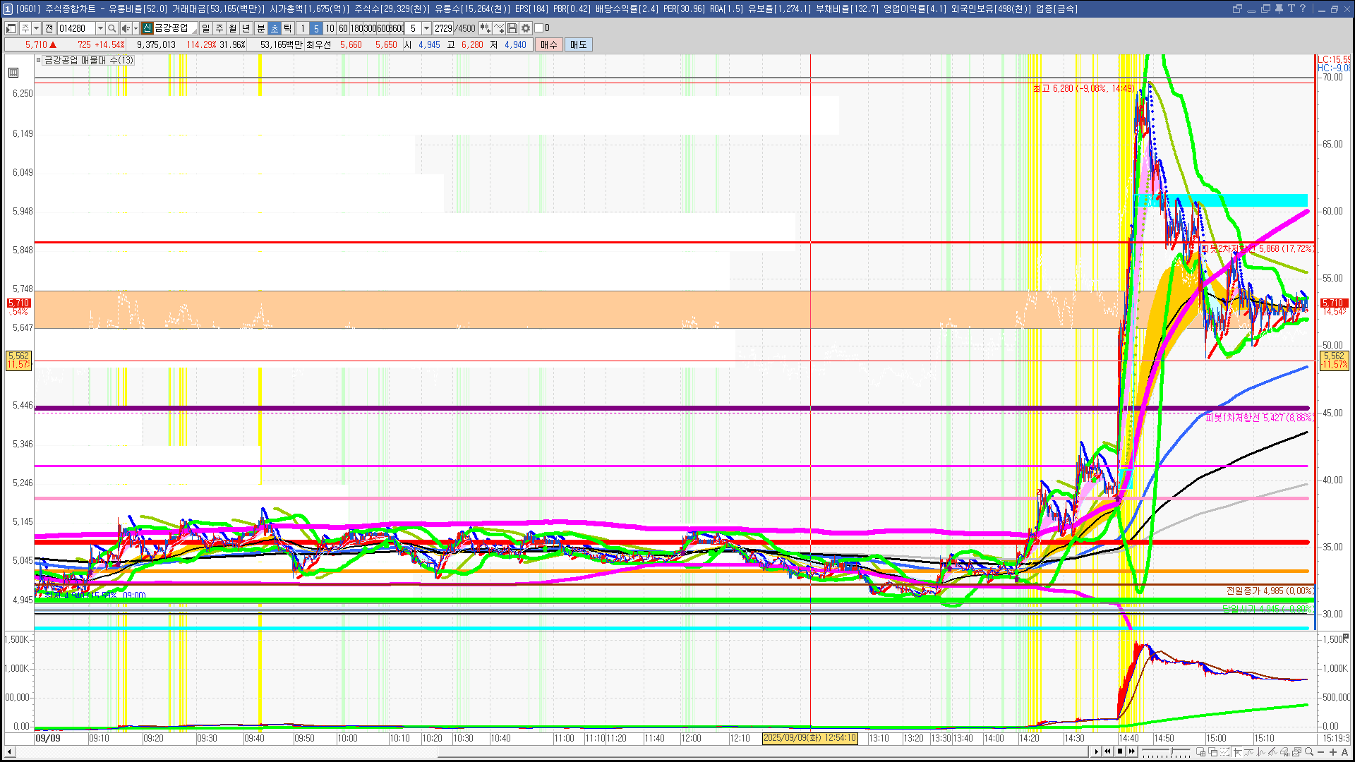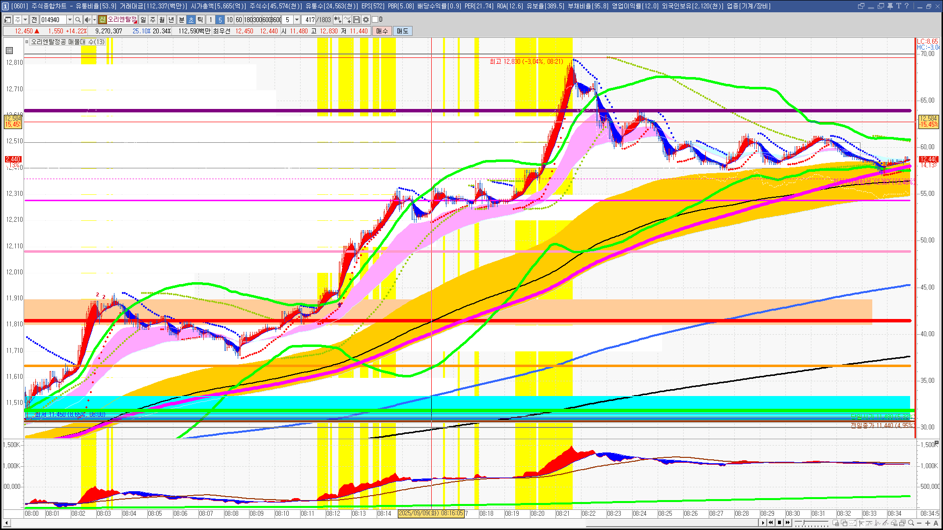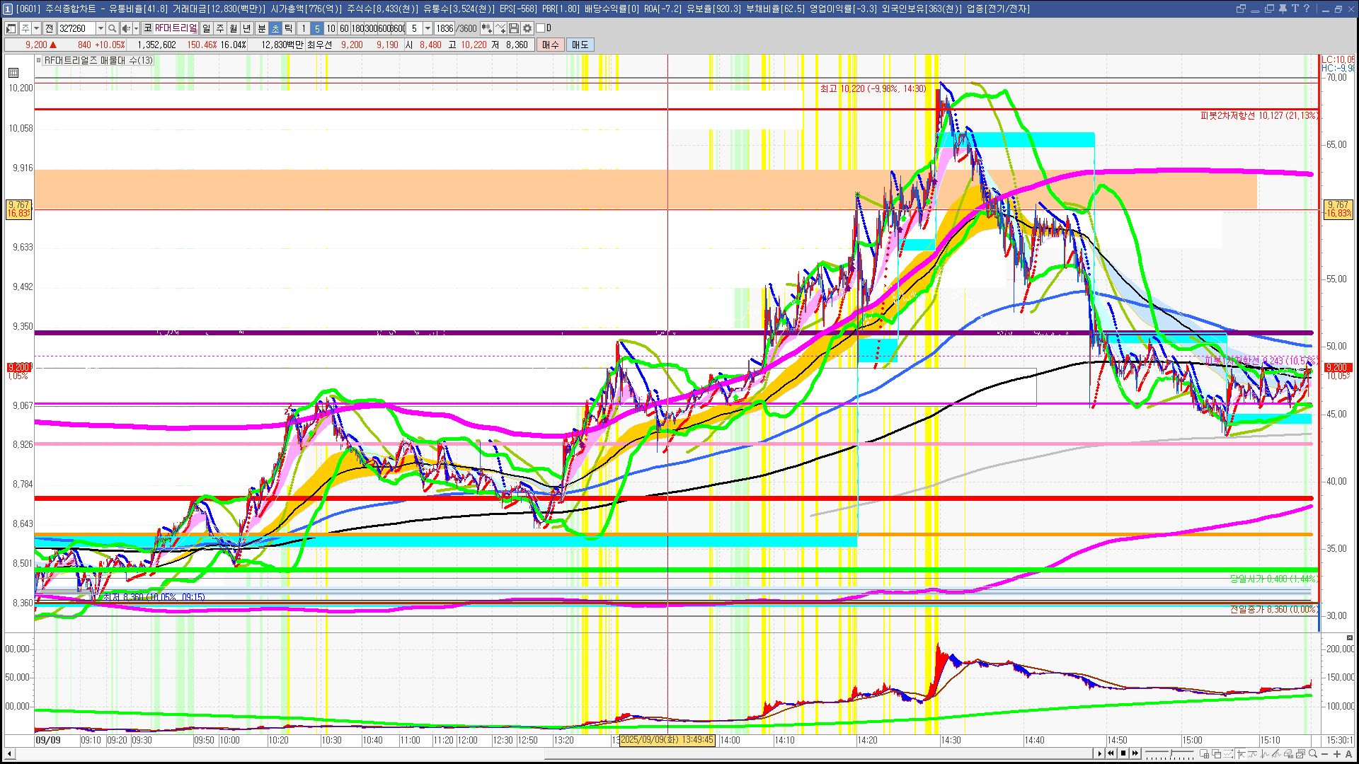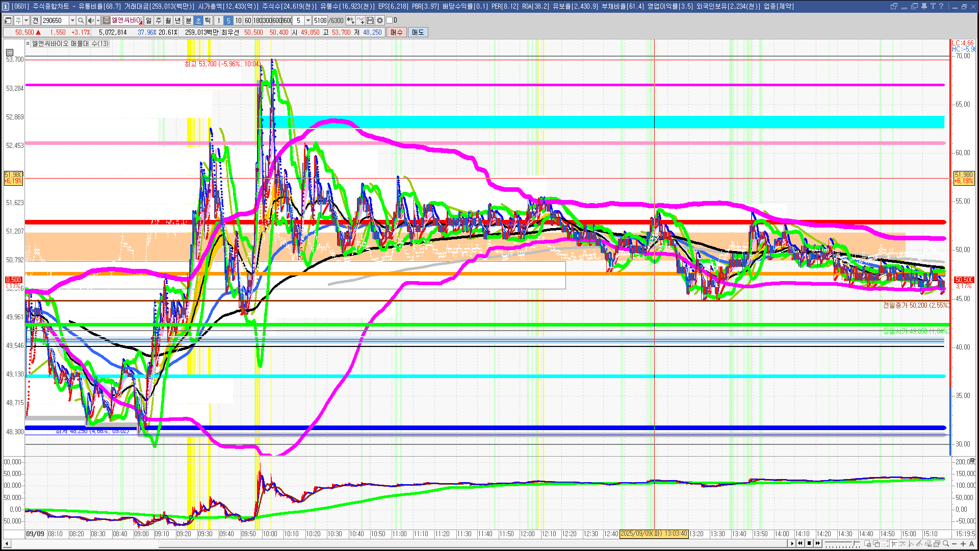 | 빨강 3% | 주황 1.5% | 녹색 시가 | 옥색 -1.5% | 파랑 -3% | 회색 저가 | 갈색 전일종가 | 장미7% | 분홍8% | 보라 10% |