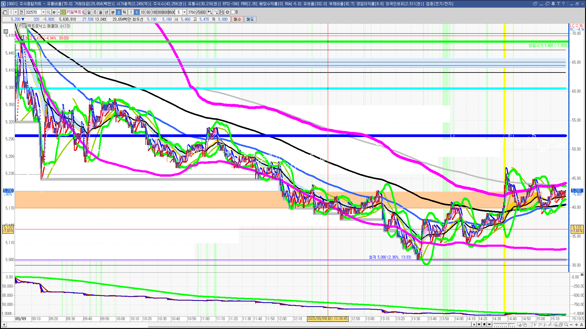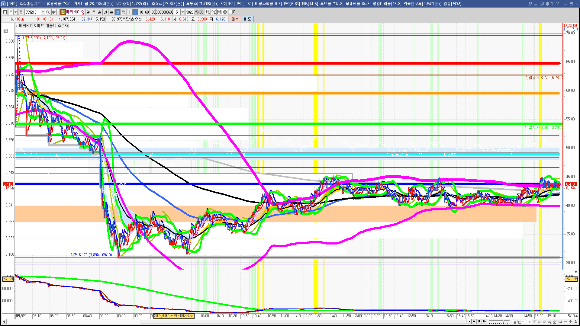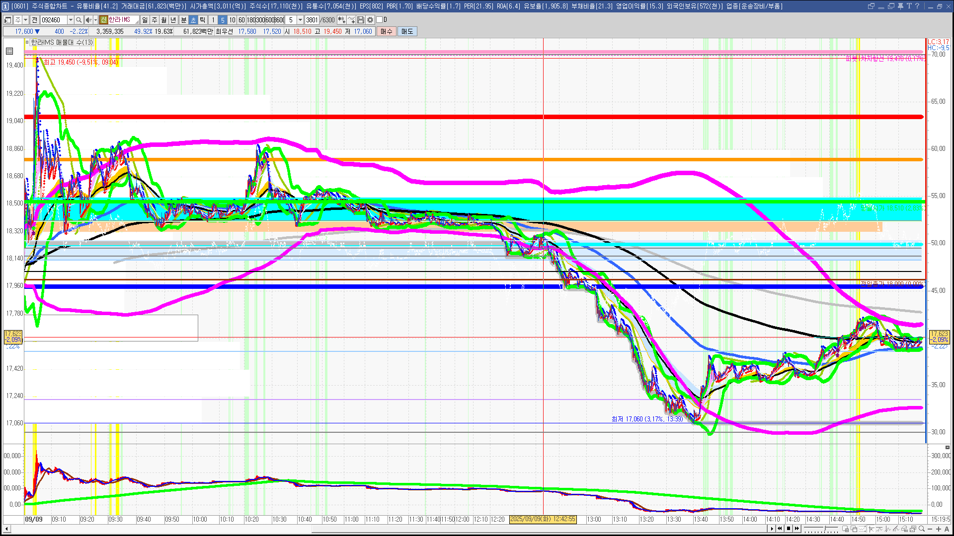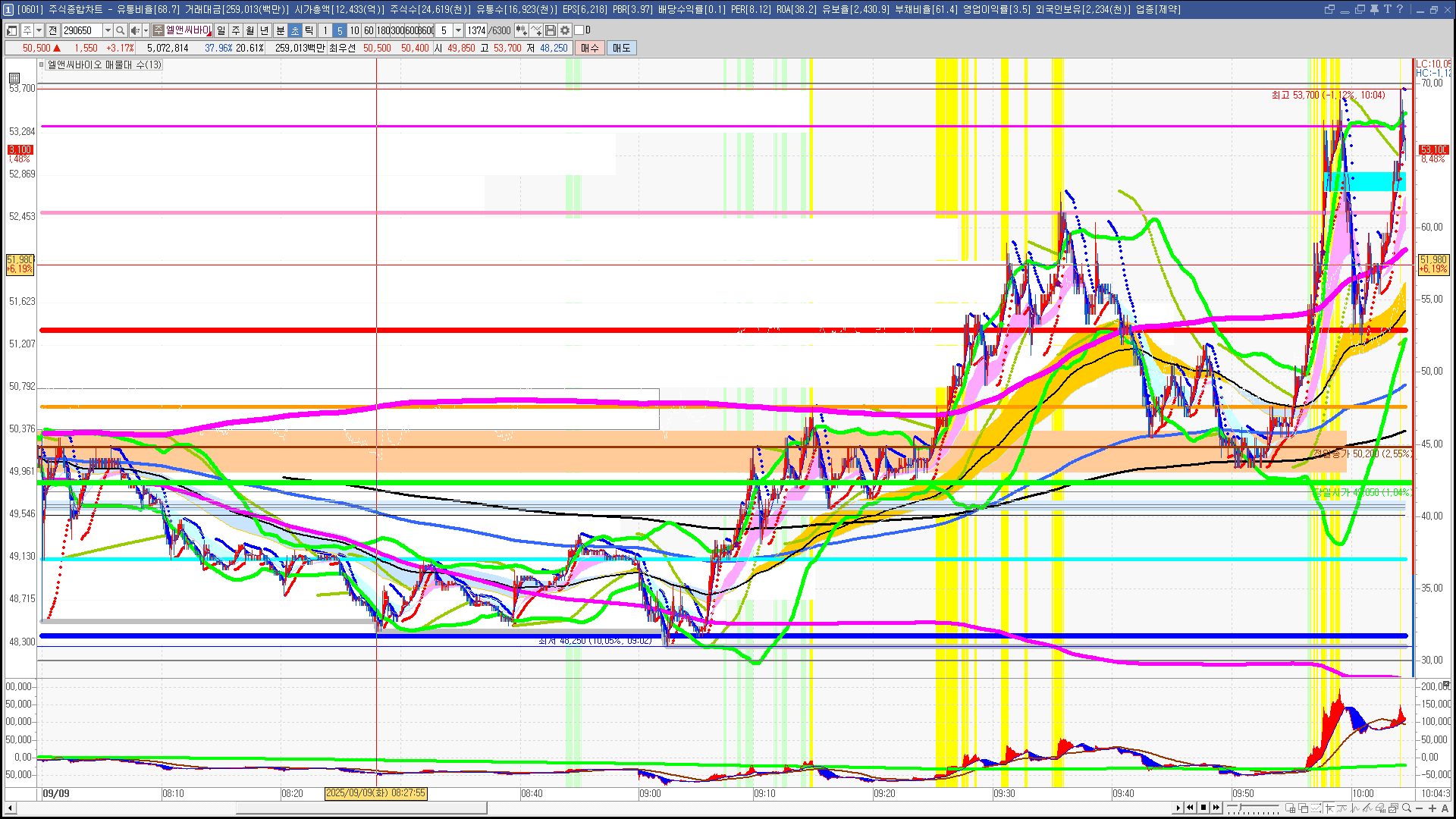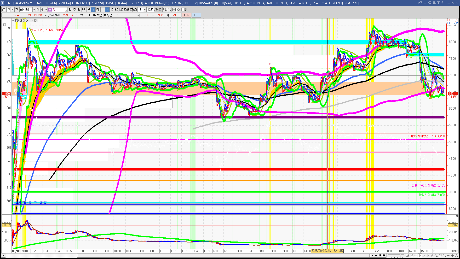 | 빨강 3% | 주황 1.5% | 녹색 시가 | 옥색 -1.5% | 파랑 -3% | 회색 저가 | 갈색 전일종가 | 장미7% | 분홍8% | 보라 10% |