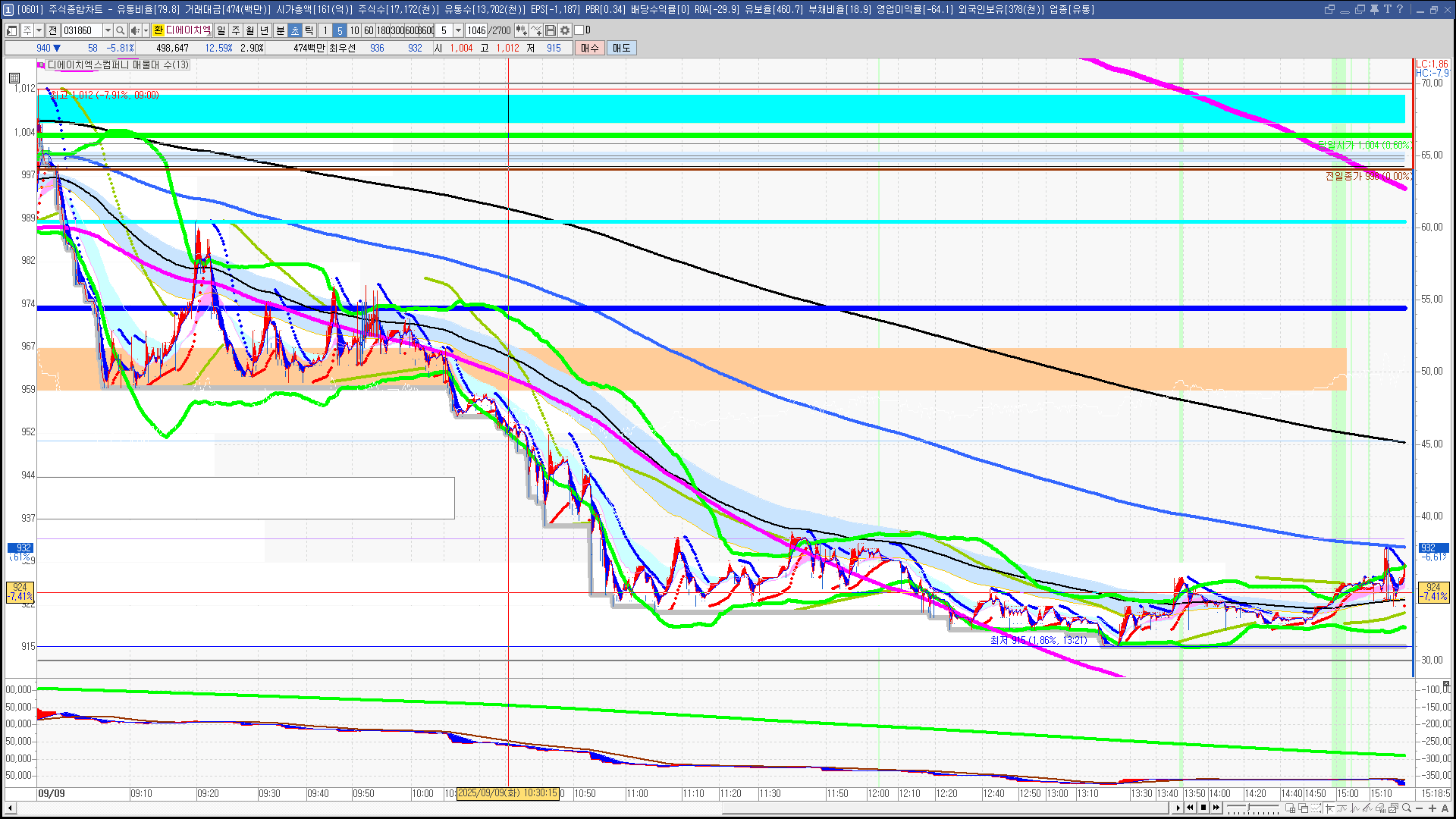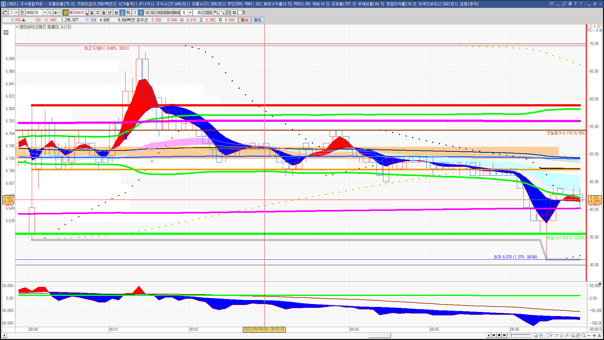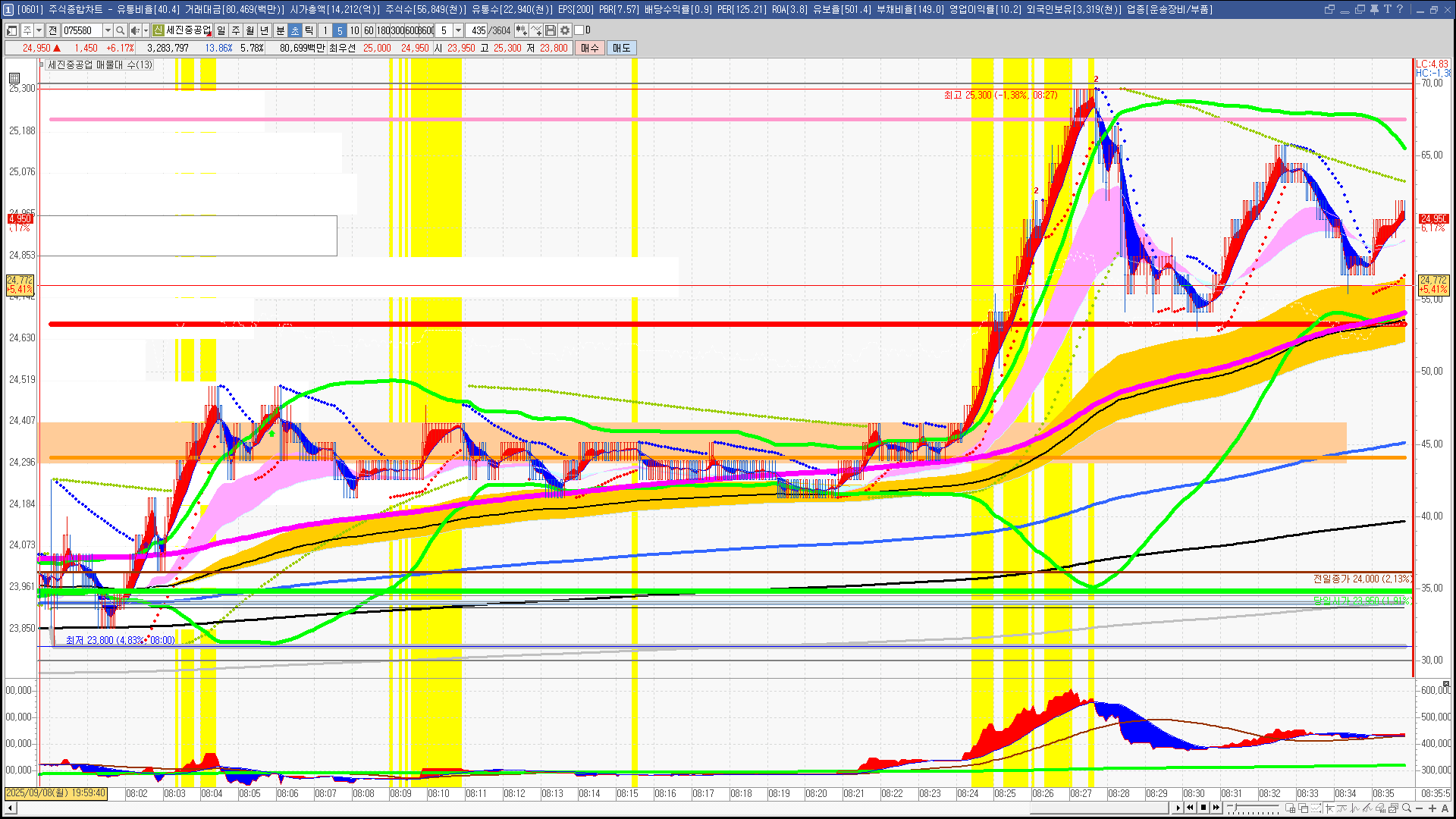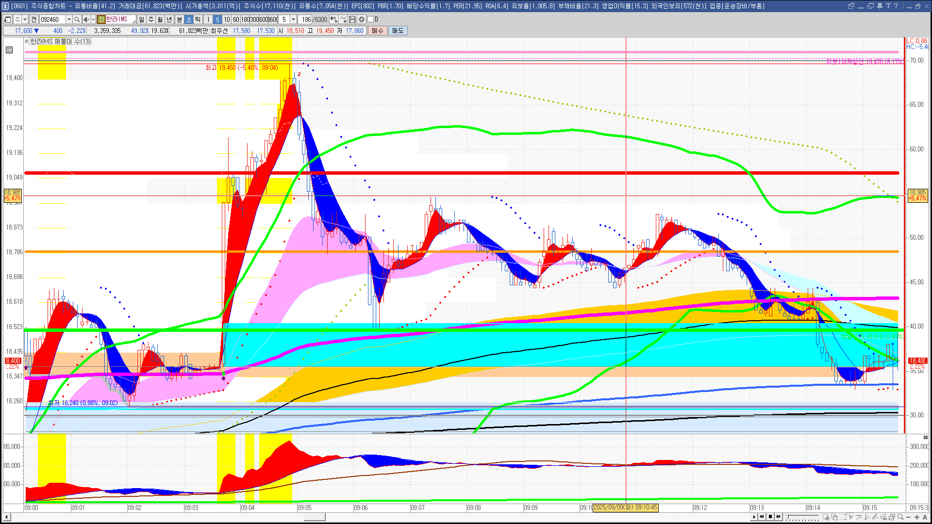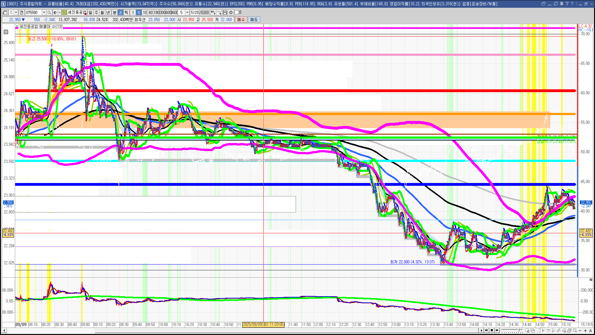 | 빨강 3% | 주황 1.5% | 녹색 시가 | 옥색 -1.5% | 파랑 -3% | 회색 저가 | 갈색 전일종가 | 장미7% | 분홍8% | 보라 10% |