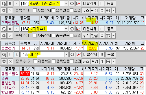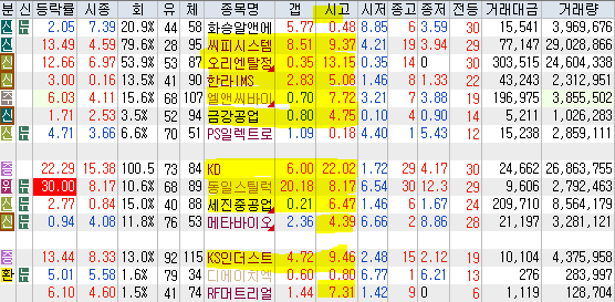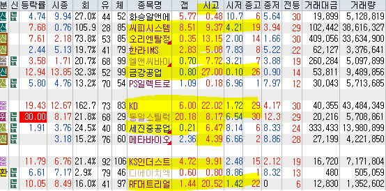 | 시가단타(1~3%) : 화승알앤에이 씨피시스템 오리엔탈정공 한라IMS 엘앤씨바이오 금강공업 PS일렉트로닉스 ++ KD 동일스틸럭스 세진중공업 메타바이오 + KS인더스트리 디에이치엑스컴퍼니 RF머트리얼 |