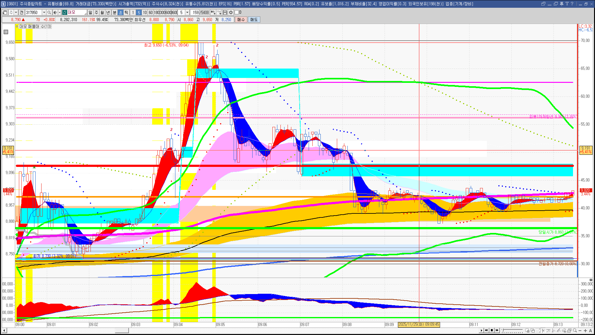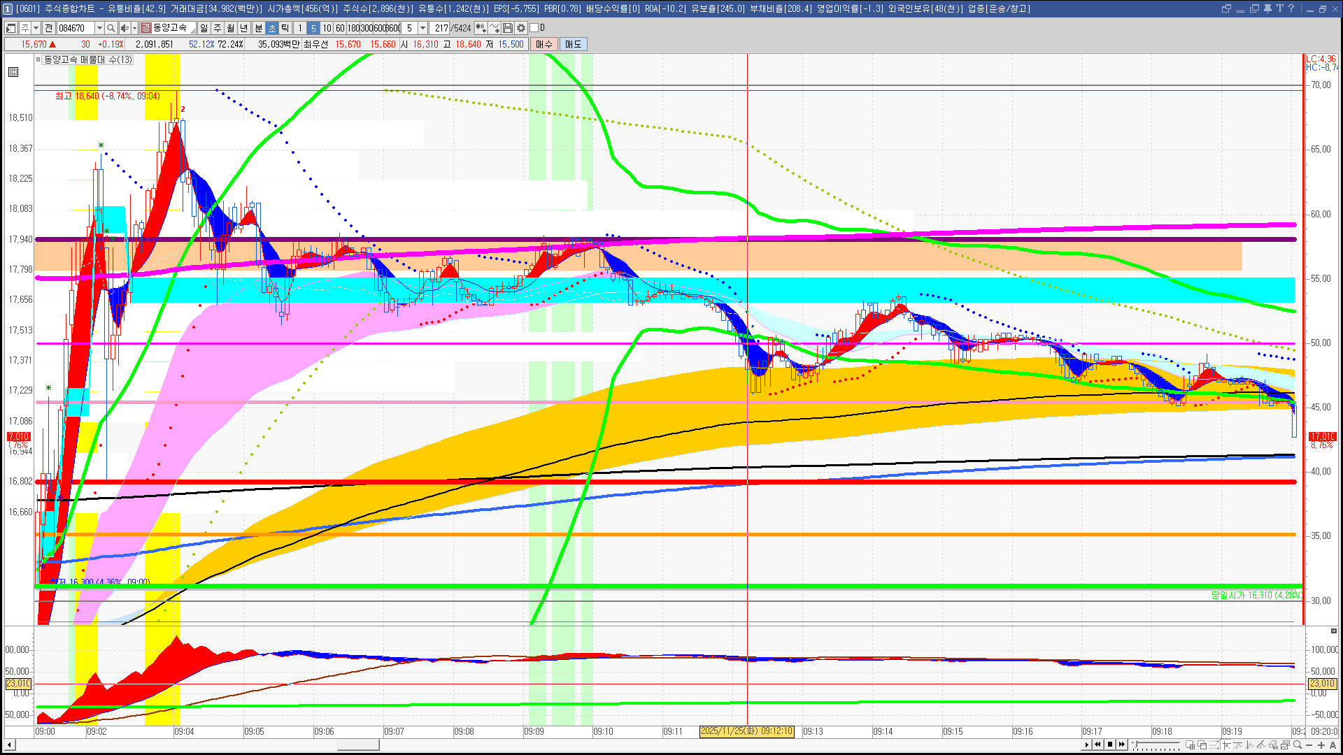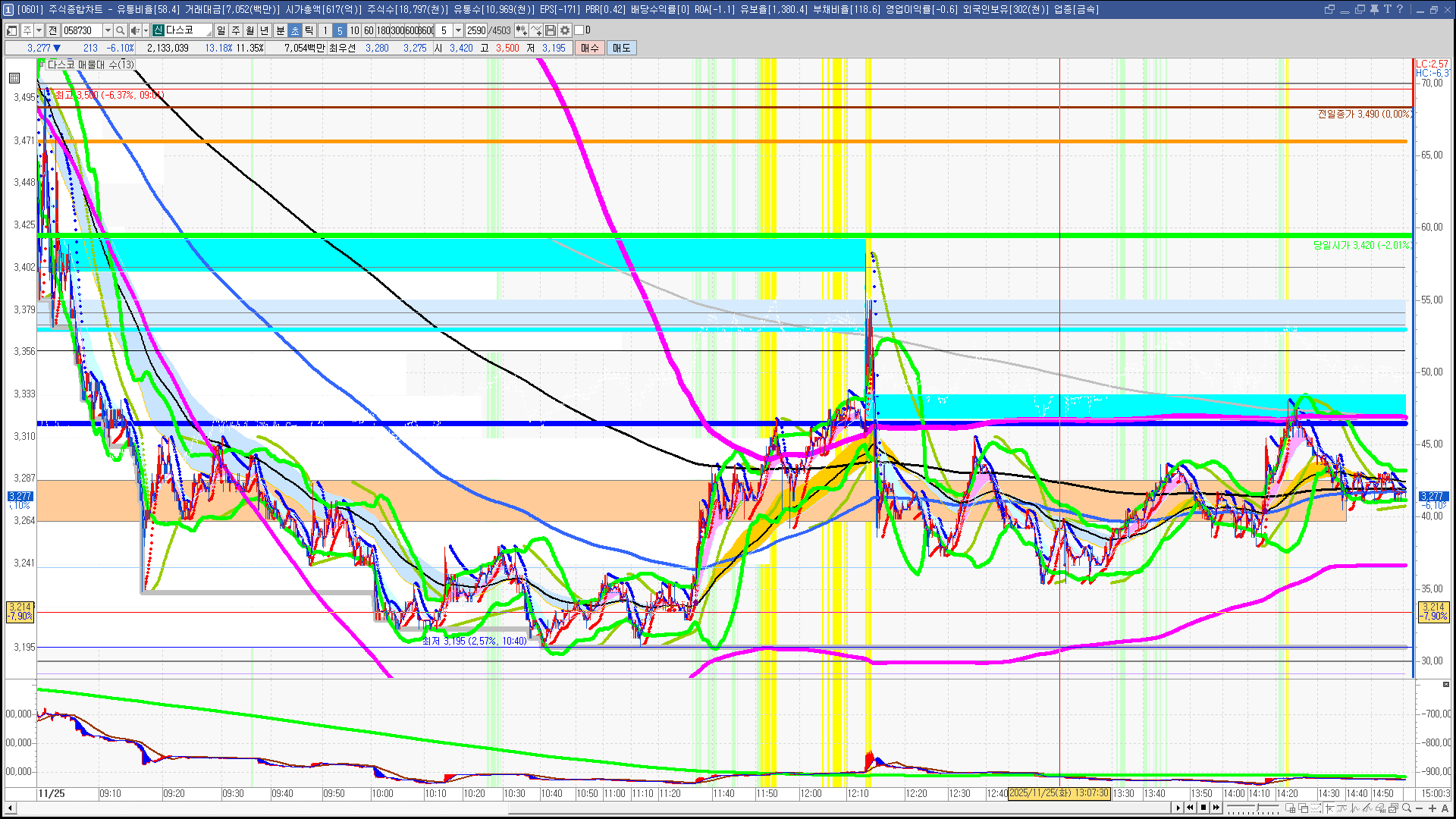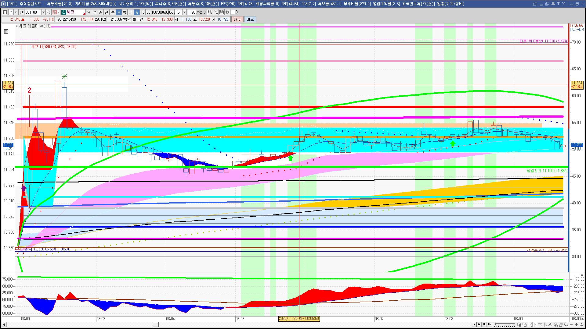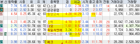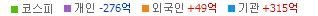 | 빨강 3% | 주황 1.5% | 녹색 시가 | 옥색 -1.5% | 파랑 -3% | 회색 저가 | 갈색 전일종가 | 장미7% | 분홍8% | 보라 10% |
