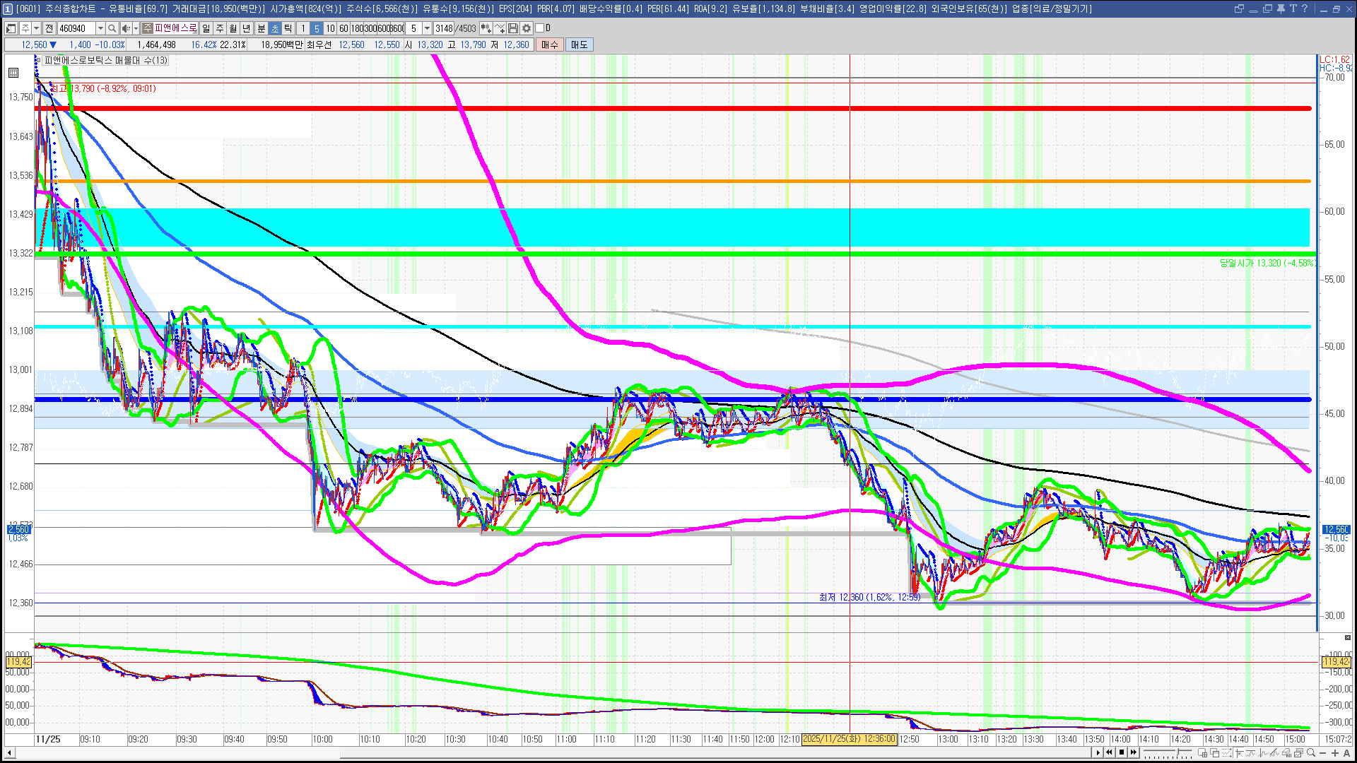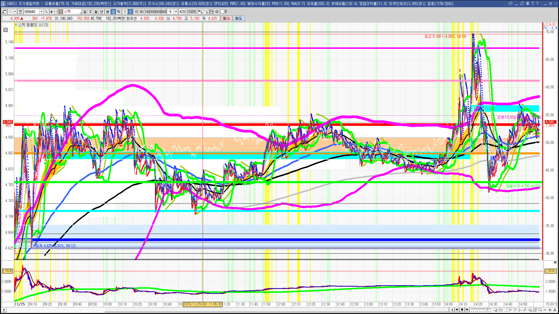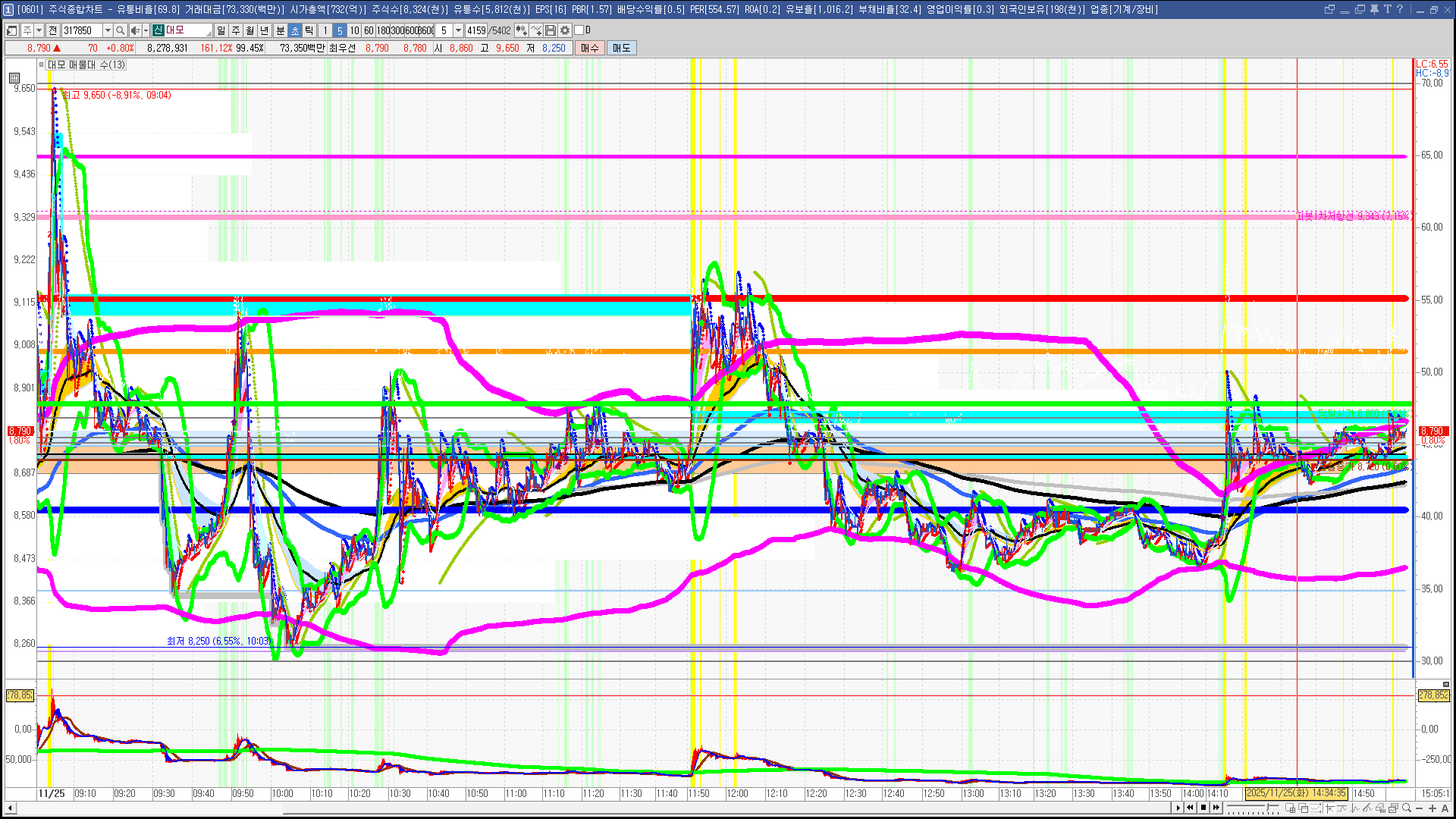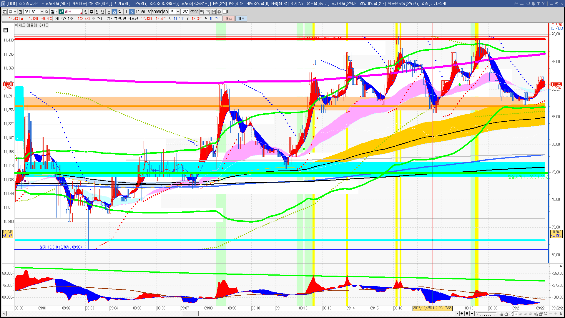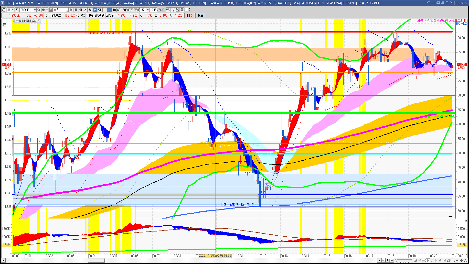 | 빨강 3% | 주황 1.5% | 녹색 시가 | 옥색 -1.5% | 파랑 -3% | 회색 저가 | 갈색 전일종가 | 장미7% | 분홍8% | 보라 10% |