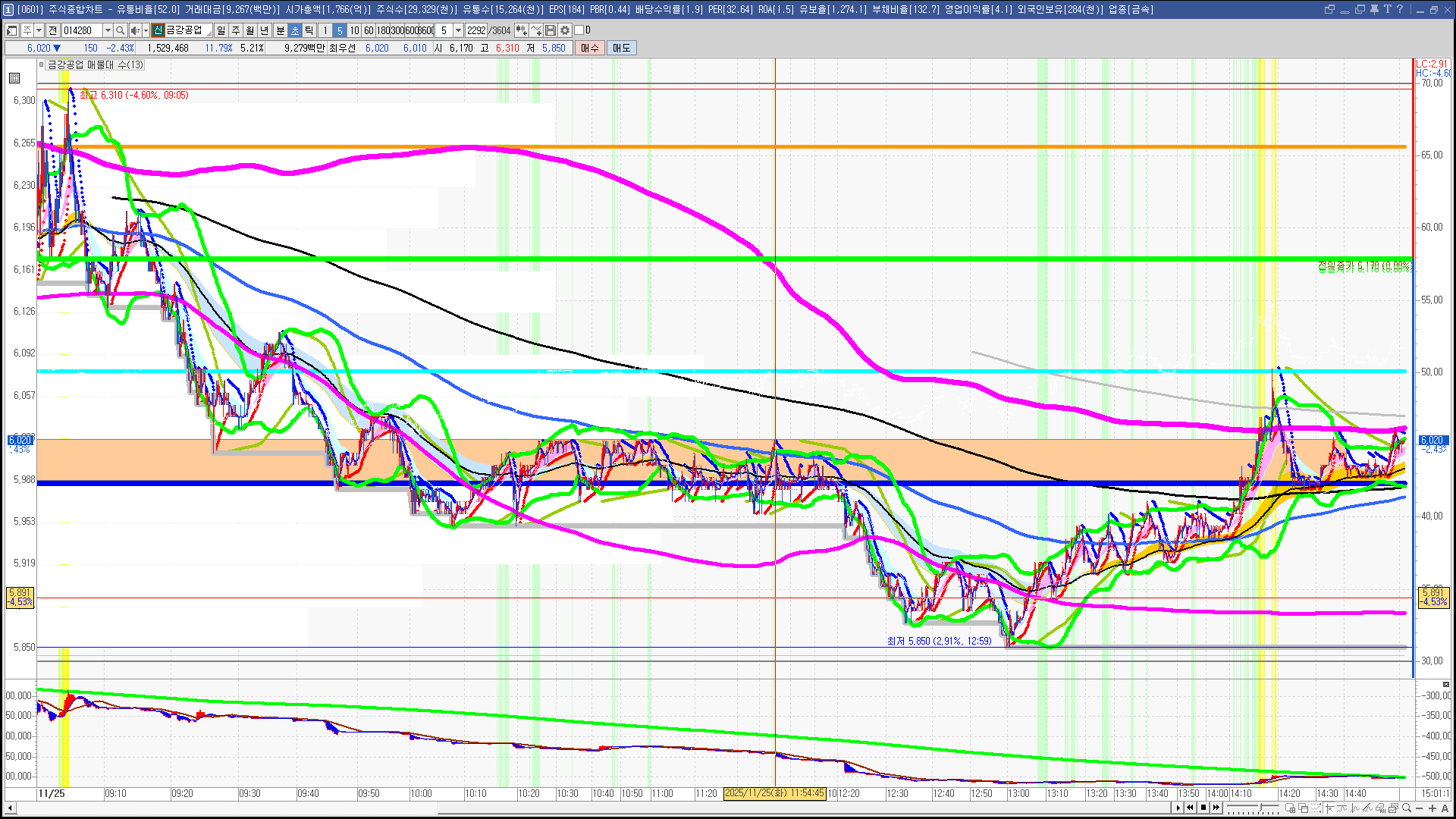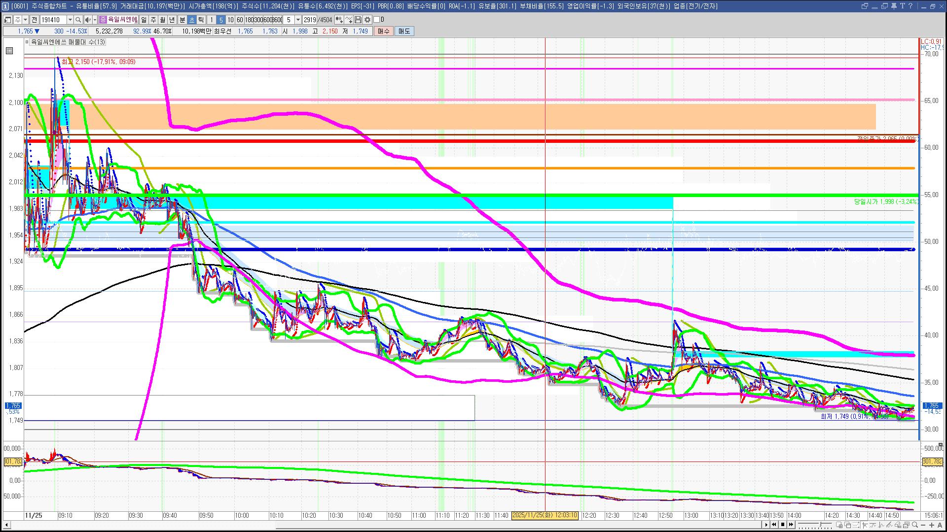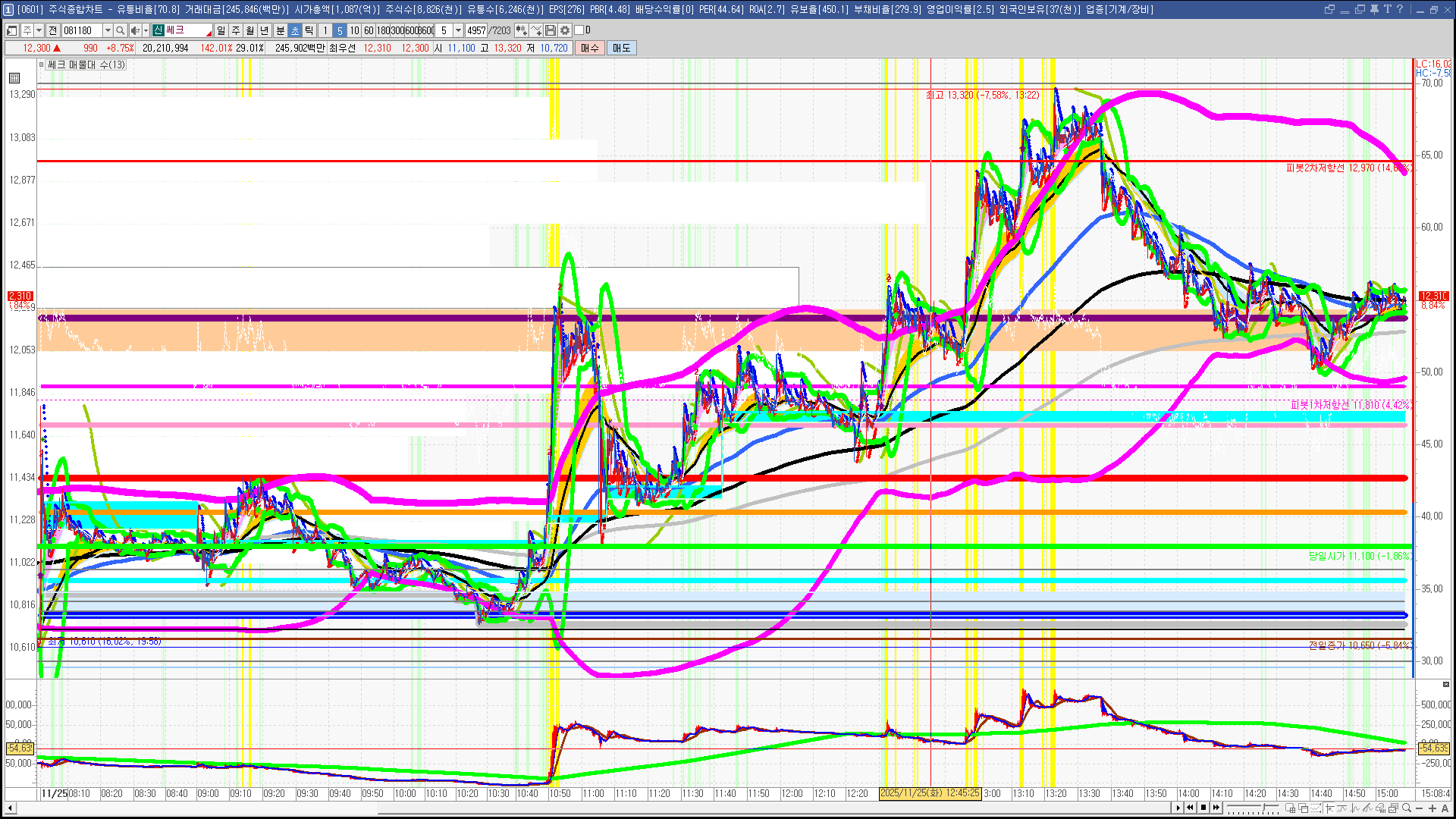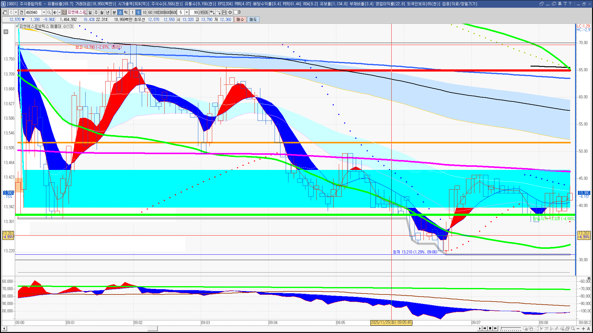 | 빨강 3% | 주황 1.5% | 녹색 시가 | 옥색 -1.5% | 파랑 -3% | 회색 저가 | 갈색 전일종가 | 장미7% | 분홍8% | 보라 10% |