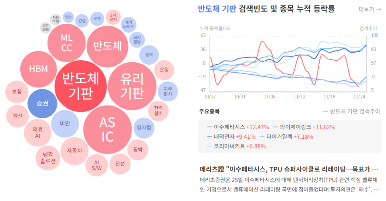 21. 이수페타시스 (12.47%) : 전자부품관련주, 시총10조3천억대, PCB사업, 전날 구글 제미나이 3.0 호평 ⇨ 구글의 인공지능(AI) 전용 반도체인 텐서처리장치(TPU)에 들어가는 인쇄회로기판(PCB) 공급 물량이 확대될 것이라는 분석(메리츠증권 리포트 발행) ⇨ 반도체관련주 부각