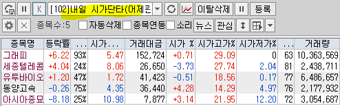 | 내일 시가단타(1~3%) : 그래피 세종텔레콤 유투바이오 동양고속 아시아종묘 + 하스 대성산업 시그네틱스 동아화성 닷밀 ES큐브 |