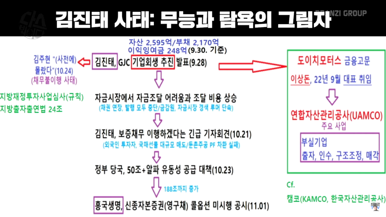 | 예상(+- 6개월) 건설사, 시행사 파산설, 담보 대출 중단(2022) ~ 증권, 캐피탈사 파산설(2023.6) ~ 상호신용금고, 마을금고, 신협(2023.12) ~ 보험사 위험, 파산설(2024.6) | ||