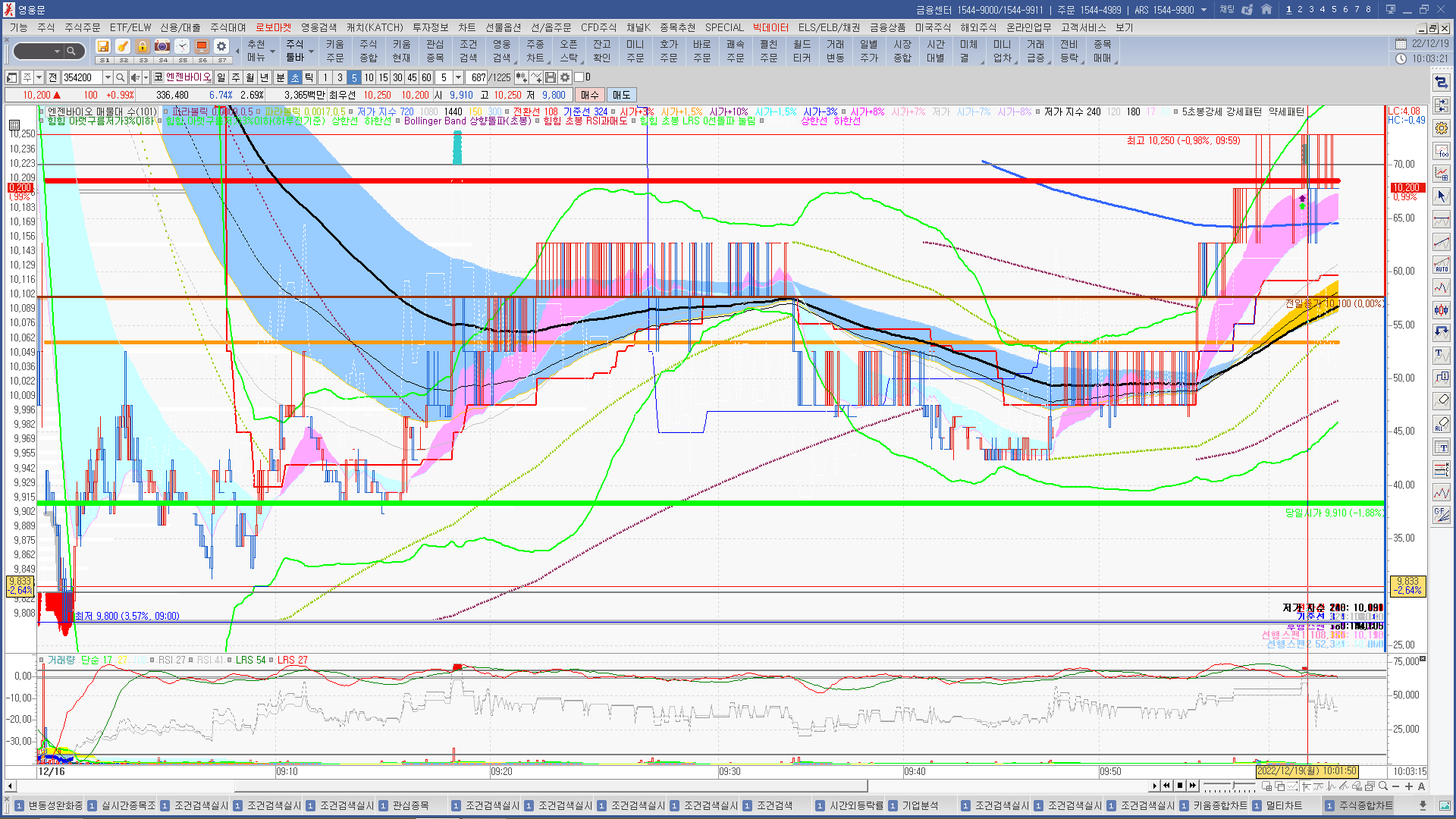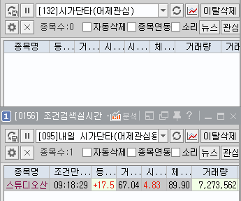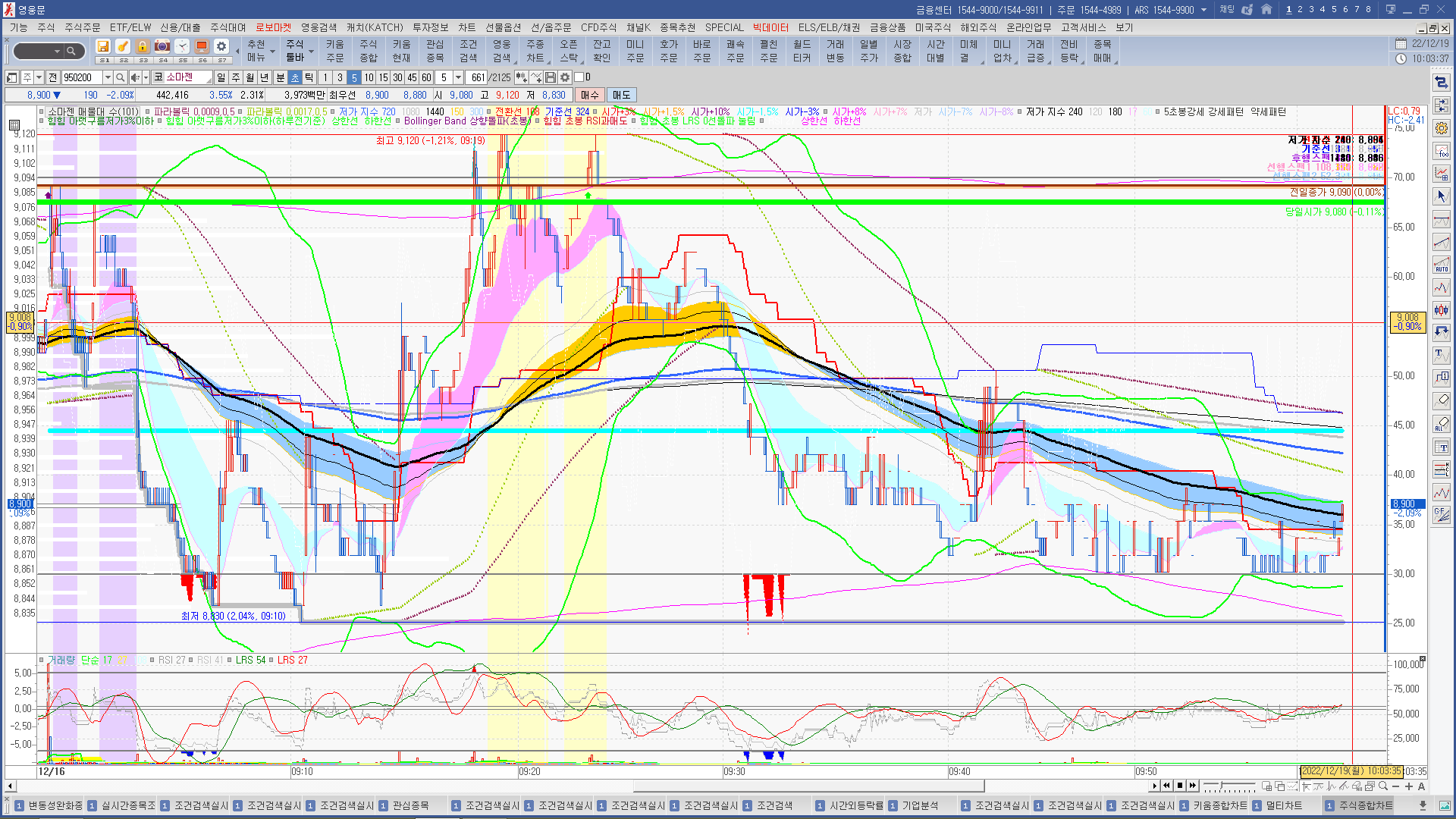 | 어제관심 검색기 9~11시 5초 차트(황갈색 수평막대 : 최대매물, 흰색 수평막대 : 매물) | ||