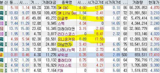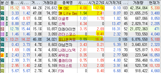 | 시가단타(1~3%) : SM C&C, SM Life Design, 이글루, 스맥, 미래아이앤지, 리더스코스메틱, 유니온커뮤니티, 아남전자, 나래나노텍, AP위성, 플래티어, 키이스트, FSN | ||