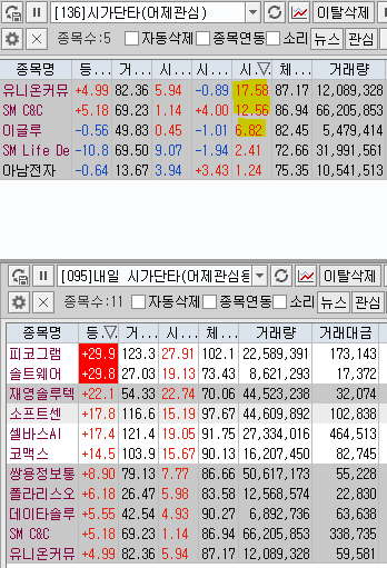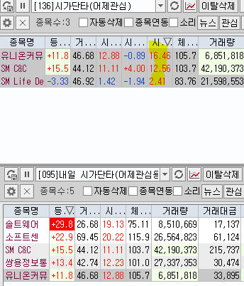 | 내일 시가단타(1~3%) : 피코그램, 솔트웨어, 재영솔루텍, 소프트센, 셀바스AI, 코맥스, 쌍용정보통신, 폴라리스오피스, 데이타솔루션, SM C&C, 유니온커뮤니티 | ||
