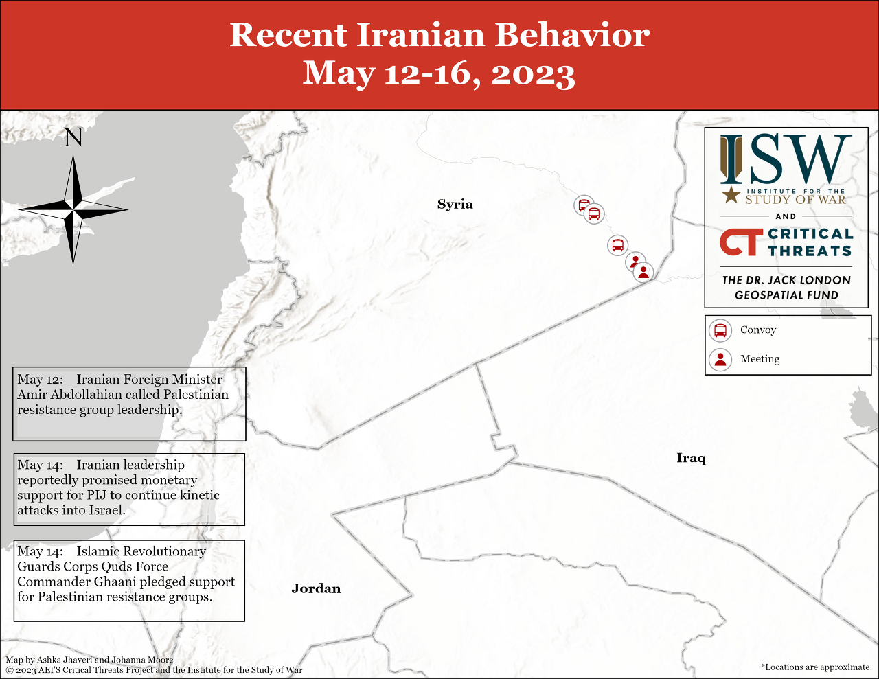 CTP는 이란 지도자들이 이스라엘과 팔레스타인 민병대 사이의 갈등을 조장하고 있으며, IRGC가 이스라엘의 차단 위험을 낮추고 군사 장비를 시리아로 이전할 수 있게 할 가능성이 있다고 평가합니다.[6] 5월 12일에서 5월 16일 사이에 데이르 에조르 주에서 이란이 활동한 것은 이란이 중요한 군사 장비를 이전하기 위해 이스라엘의 작전 중단 가능성을 이용하고 있음을 나타냅니다. Deir ez Zor 지방에 대한 이스라엘의 마지막 공습은 3월 22일이었습니다.[7] 쿠드스군 사령관은 3월 19일과 3월 22일 사이에 작전 보안을 논의하기 위해 Deir ez Zor 지방에서 마지막으로 만났습니다.[8]